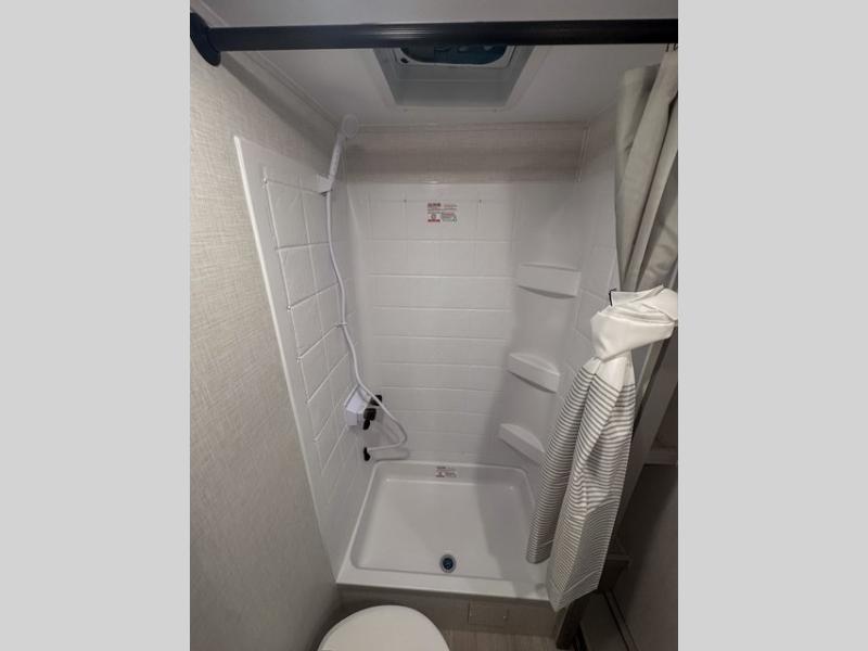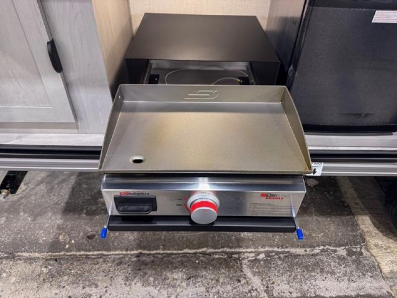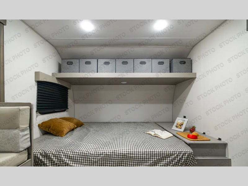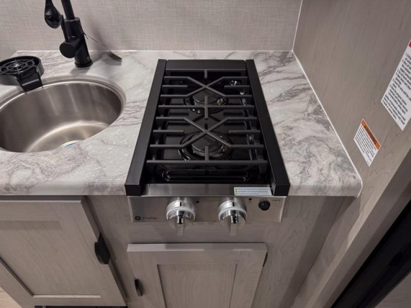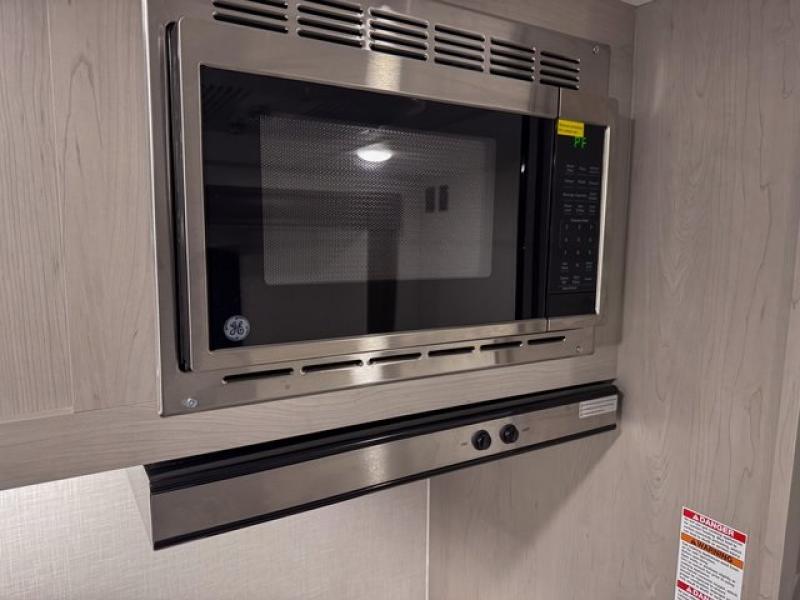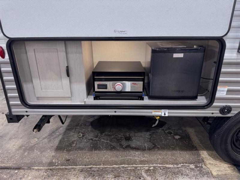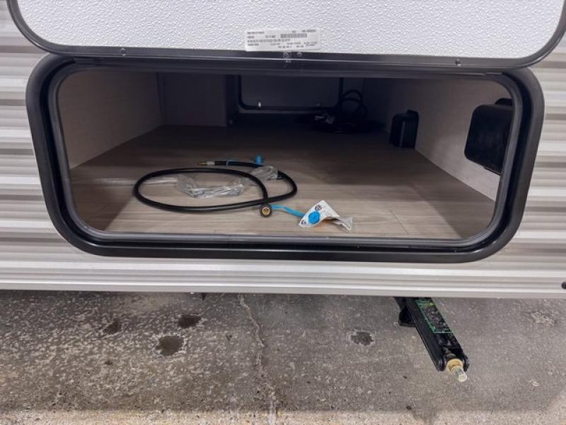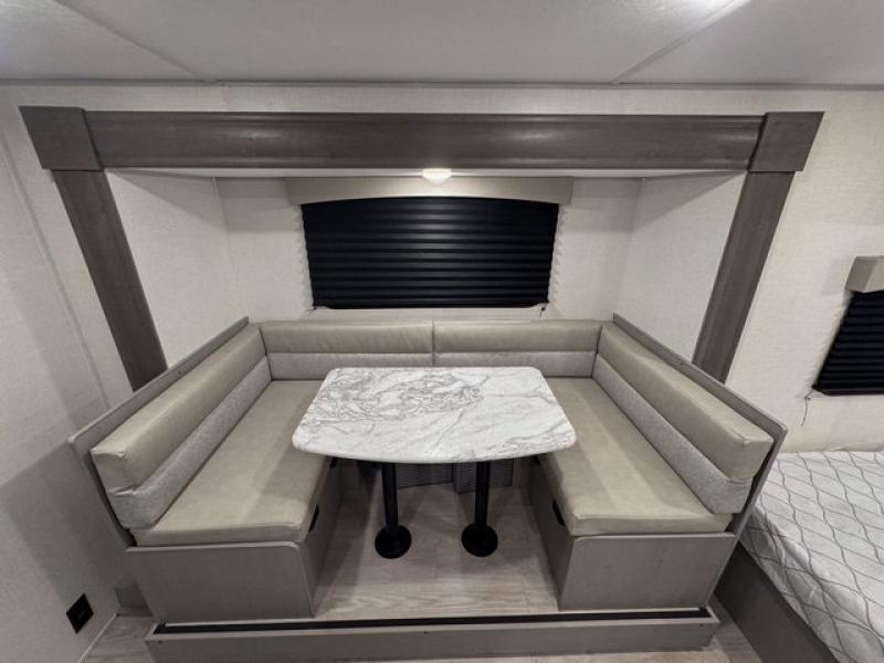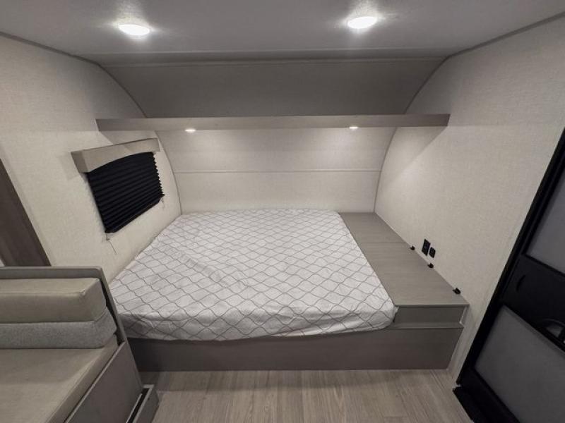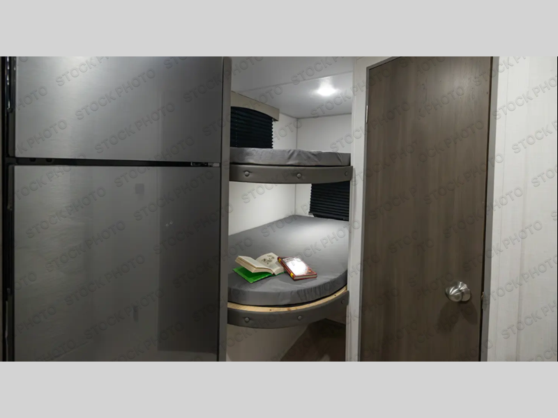 This trailer easily sleeps a family of eight and provides plenty of seating thanks to the queen bed behind the U-dinette. During the day, the U-dinette provides seating for the whole gang. Opposing to the slide/out you will find the kitchen area allowing you to easily whip up meals and snacks using the two-burner cooktop, sink, overhead microwave oven, and refrigerator. An overhead cabinet is also available for all of your dry goods. At the rear of this unit, you will find sleeping for four on the 42" x 72" bunks along the roadside corner, and a full bath with shower, toilet, and vanity with sink and linen cabinet along the curbside corner.