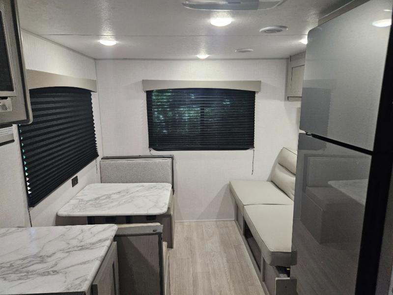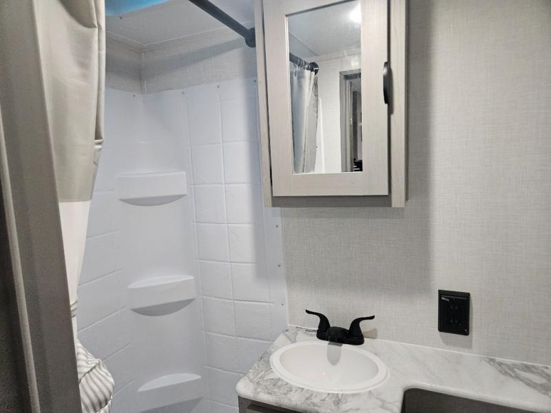 Enjoy the feeling of having your own bar thanks to the incredible bar stool and Large counter top that will allow you experience having a nice drink after a long day. Have a nice rest on the queen bed located in the front bedroom, which also has plenty of space due to its over head cabinet, dual wardrobes and private shelves besides the bed. Pamper yourself in the amazing full bath and after that have a relaxing time on the comfortable jack knife sofa.