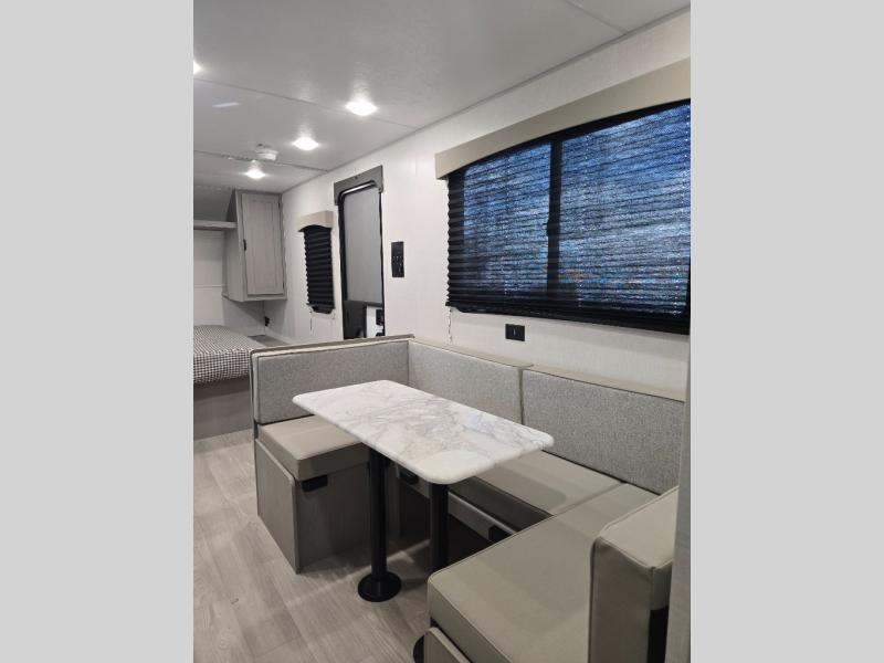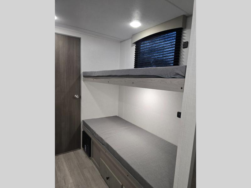 This travel trailer is perfect for a big crowd! Relax to the fullest on the queen bed located in the front bedroom, which also has plenty of space due to its over head cabinet, dual wardrobes and private shelves besides the bed. The quad bunk beds are ideal for kids to take a nap, also the U-shaped dinette is another option to use it as a makeshift bed. Take a long bath on the large rear bathroom, special to pamper yourself in the most comfortable way. This model also includes a 12V refrigerator to keep your food fresh, a 2-burner cooktop and a washer/dryer prep; all the comfort of home on the road!