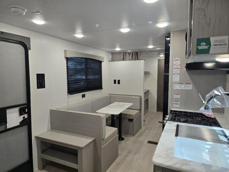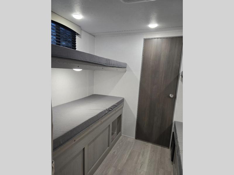 This travel trailer is perfect for a big crowd! Relax to the fullest on the queen bed located in the front bedroom, which also has plenty of space due to its over head cabinet, dual wardrobes and private shelves besides the bed. The quad bunk beds are ideal for kids to take a nap, also the U-shaped dinette is another option to use it as a makeshift bed. Take a long bath on the large rear bathroom, special to pamper yourself in the most comfortable way. This model also includes a 12V refrigerator to keep your food fresh, a 2-burner cooktop and a washer/dryer prep; all the comfort of home on the road!