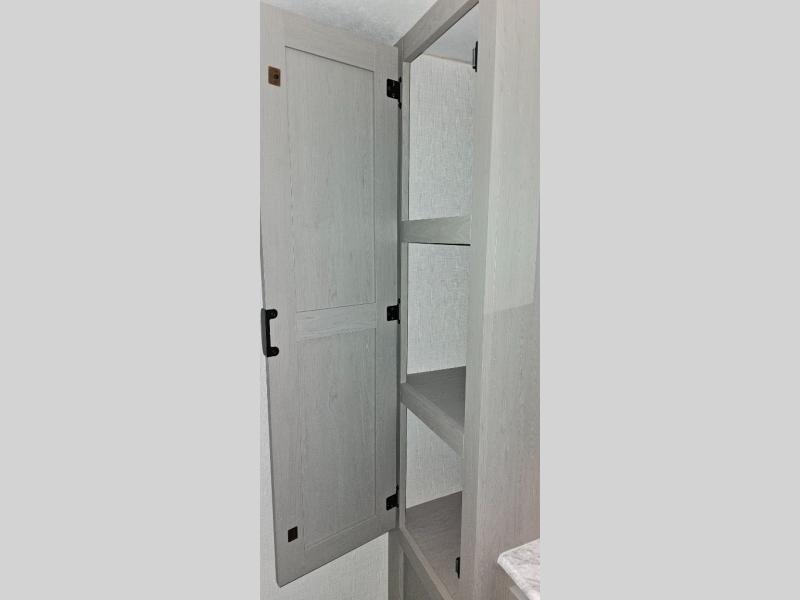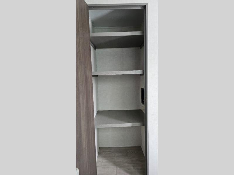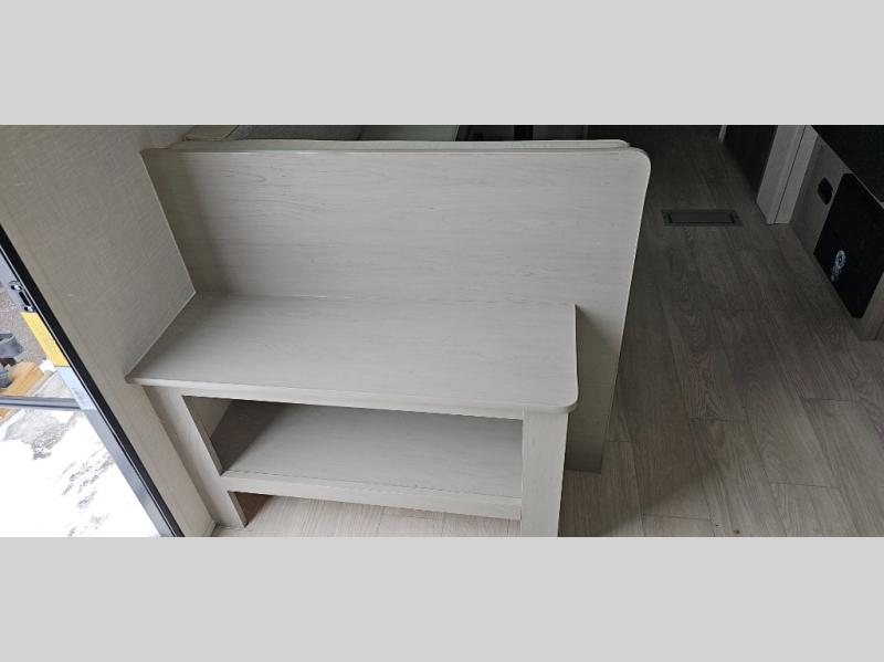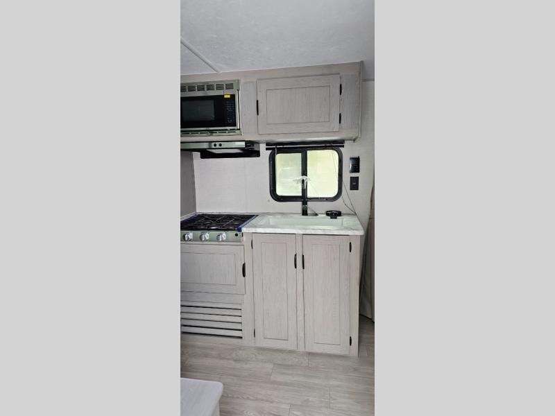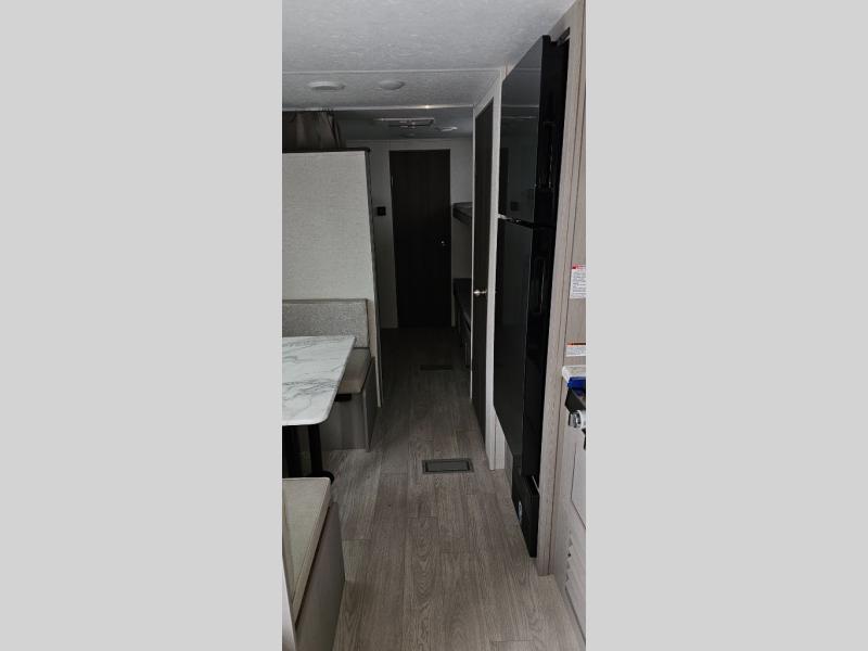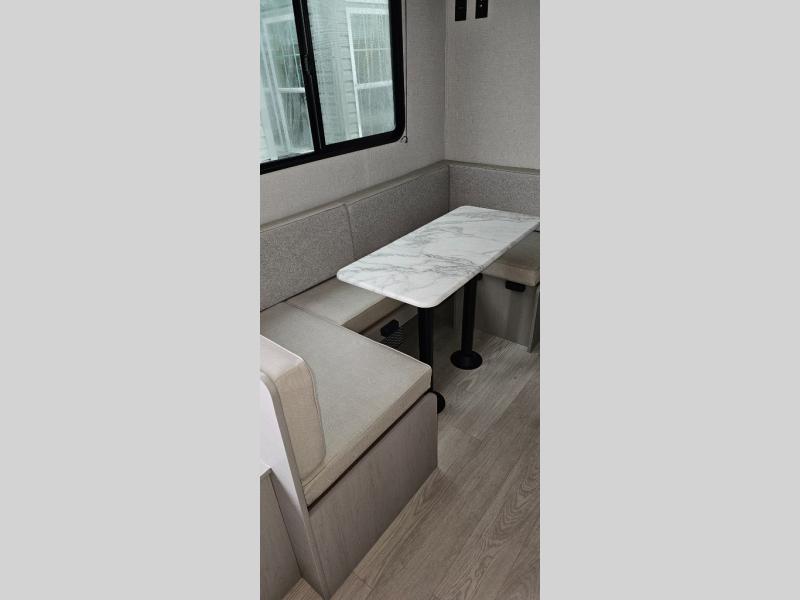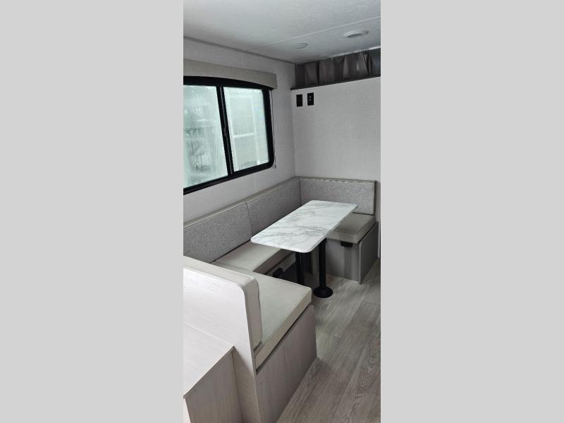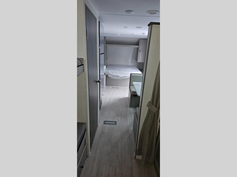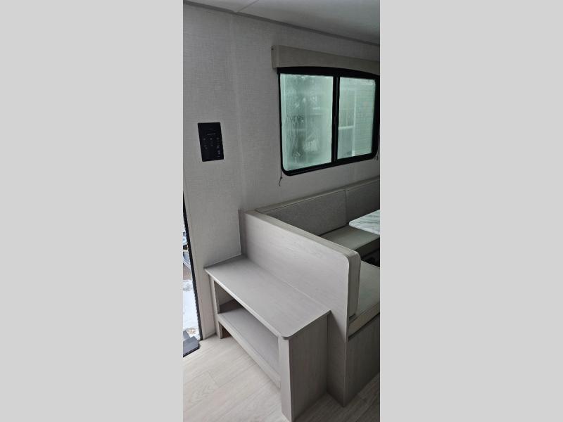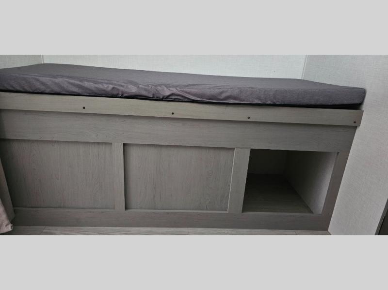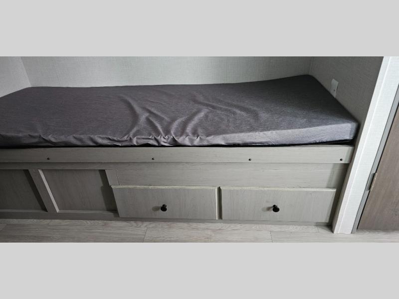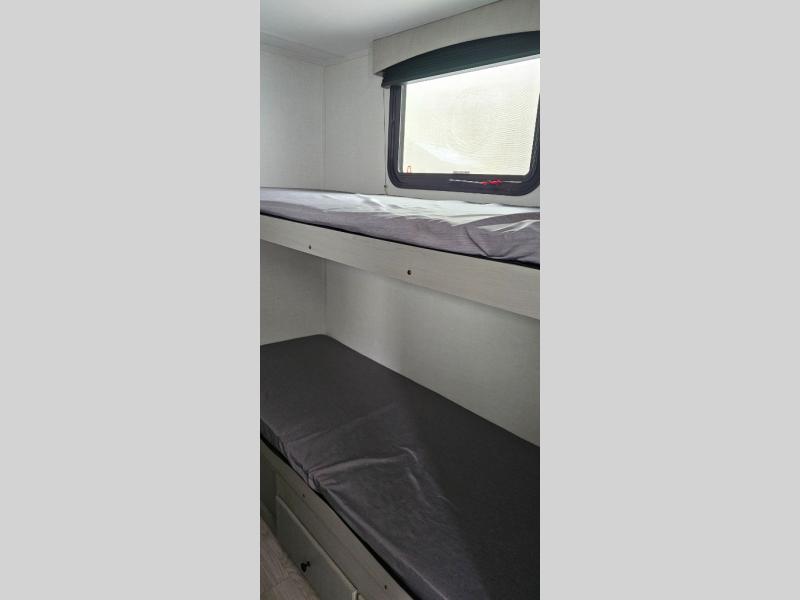 This travel trailer is perfect for a big crowd! Relax to the fullest on the queen bed located in the front bedroom, which also has plenty of space due to its over head cabinet, dual wardrobes and private shelves besides the bed. The quad bunk beds are ideal for kids to take a nap, also the U-shaped dinette is another option to use it as a makeshift bed. Take a long bath on the large rear bathroom, special to pamper yourself in the most comfortable way. This model also includes a 12V refrigerator to keep your food fresh, a 2-burner cooktop and a washer/dryer prep; all the comfort of home on the road!