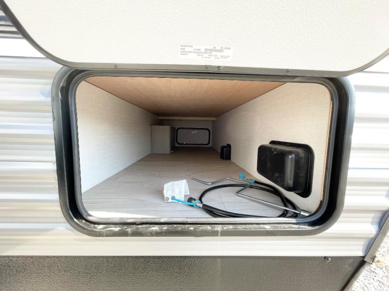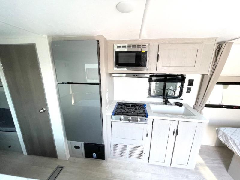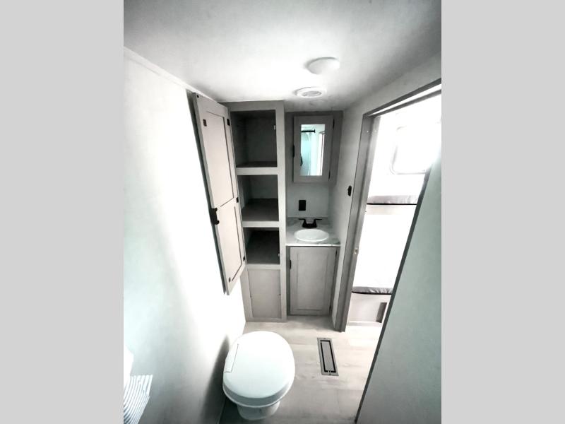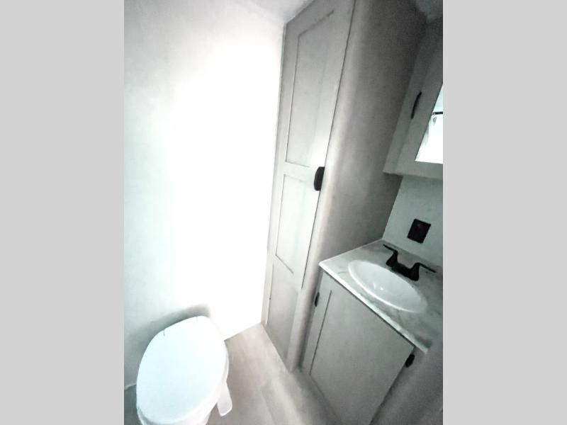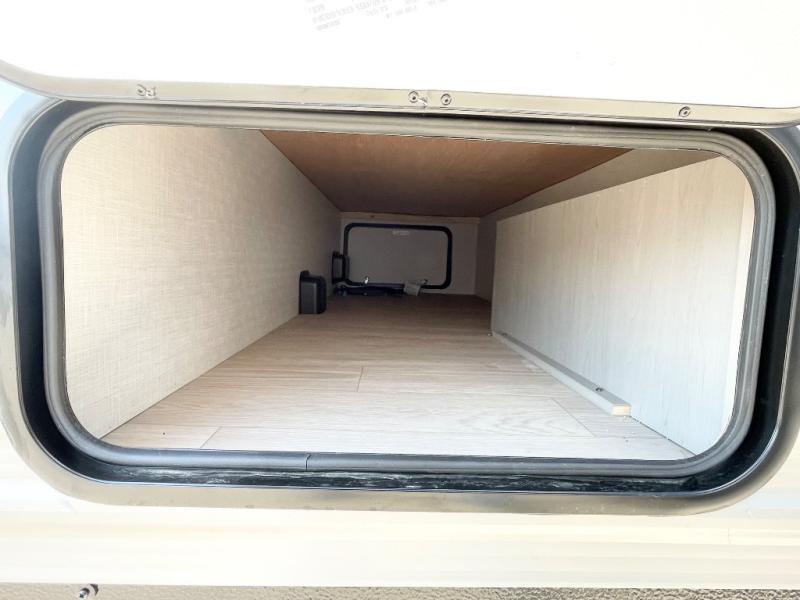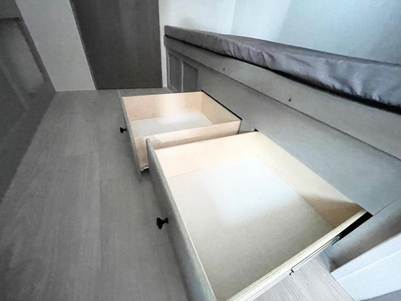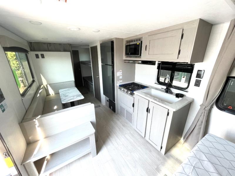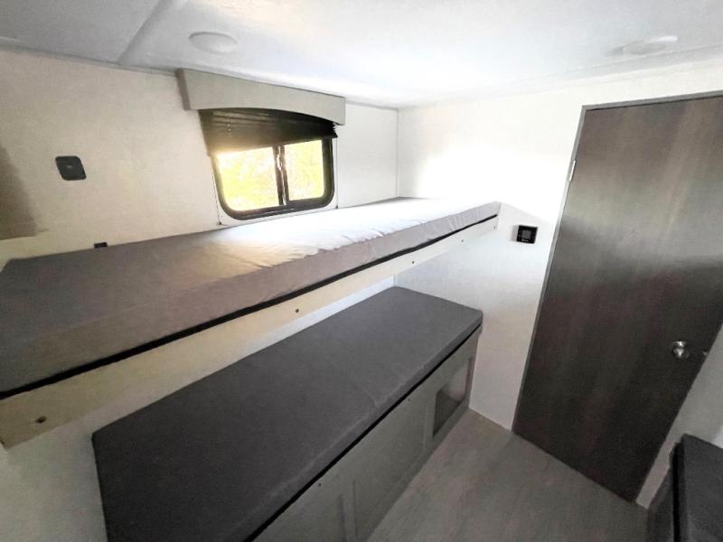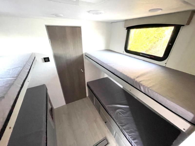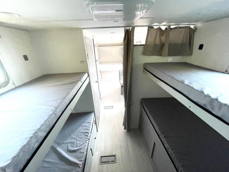 This travel trailer is perfect for a big crowd! Relax to the fullest on the queen bed located in the front bedroom, which also has plenty of space due to its over head cabinet, dual wardrobes besides the bed. The quad bunk beds are ideal for kids to take a nap, also the U-shaped dinette is another option to use it as a makeshift bed. Take a long bath on the large rear bathroom, special to pamper yourself in the most comfortable way. This model also includes a 12V refrigerator to keep your food fresh, a 3-burner cooktop and a washer/dryer prep; all the comfort of home on the road!