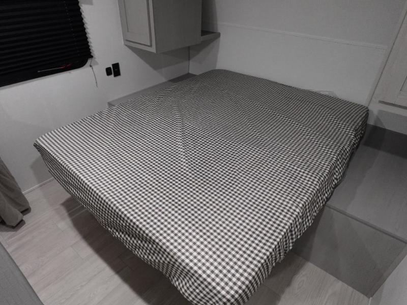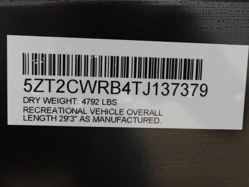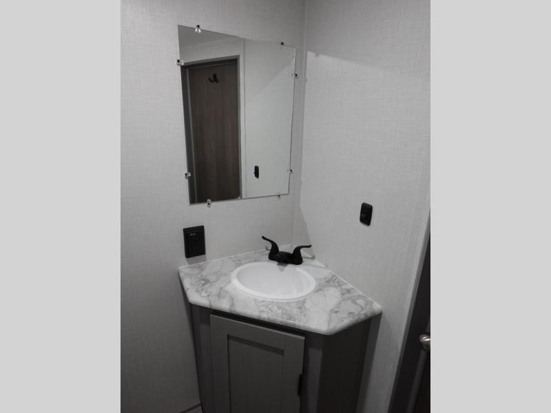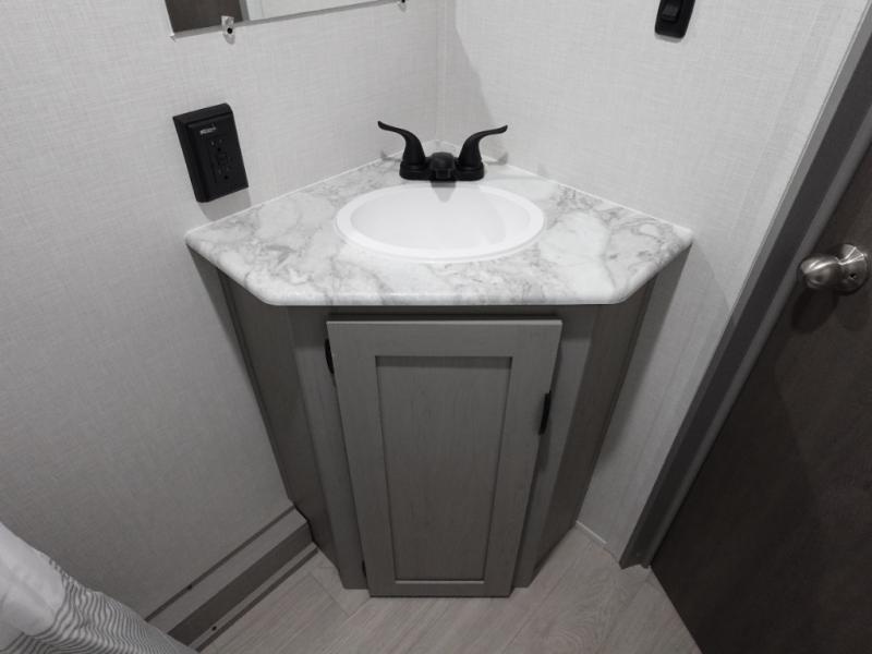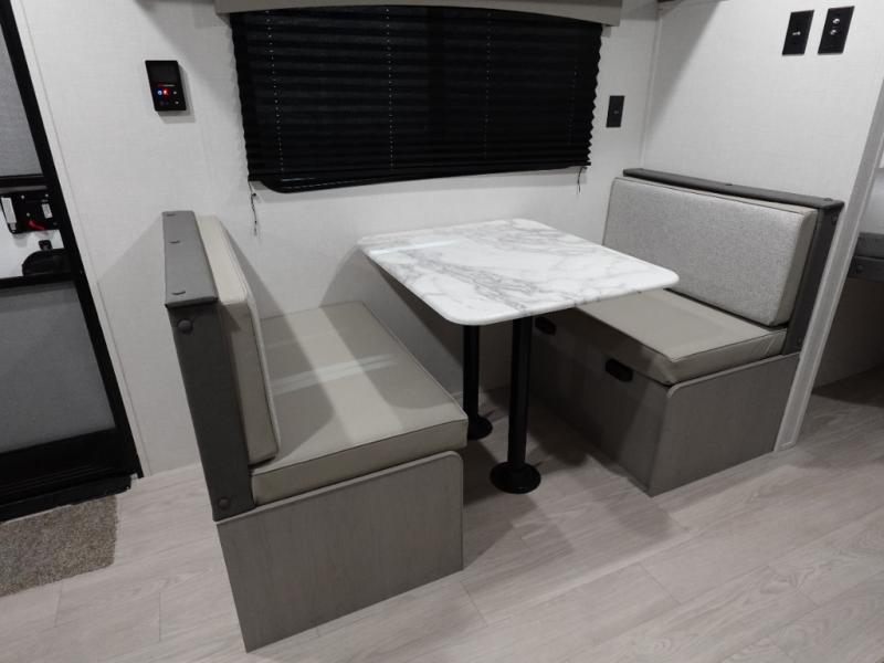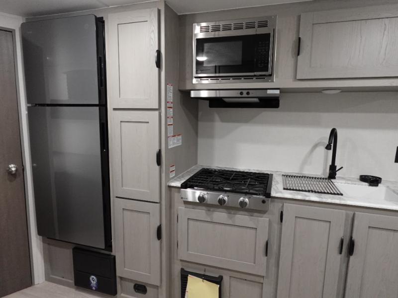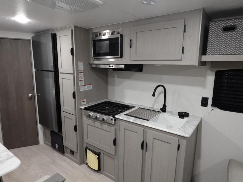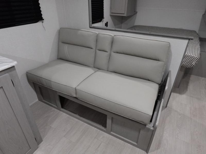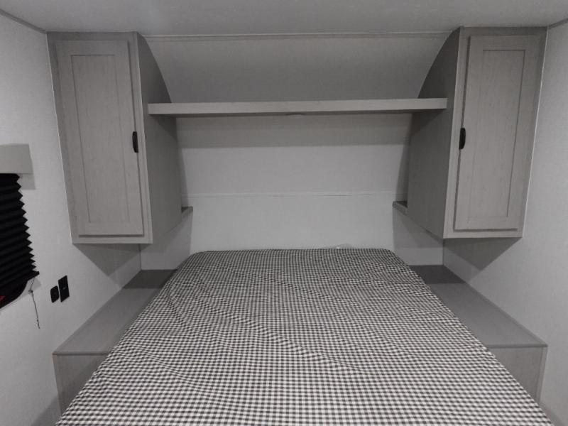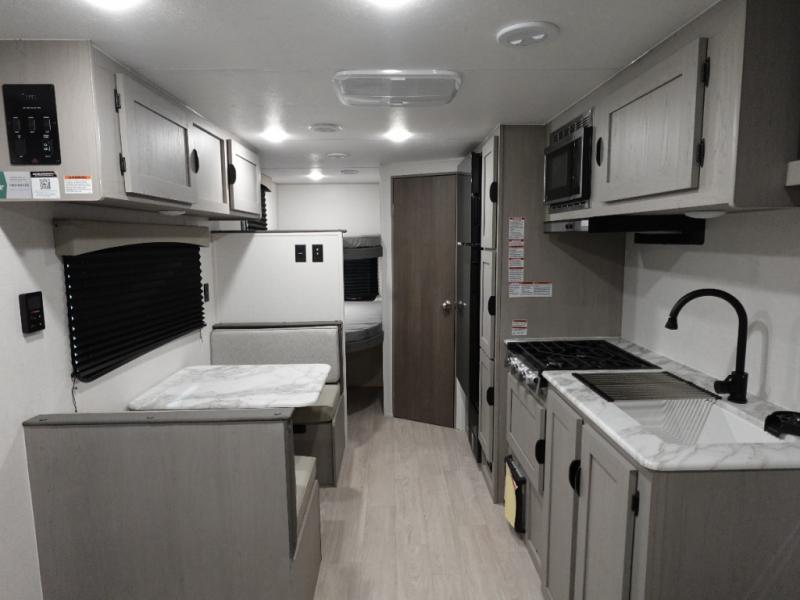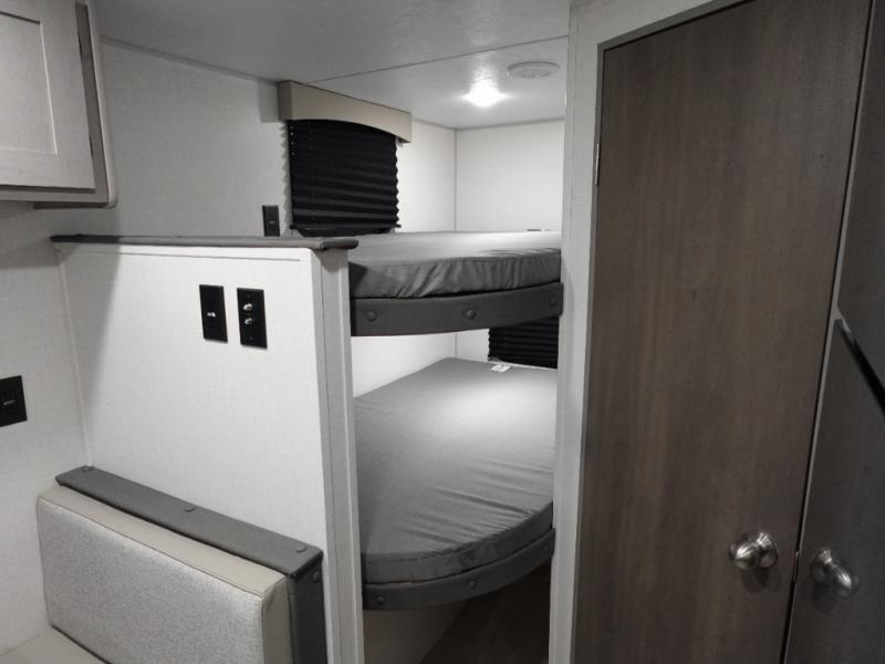 Bring the whole family with you in this travel trailer! The kiddos can sleep on the rear corner set of double-size bunks. The opposite rear corner features a full bath including a 24" x 36" shower, linen cabinet, toilet, and vanity with a medicine cabinet overhead. In the main living space you will find plenty of seating with a booth dinette and jackknife sofa which can also transform into an extra sleeping space if needed. Everyone's bellies will stay full with the two burner cooktop, 12-volt refrigerator, and microwave which you can use to pop a bag of popcorn for movie night. You will enjoy the front bedroom for a bit of privacy including a queen bed and large overhead cabinet for your things. On the outside, a large front pass-through for lawn chairs and camp gear. There is more storage beneath the double bed bunks in back and a nice 10' awning to provide protection from the elements when outdoors.