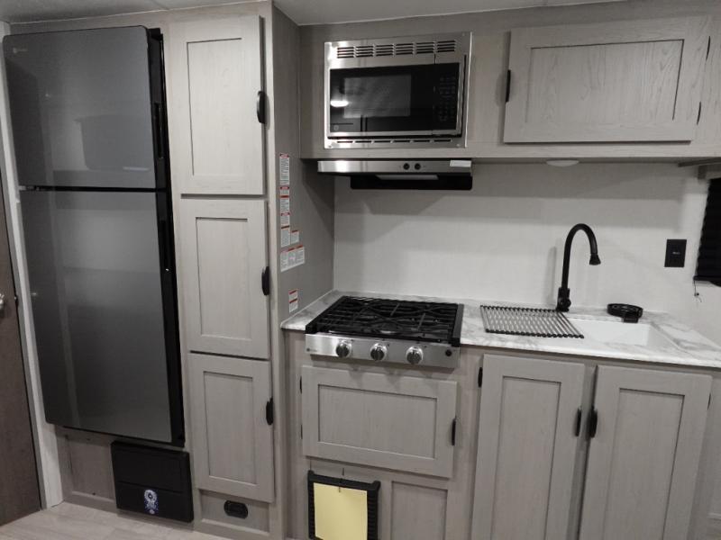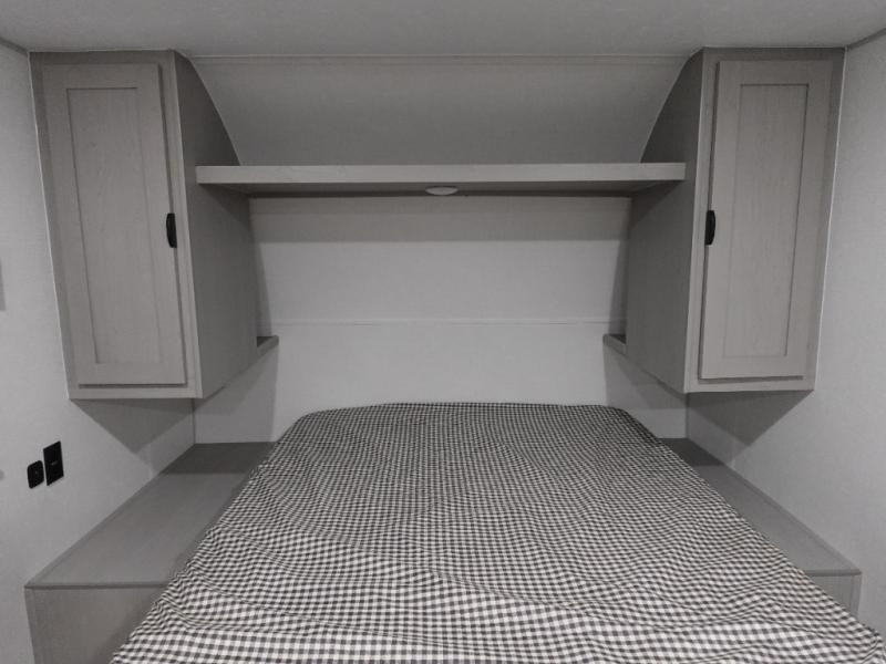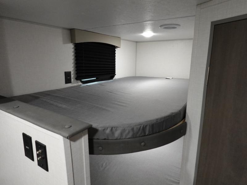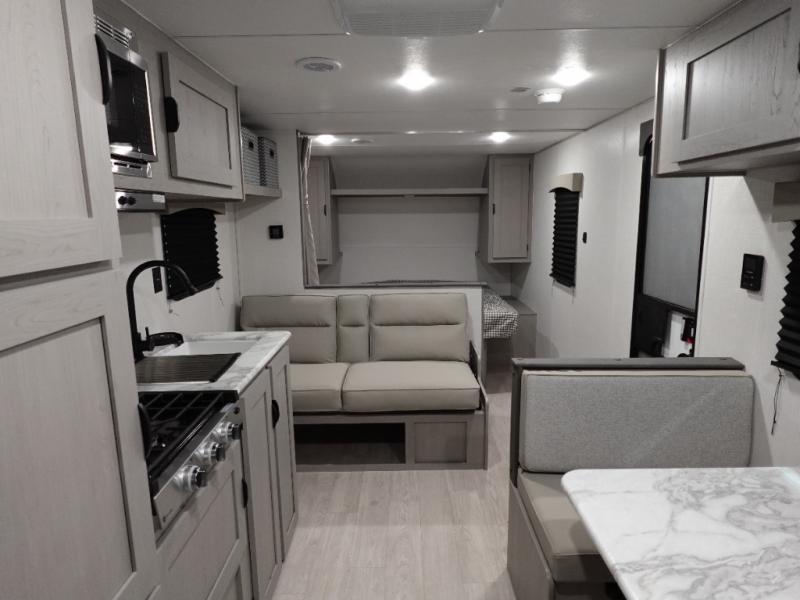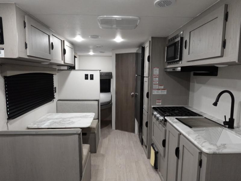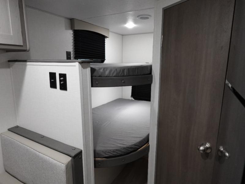 Bring the whole family with you in this travel trailer! The kiddos can sleep on the rear corner set of double-size bunks. The opposite rear corner features a full bath including a 24" x 36" shower, linen cabinet, toilet, and vanity with a medicine cabinet overhead. In the main living space you will find plenty of seating with a booth dinette and jackknife sofa which can also transform into an extra sleeping space if needed. Everyone's bellies will stay full with the two burner cooktop, 12-volt refrigerator, and microwave which you can use to pop a bag of popcorn for movie night. You will enjoy the front bedroom for a bit of privacy including a queen bed and large overhead cabinet for your things. On the outside, a large front pass-through for lawn chairs and camp gear. There is more storage beneath the double bed bunks in back and a nice 10' awning to provide protection from the elements when outdoors.