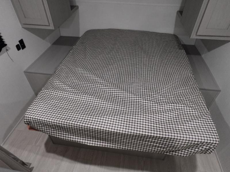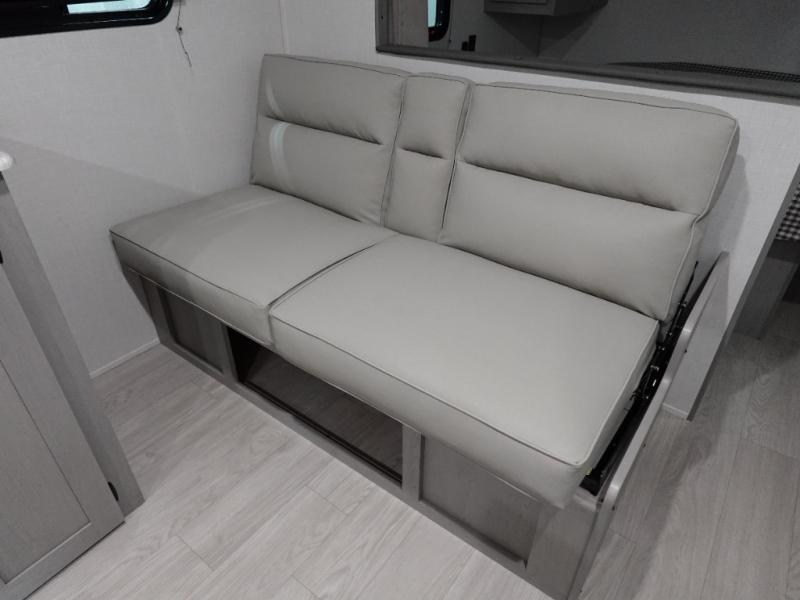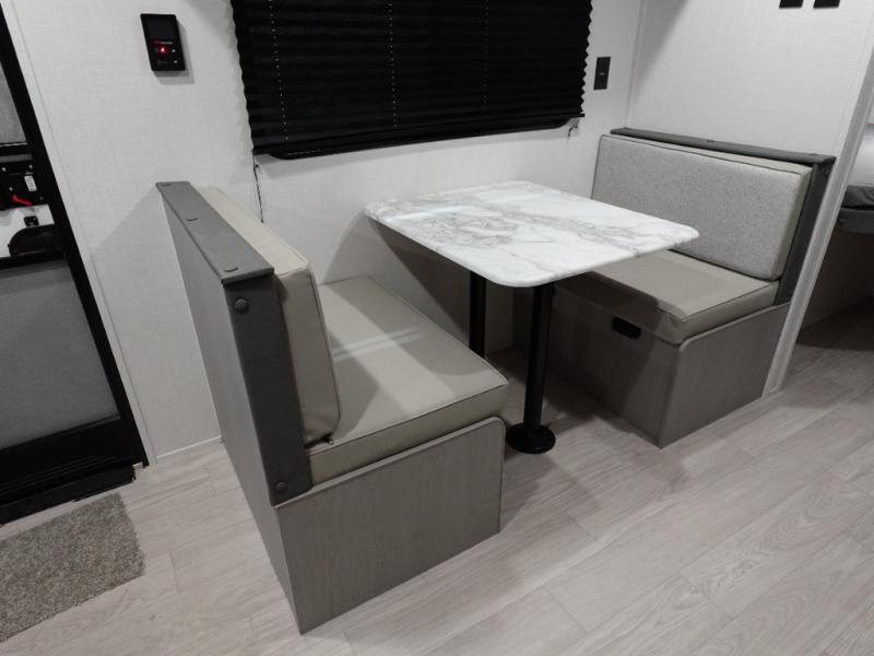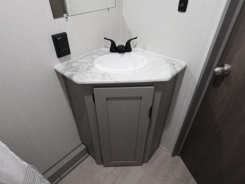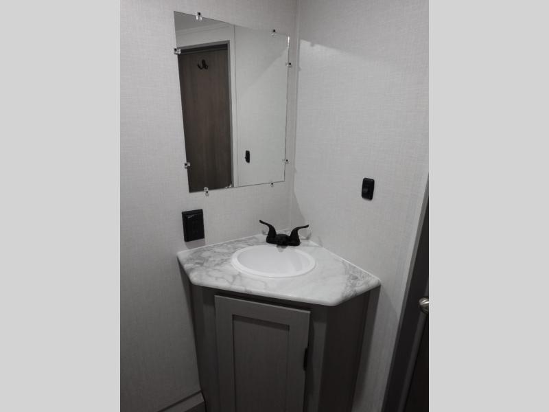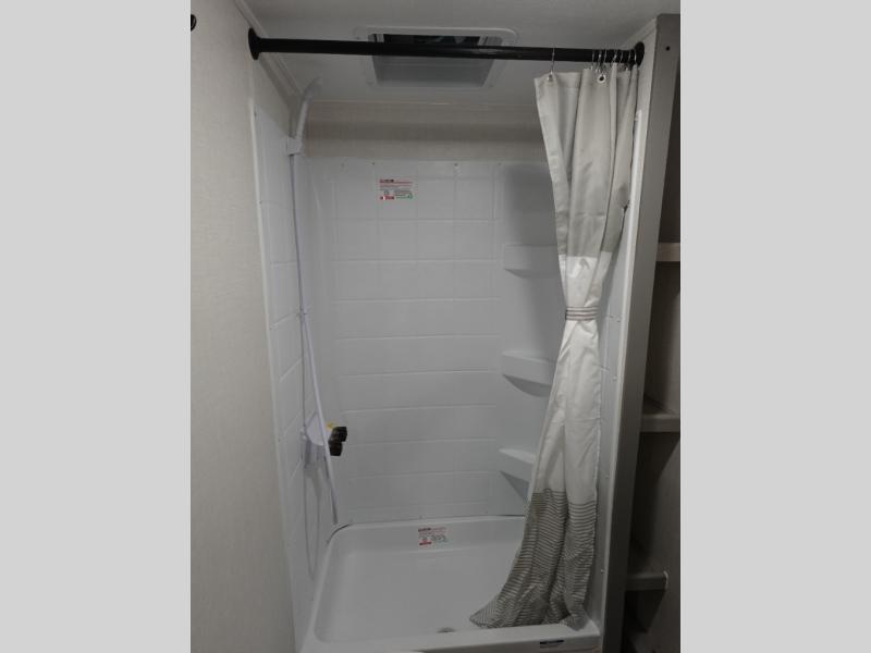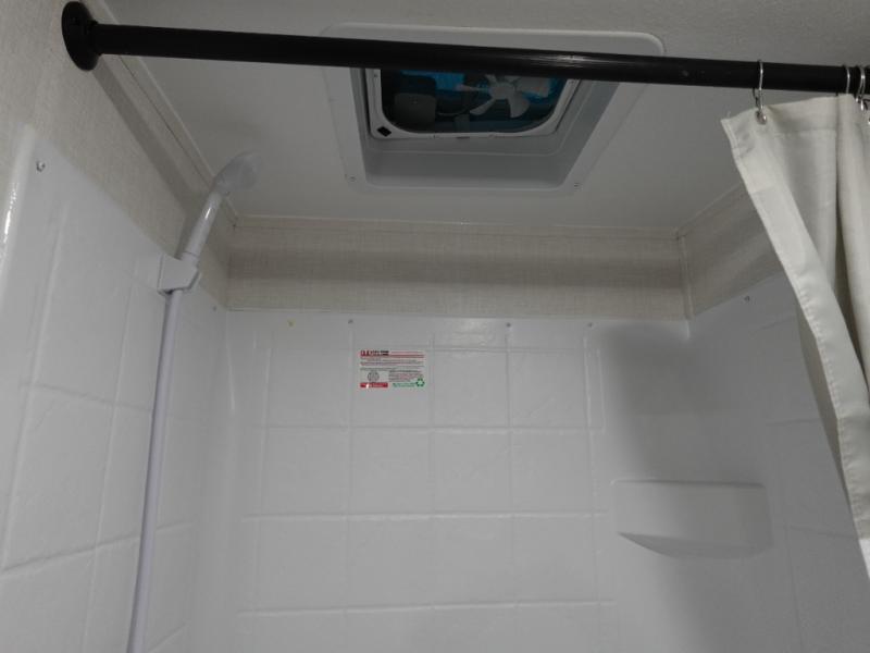 Bring the whole family with you in this travel trailer! The kiddos can sleep on the rear corner set of double-size bunks. The opposite rear corner features a full bath including a 24" x 36" shower, linen cabinet, toilet, and vanity with a medicine cabinet overhead. In the main living space you will find plenty of seating with a booth dinette and jackknife sofa which can also transform into an extra sleeping space if needed. Everyone's bellies will stay full with the two burner cooktop, 12-volt refrigerator, and microwave which you can use to pop a bag of popcorn for movie night. You will enjoy the front bedroom for a bit of privacy including a queen bed and large overhead cabinet for your things. On the outside, a large front pass-through for lawn chairs and camp gear. There is more storage beneath the double bed bunks in back and a nice 10' awning to provide protection from the elements when outdoors.