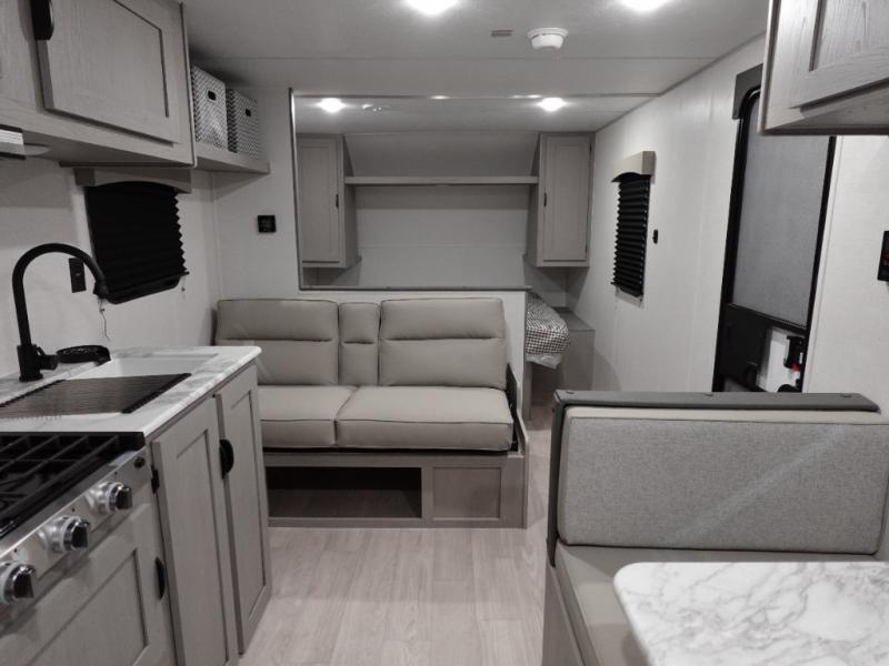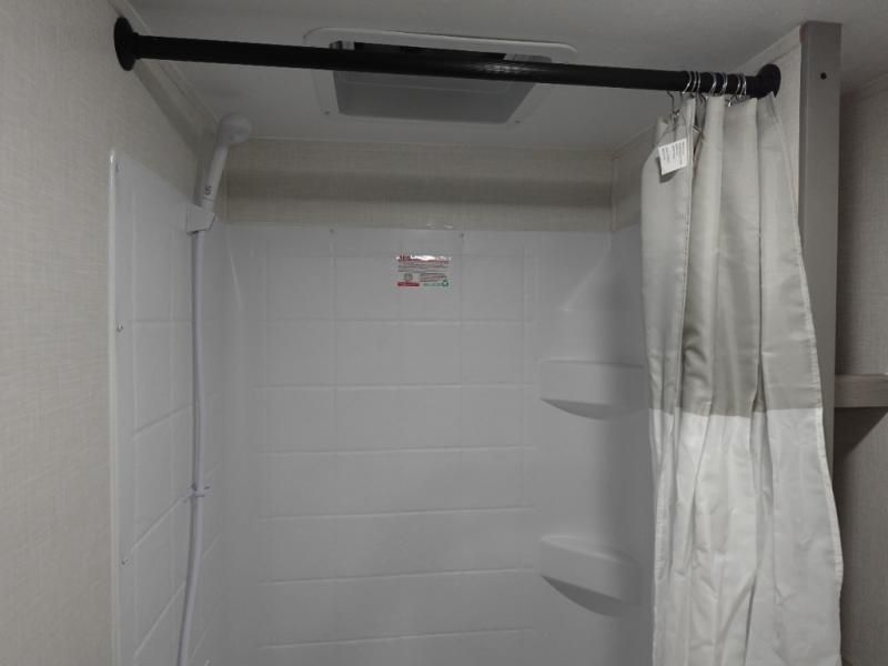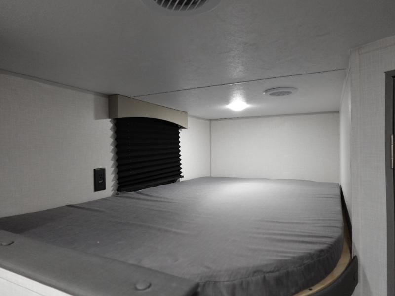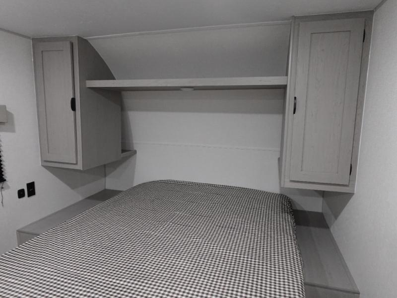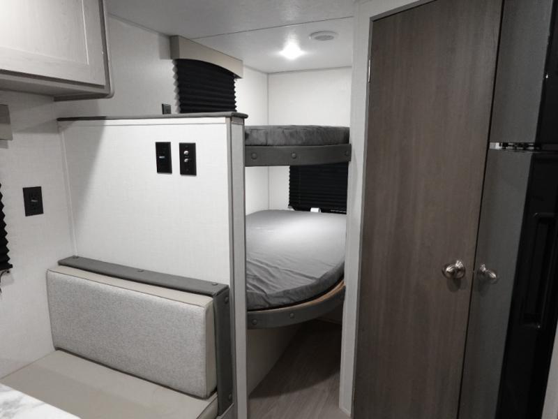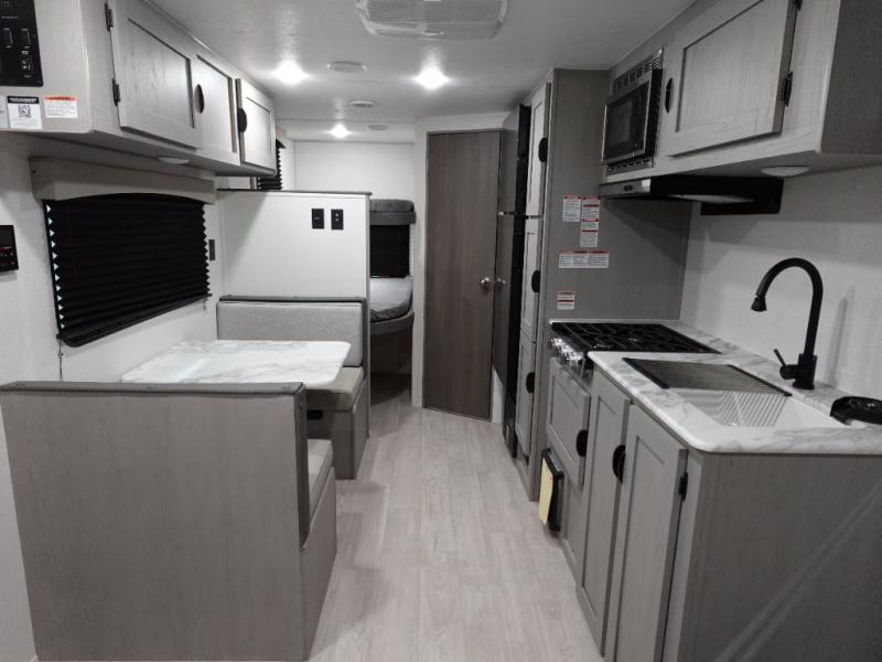 Bring the whole family with you in this travel trailer! The kiddos can sleep on the rear corner set of double-size bunks. The opposite rear corner features a full bath including a 24" x 36" shower, linen cabinet, toilet, and vanity with a medicine cabinet overhead. In the main living space you will find plenty of seating with a booth dinette and jackknife sofa which can also transform into an extra sleeping space if needed. Everyone's bellies will stay full with the two burner cooktop, 12-volt refrigerator, and microwave which you can use to pop a bag of popcorn for movie night. You will enjoy the front bedroom for a bit of privacy including a queen bed and large overhead cabinet for your things. On the outside, a large front pass-through for lawn chairs and camp gear. There is more storage beneath the double bed bunks in back and a nice 10' awning to provide protection from the elements when outdoors.