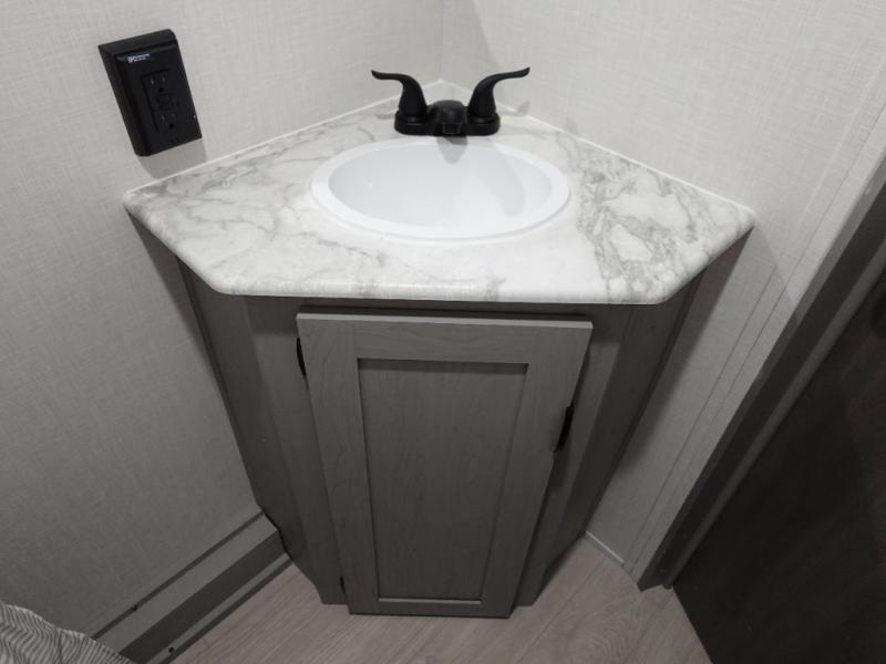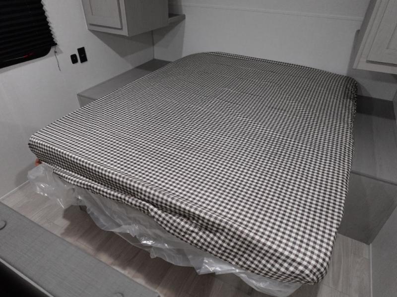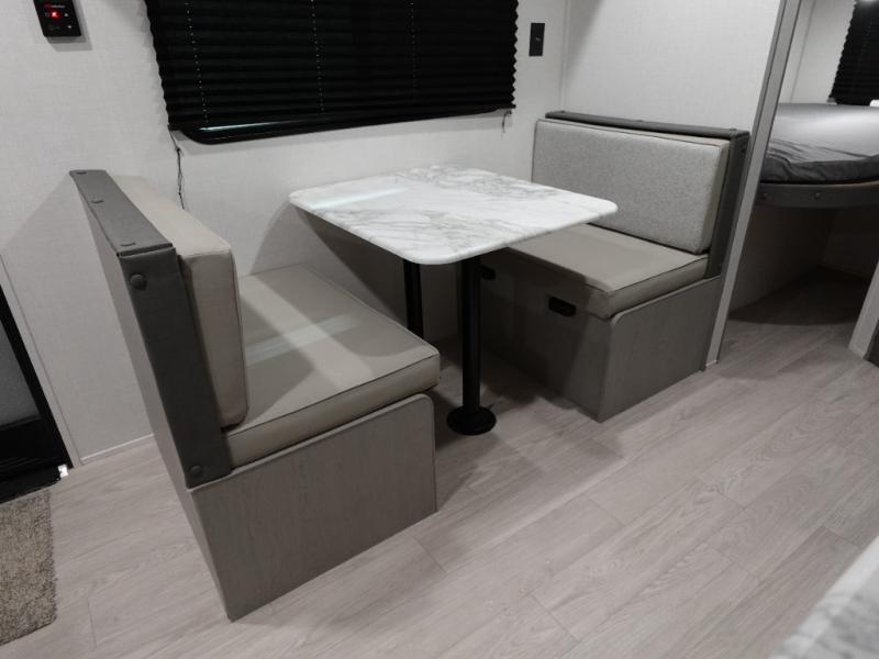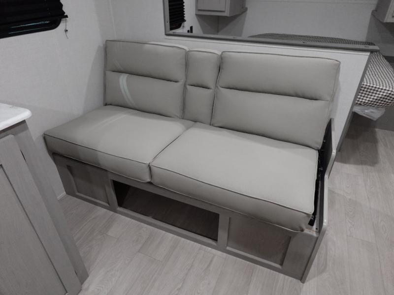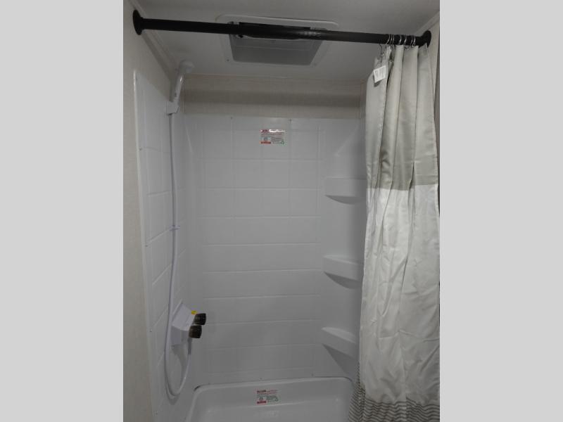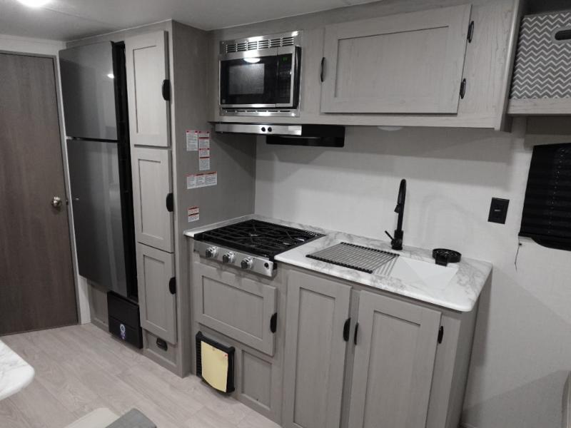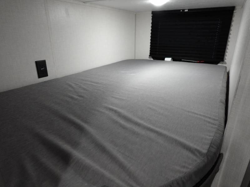 Bring the whole family with you in this travel trailer! The kiddos can sleep on the rear corner set of double-size bunks. The opposite rear corner features a full bath including a 24" x 36" shower, linen cabinet, toilet, and vanity with a medicine cabinet overhead. In the main living space you will find plenty of seating with a booth dinette and jackknife sofa which can also transform into an extra sleeping space if needed. Everyone's bellies will stay full with the two burner cooktop, 12-volt refrigerator, and microwave which you can use to pop a bag of popcorn for movie night. You will enjoy the front bedroom for a bit of privacy including a queen bed and large overhead cabinet for your things. On the outside, a large front pass-through for lawn chairs and camp gear. There is more storage beneath the double bed bunks in back and a nice 10' awning to provide protection from the elements when outdoors.