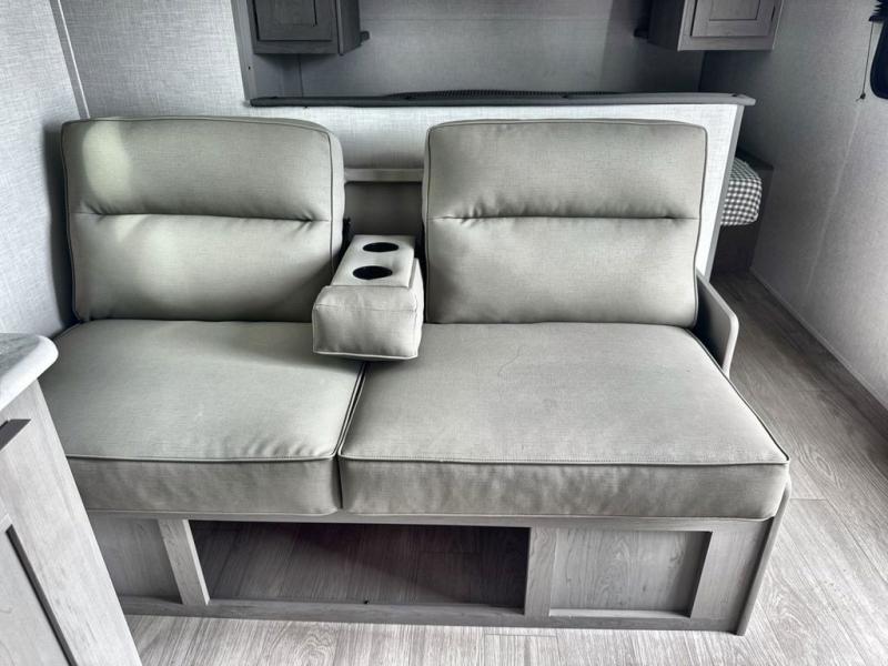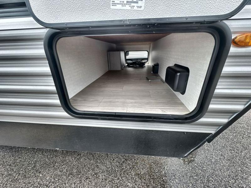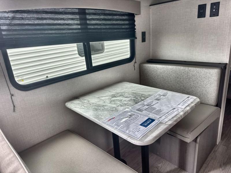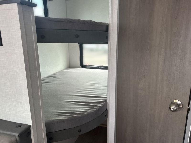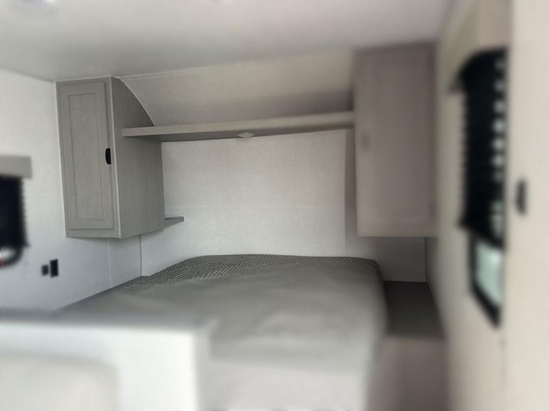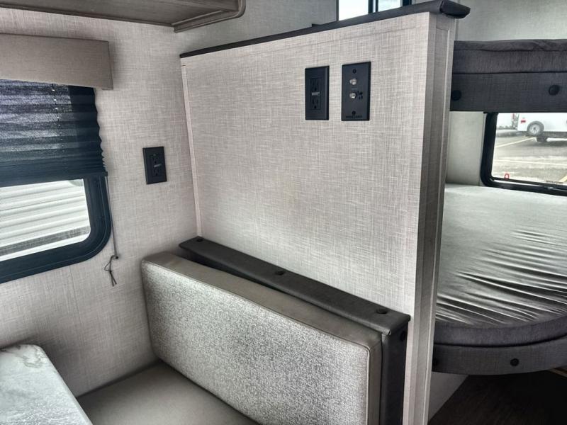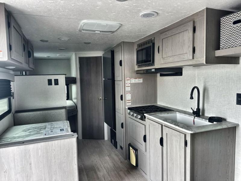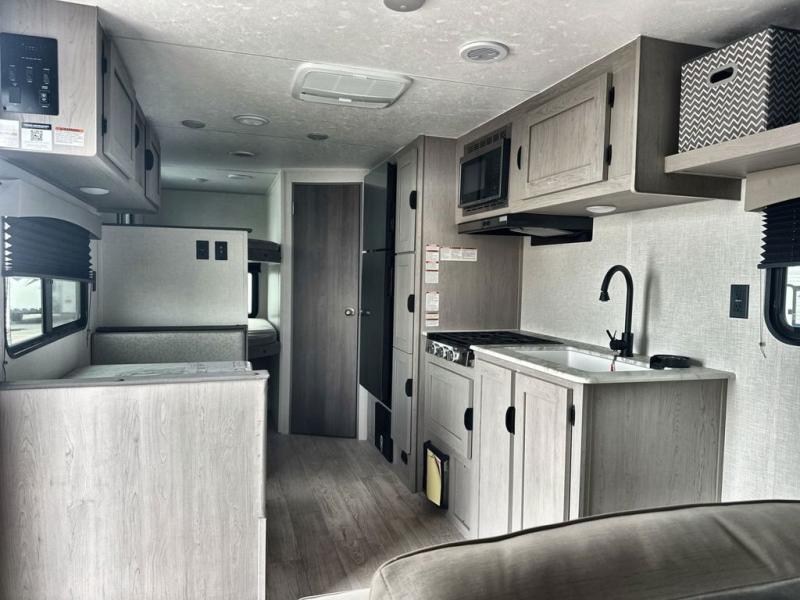 Bring the whole family with you in this travel trailer! The kiddos can sleep on the rear corner set of double-size bunks. The opposite rear corner features a full bath including a 24" x 36" shower, linen cabinet, toilet, and vanity with a medicine cabinet overhead. In the main living space you will find plenty of seating with a booth dinette and jackknife sofa which can also transform into an extra sleeping space if needed. Everyone's bellies will stay full with the two burner cooktop, 12-volt refrigerator, and microwave which you can use to pop a bag of popcorn for movie night. You will enjoy the front bedroom for a bit of privacy including a queen bed and large overhead cabinet for your things. On the outside, a large front pass-through for lawn chairs and camp gear. There is more storage beneath the double bed bunks in back and a nice 10' awning to provide protection from the elements when outdoors.