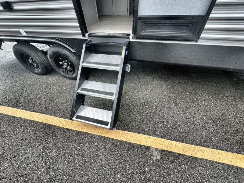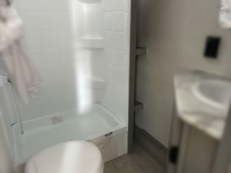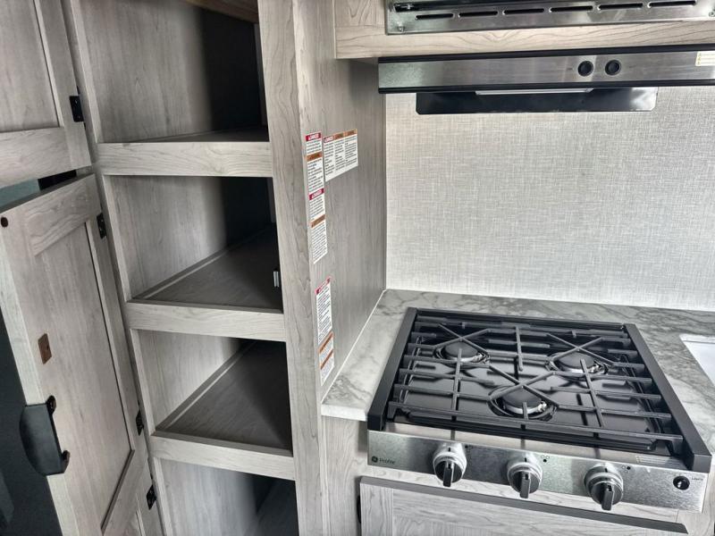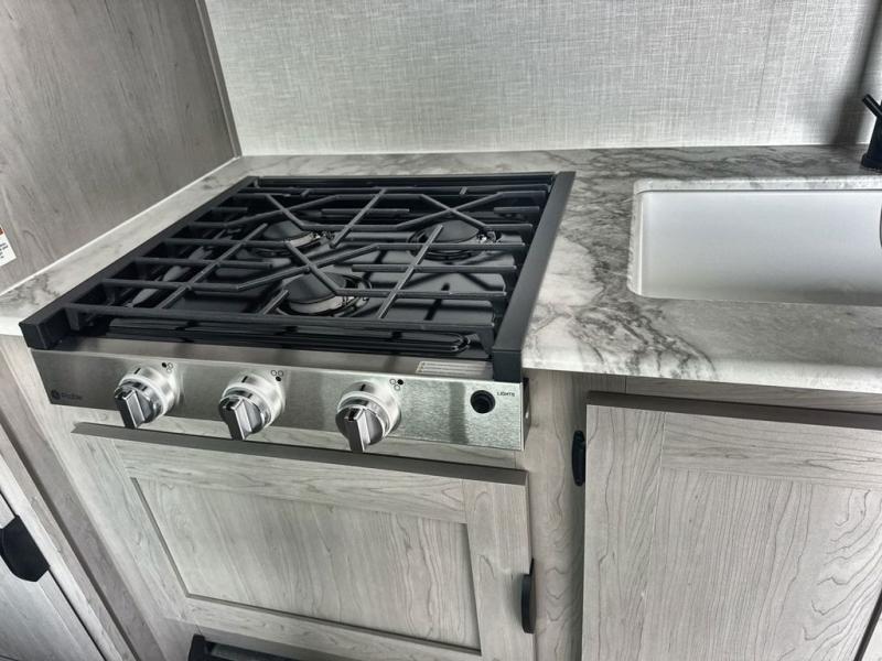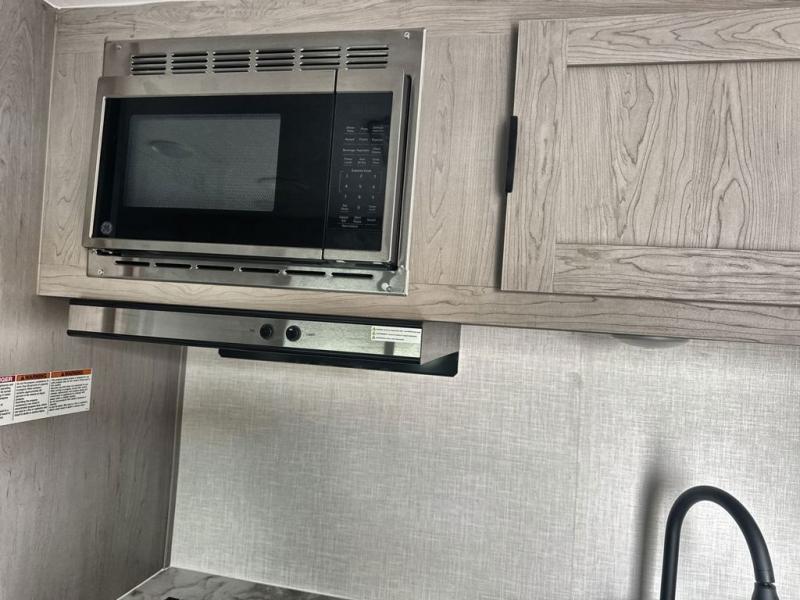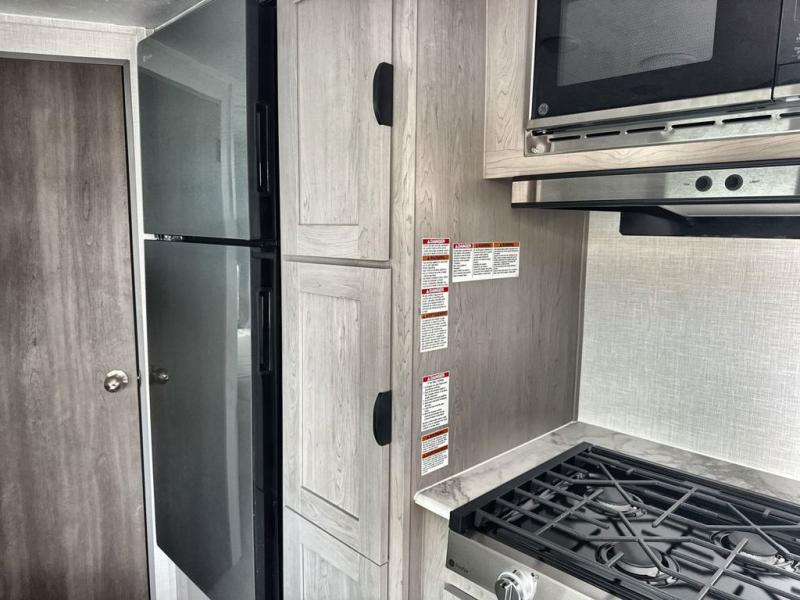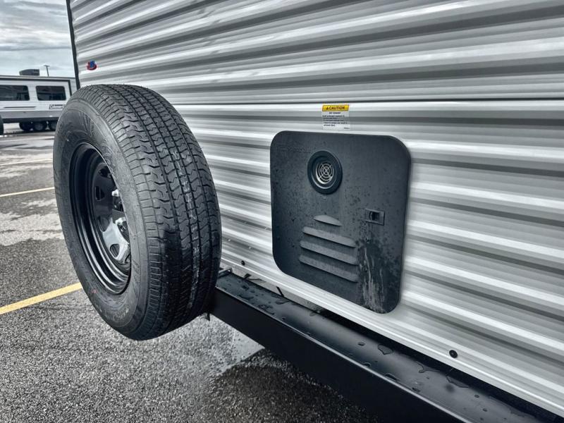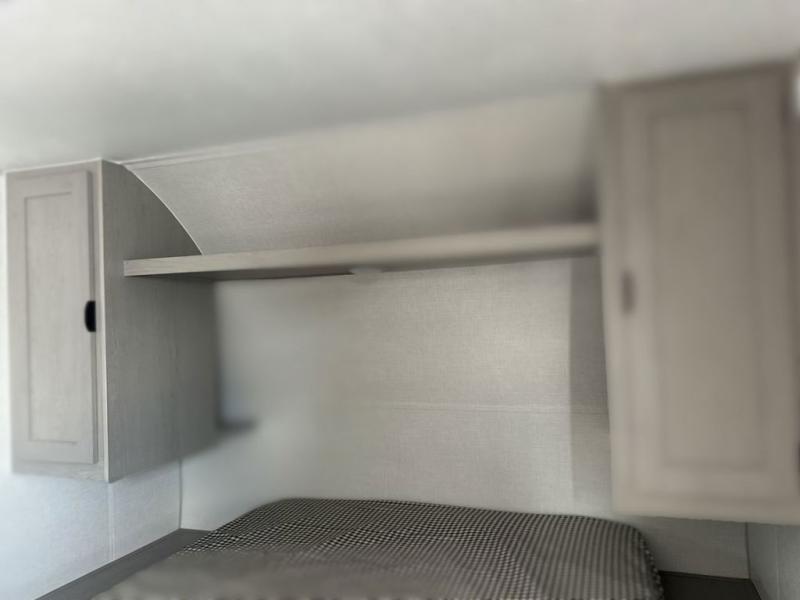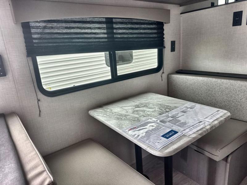 Bring the whole family with you in this travel trailer! The kiddos can sleep on the rear corner set of double-size bunks. The opposite rear corner features a full bath including a 24" x 36" shower, linen cabinet, toilet, and vanity with a medicine cabinet overhead. In the main living space you will find plenty of seating with a booth dinette and jackknife sofa which can also transform into an extra sleeping space if needed. Everyone's bellies will stay full with the two burner cooktop, 12-volt refrigerator, and microwave which you can use to pop a bag of popcorn for movie night. You will enjoy the front bedroom for a bit of privacy including a queen bed and large overhead cabinet for your things. On the outside, a large front pass-through for lawn chairs and camp gear. There is more storage beneath the double bed bunks in back and a nice 10' awning to provide protection from the elements when outdoors.