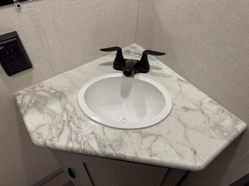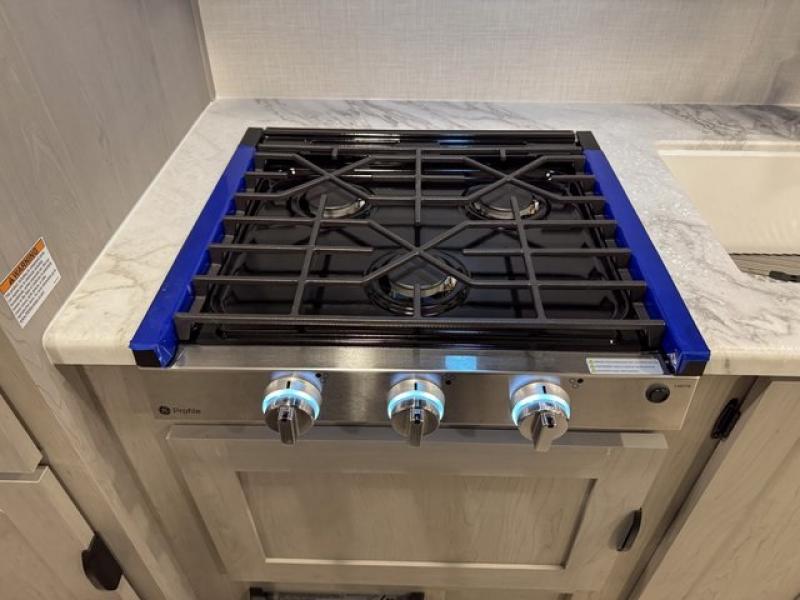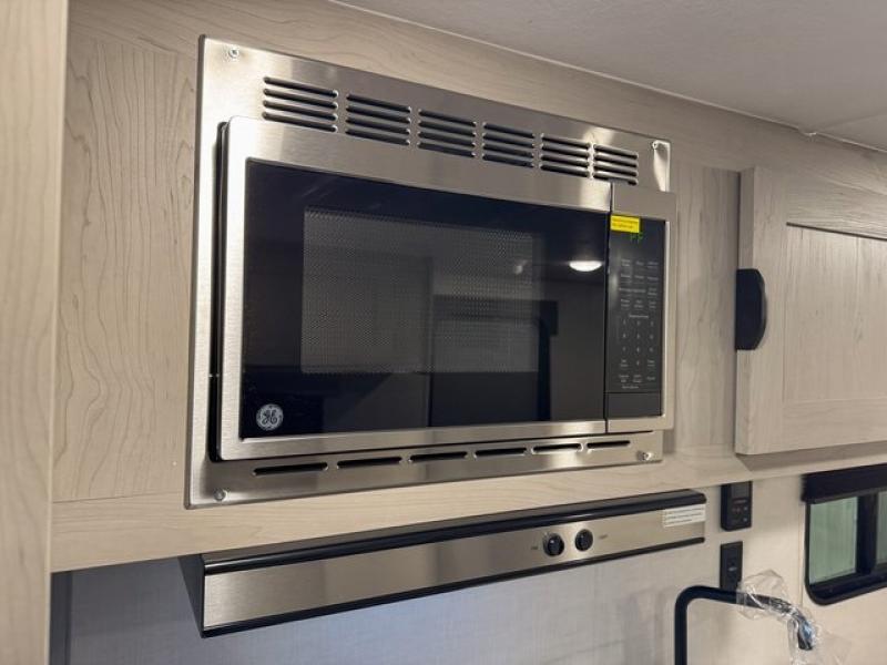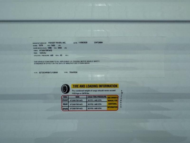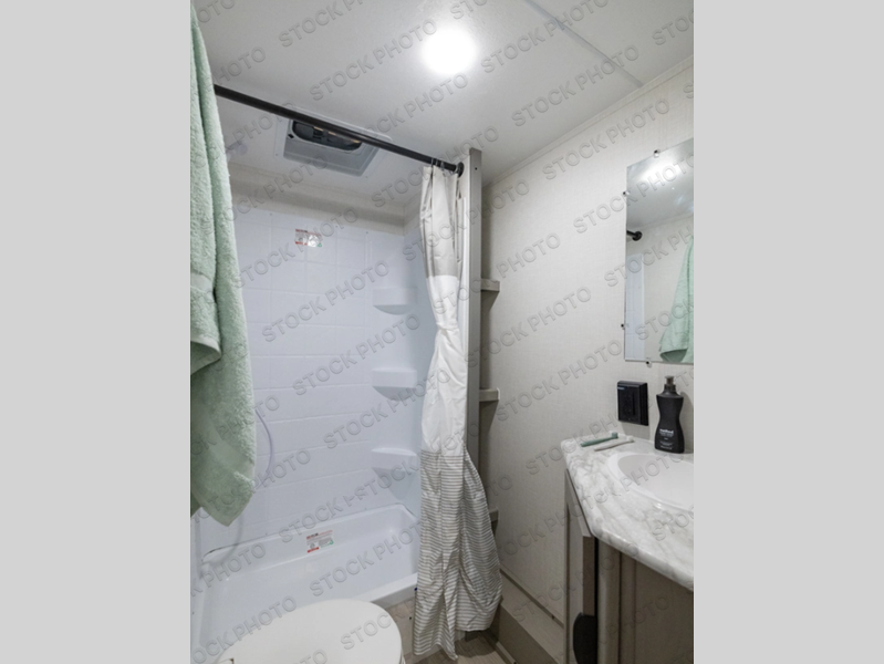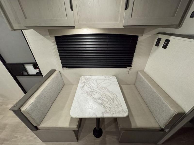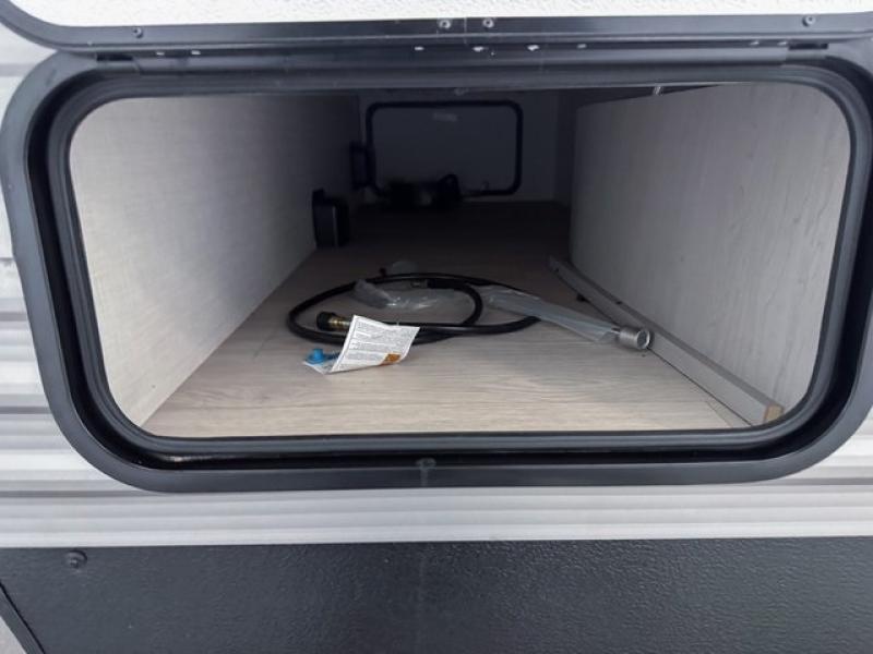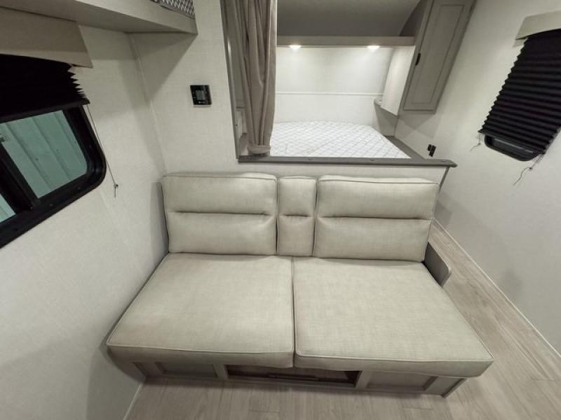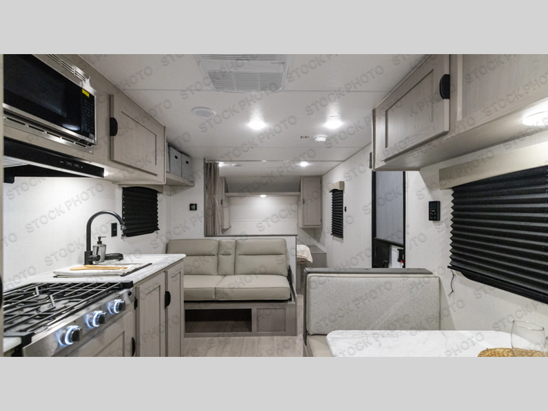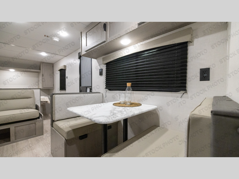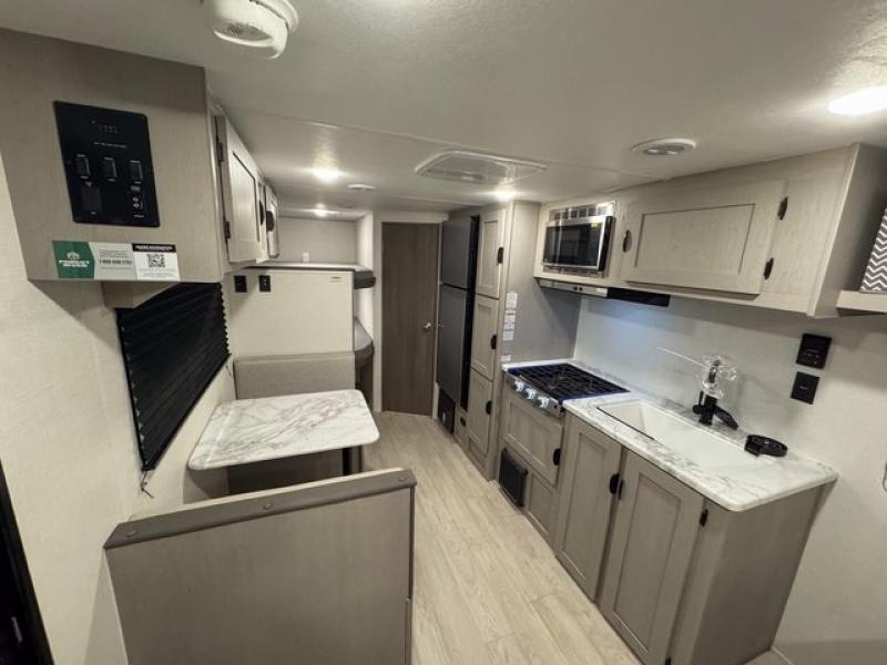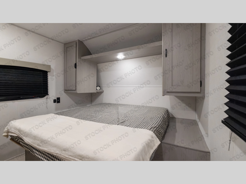 Bring the whole family with you in this travel trailer! The kiddos can sleep on the rear corner set of double-size bunks. The opposite rear corner features a full bath including a 24" x 36" shower, linen cabinet, toilet, and vanity. In the main living space you will find plenty of seating with a booth dinette and jackknife sofa which can also transform into an extra sleeping space if needed. Everyone's bellies will stay full with the three burner cooktop, 12-volt refrigerator, and microwave which you can use to pop a bag of popcorn for movie night. You will enjoy the front bedroom for a bit of privacy including a queen bed and large overhead cabinet for your things. On the outside, a large front pass-through for lawn chairs and camp gear. There is more storage beneath the double bed bunks in back and a nice 15' awning to provide protection from the elements when outdoors.