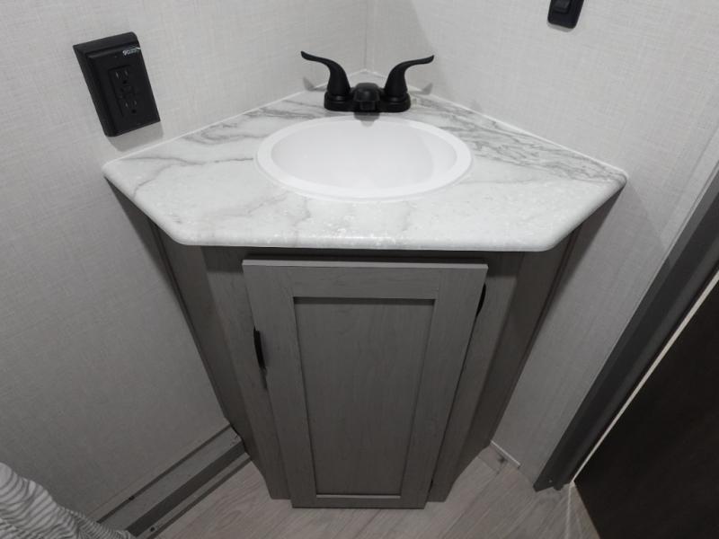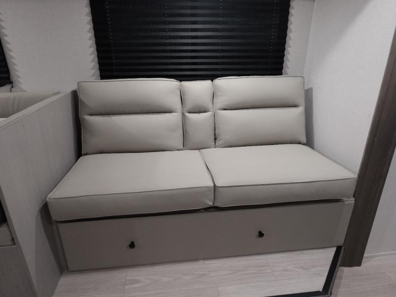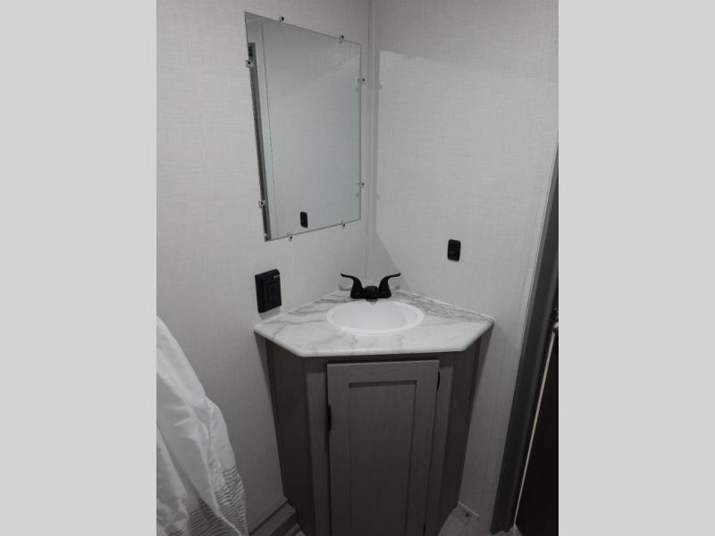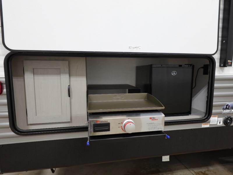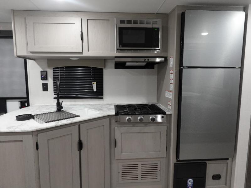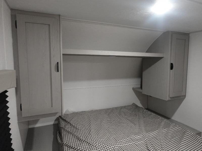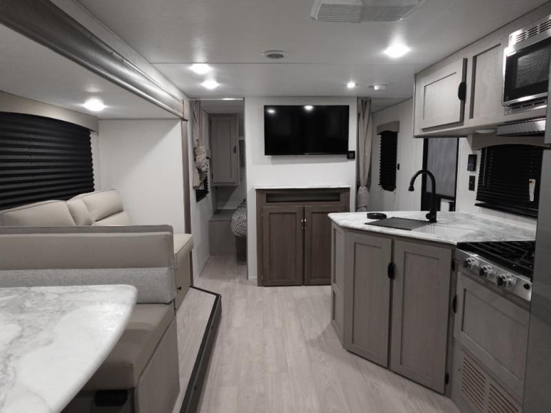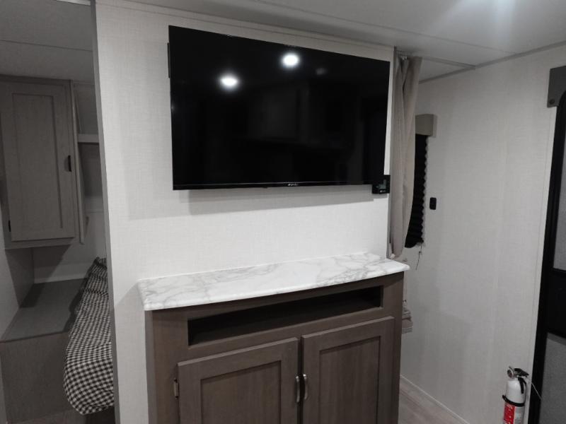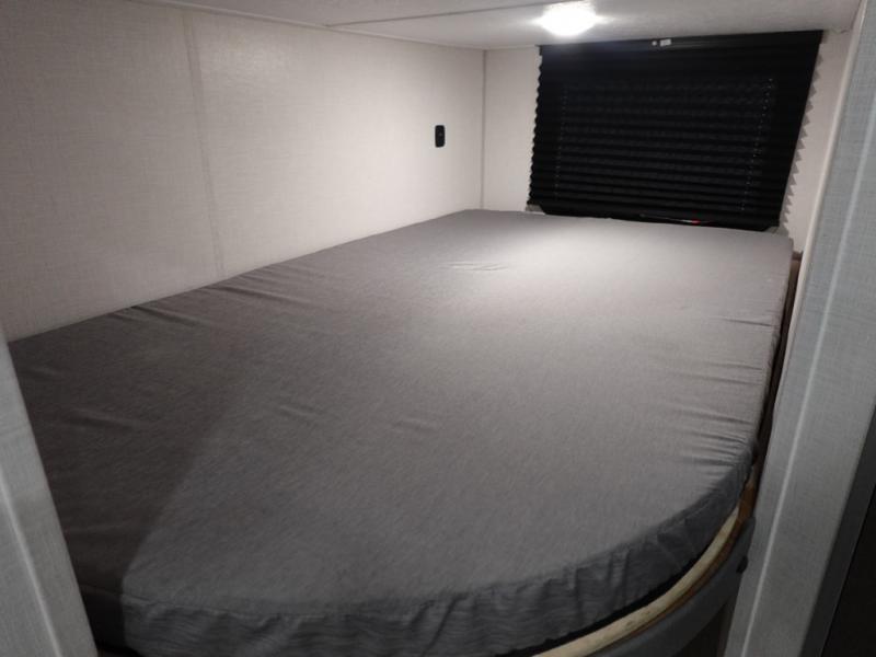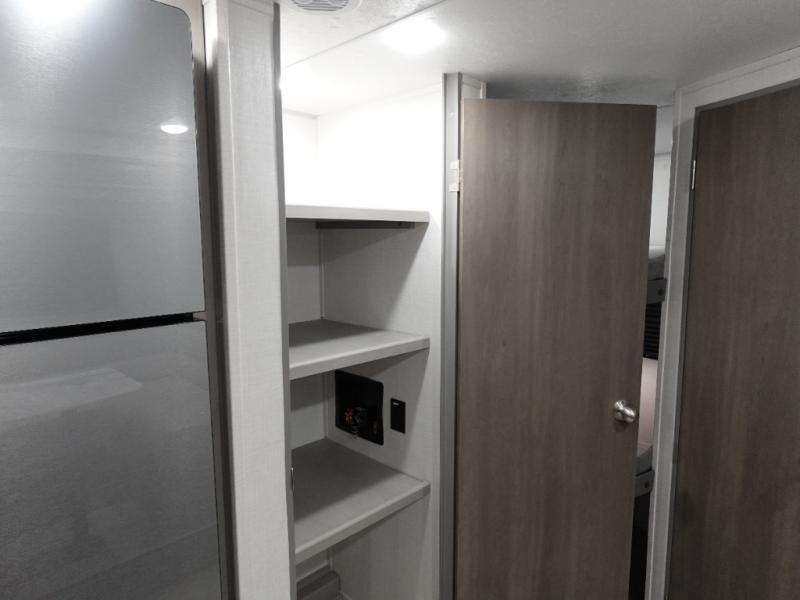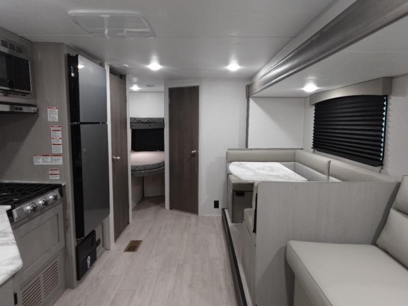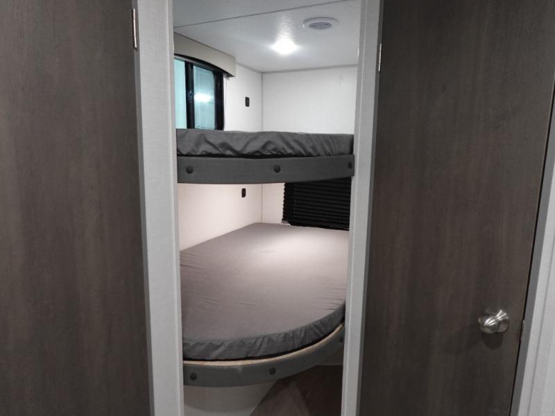 Pack your bags and head to the campground in this spacious travel trailer for eight! The owners will love having their own space in the front private bedroom, complete with an RV queen bed and dual wardrobes and shelves. There are double-size bunks in the rear corner, with the full bath in the other rear corner for easy nighttime use. Everyone can meet in the combined living area and kitchen while the cook makes breakfast. There is a sofa and booth dinette within the large slide out and an entertainment center. This unit also includes a large pantry with washer and dryer prep!