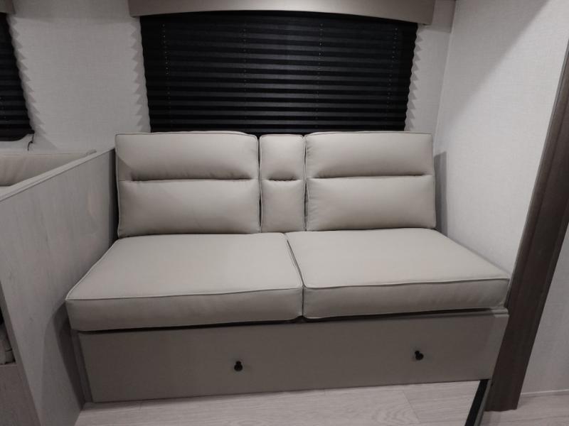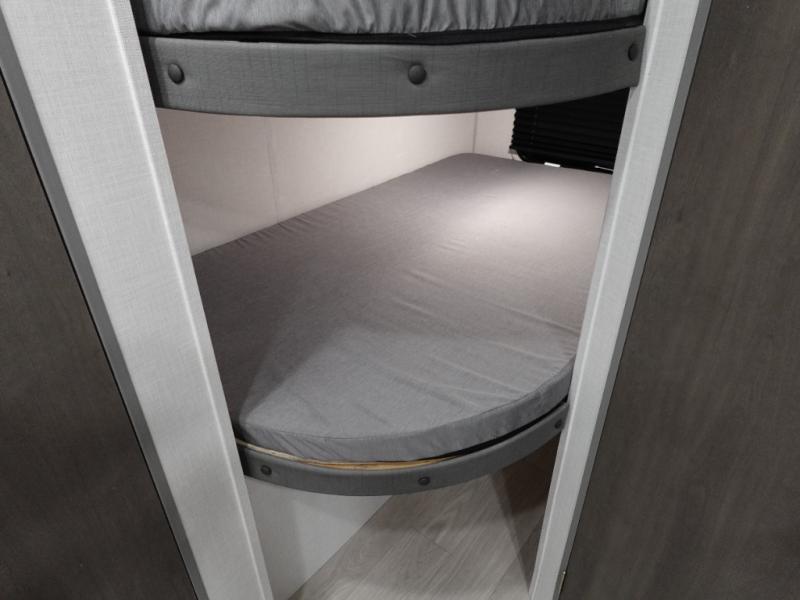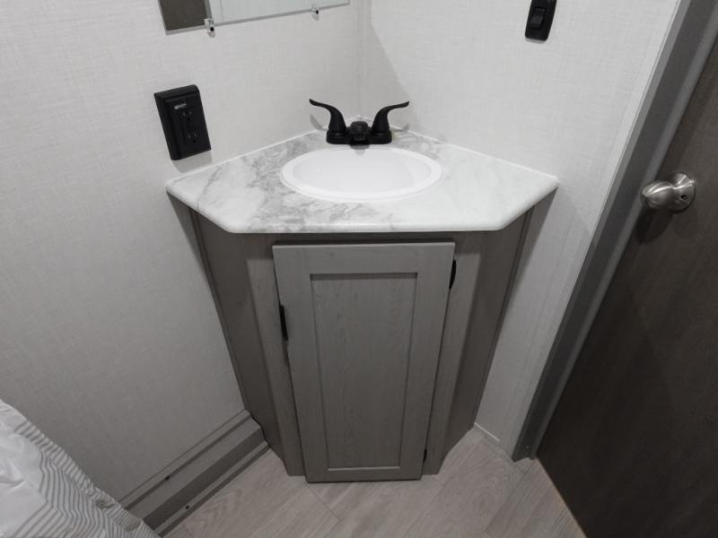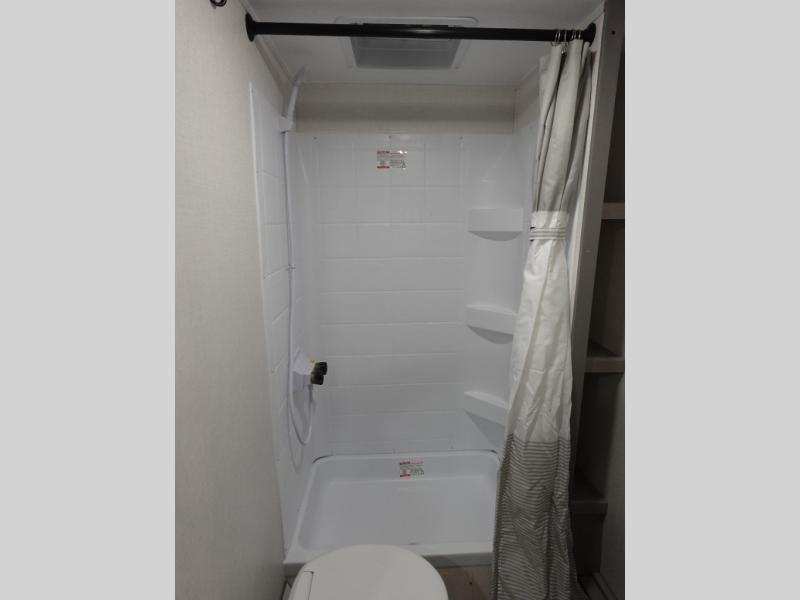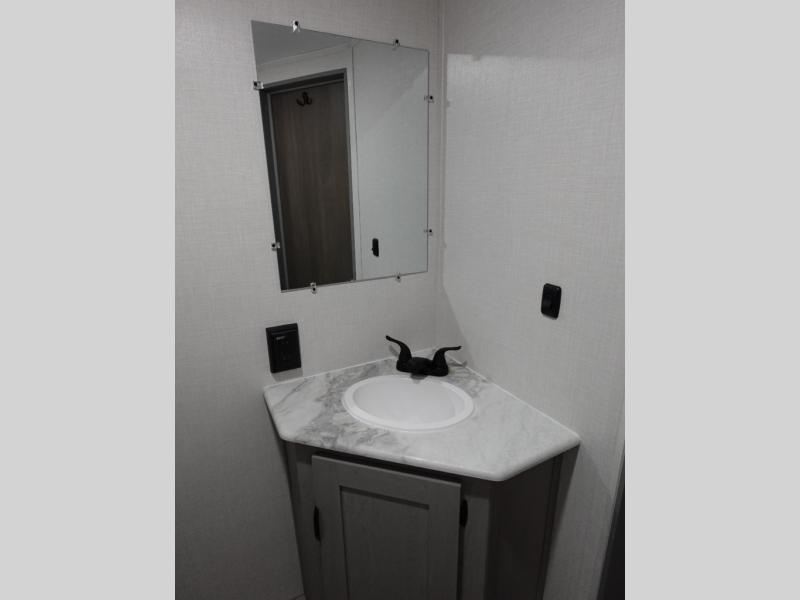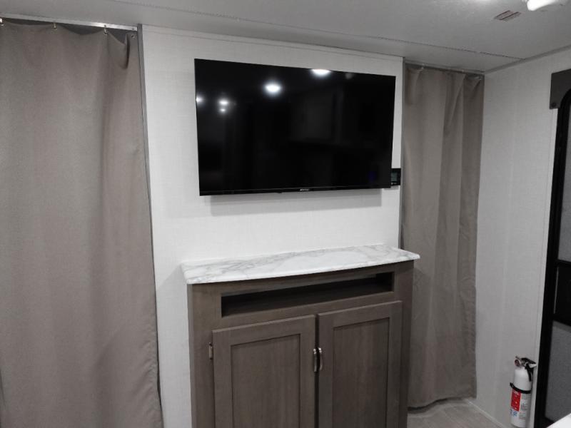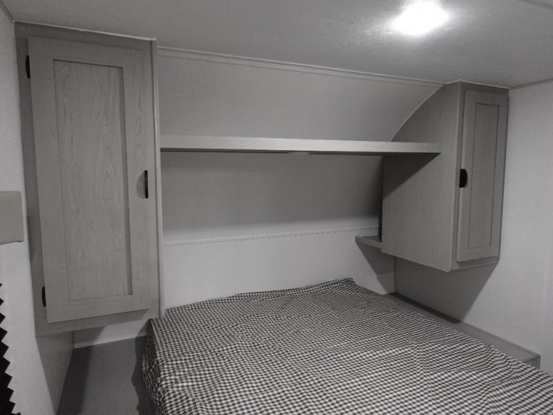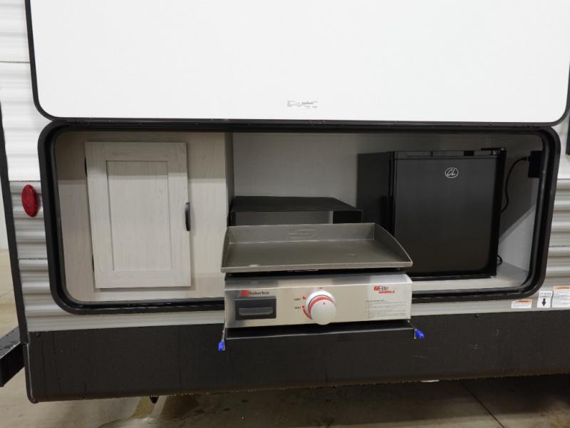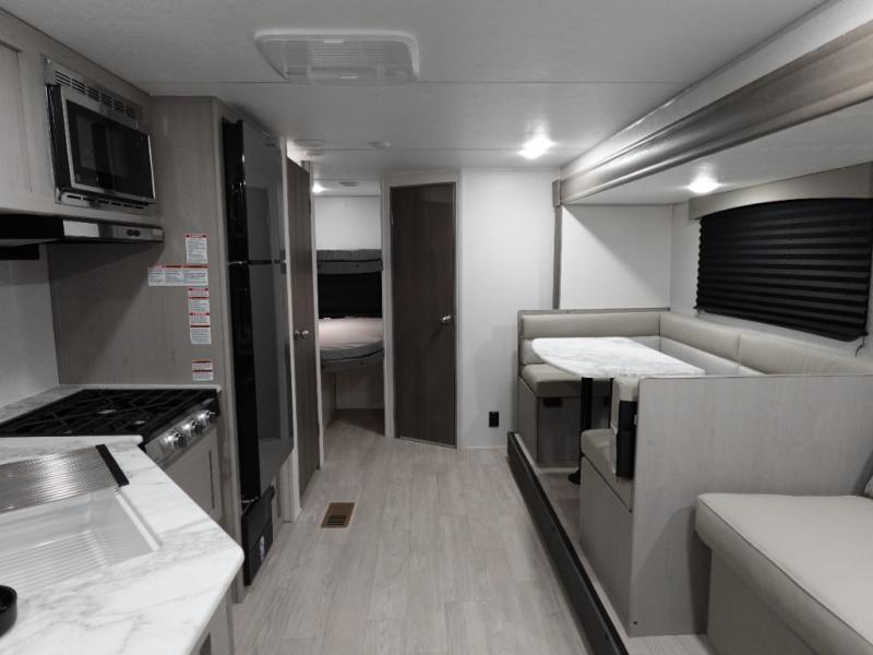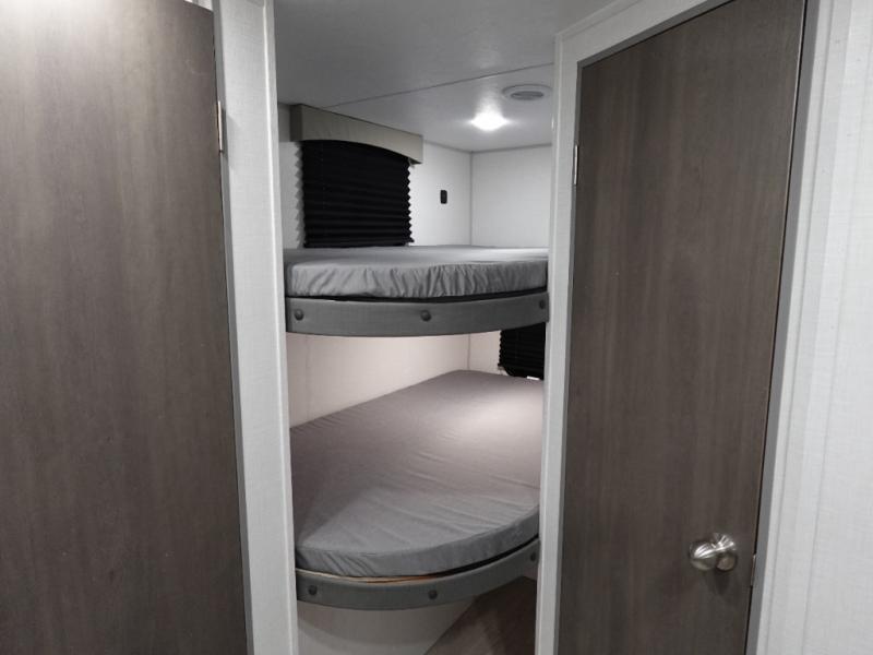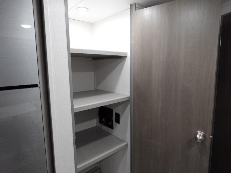 Pack your bags and head to the campground in this spacious travel trailer for eight! The owners will love having their own space in the front private bedroom, complete with an RV queen bed and dual wardrobes and shelves. There are double-size bunks in the rear corner, with the full bath in the other rear corner for easy nighttime use. Everyone can meet in the combined living area and kitchen while the cook makes breakfast. There is a sofa and booth dinette within the large slide out and an entertainment center. This unit also includes a large pantry with washer and dryer prep, giving you the option to add these appliances!