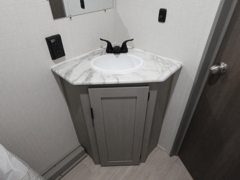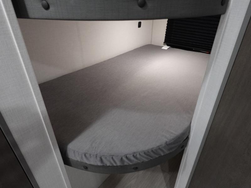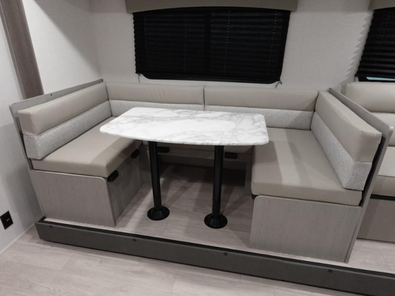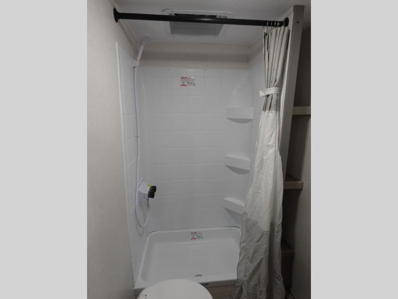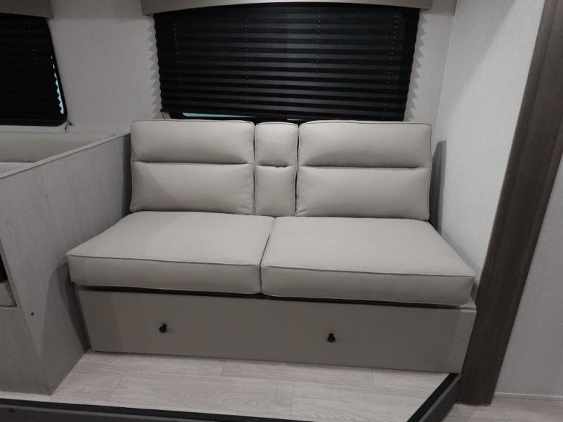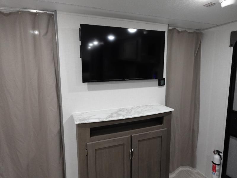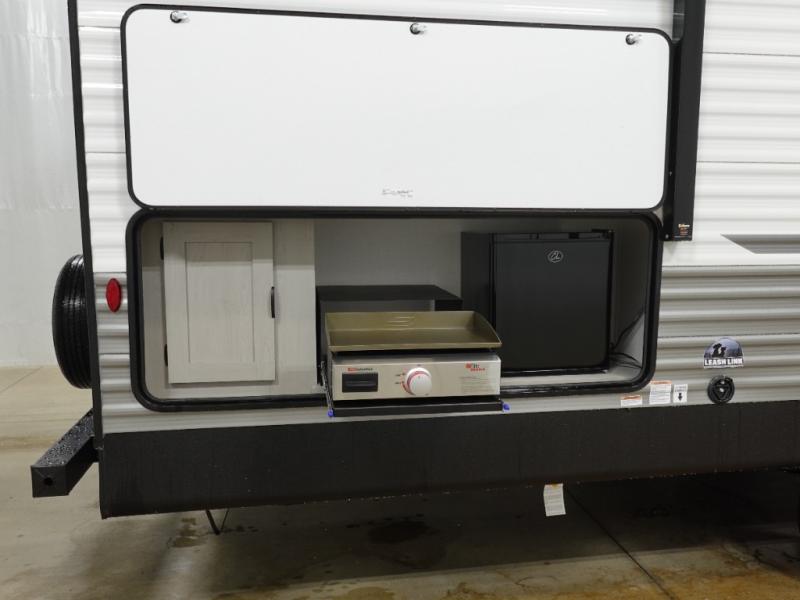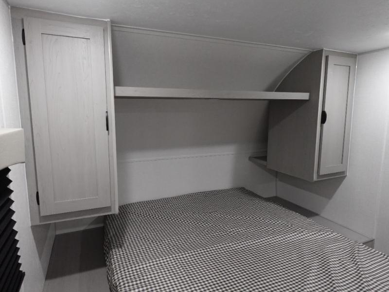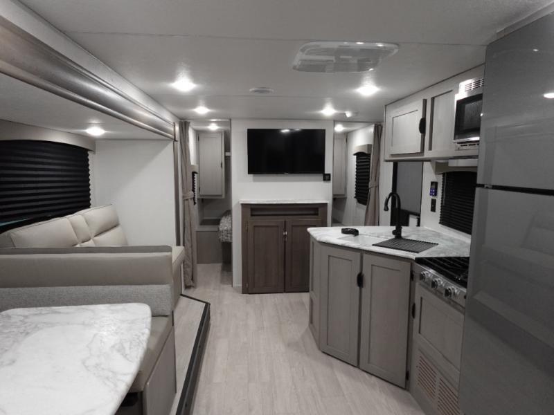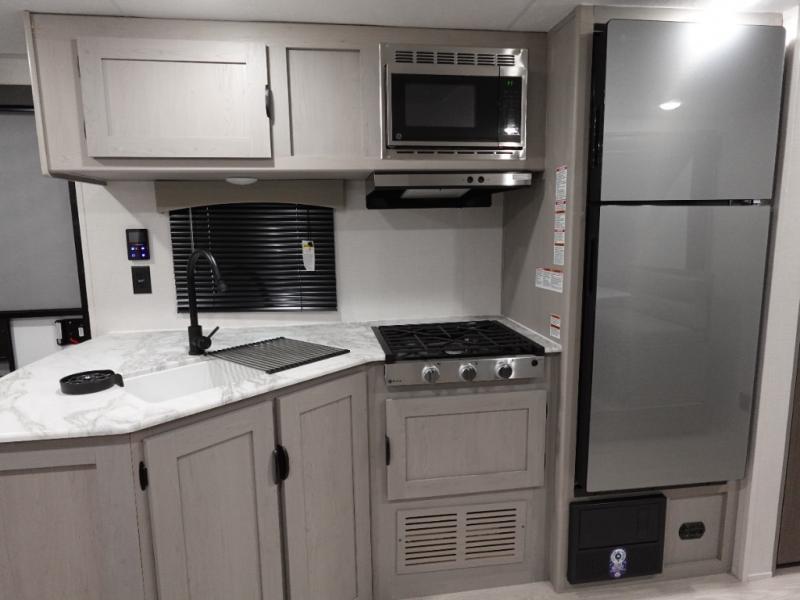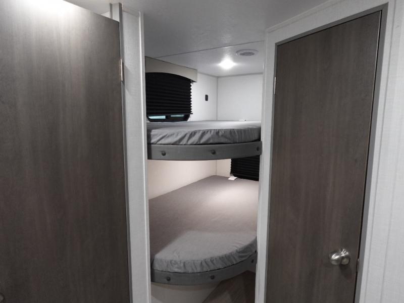 Pack your bags and head to the campground in this spacious travel trailer for eight! The owners will love having their own space in the front private bedroom, complete with an RV queen bed and dual wardrobes and shelves. There are double-size bunks in the rear corner, with the full bath in the other rear corner for easy nighttime use. Everyone can meet in the combined living area and kitchen while the cook makes breakfast. There is a sofa and booth dinette within the large slide out and an entertainment center with an optional fireplace if you want to make this space more cozy.