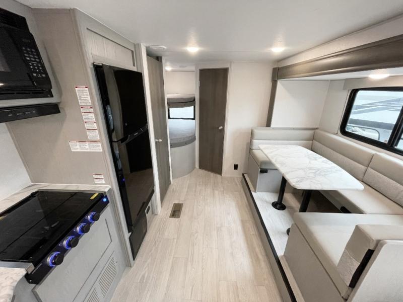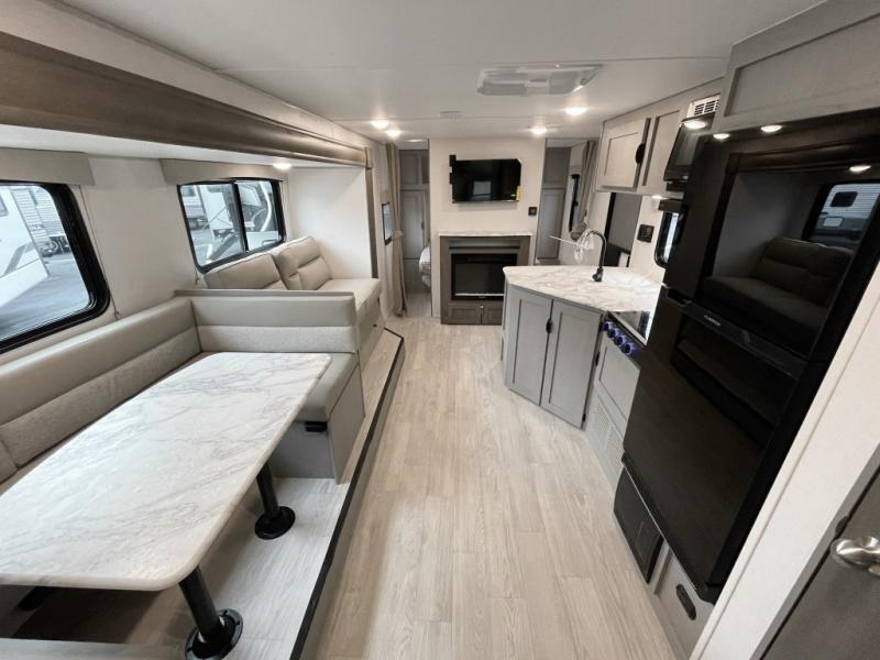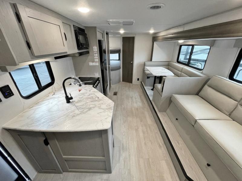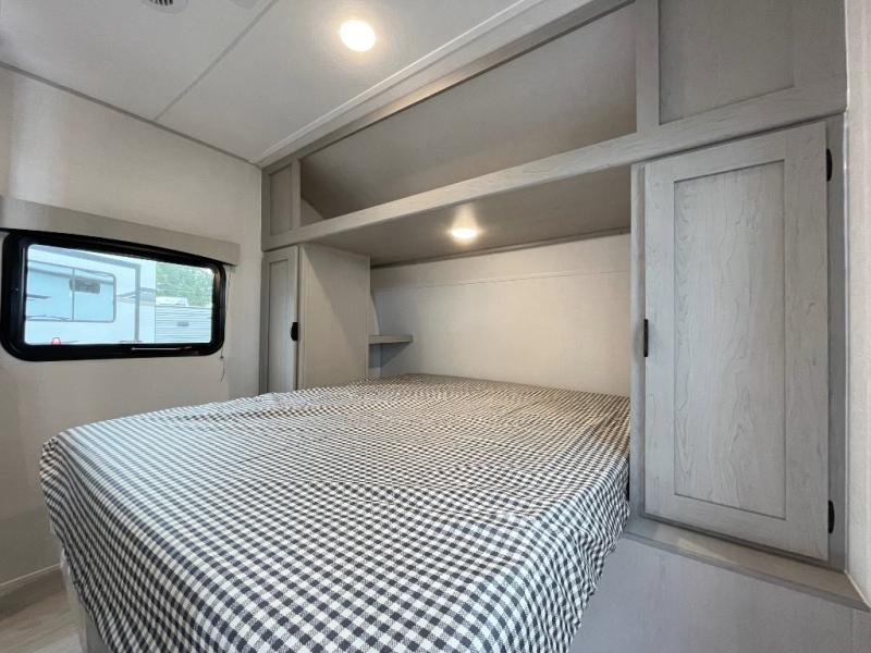 You won't believe all that this travel trailer has to offer! Starting with the front bedroom including a 60" x 74" RV queen bed that has wardrobes on either side. The rear corner bathroom has a great 24" x 36" shower to freshen up in each morning. The chef can prepare their best meals using the three burner cooktop and microwave oven. and store the leftovers in the 10 cu. ft. 12V refrigerator. You can enjoy your meals together at the U-shaped dinette and then play cards or a board game. There is also a sofa to relax on, and the kids will love the steps up to a double- size set bunk beds!