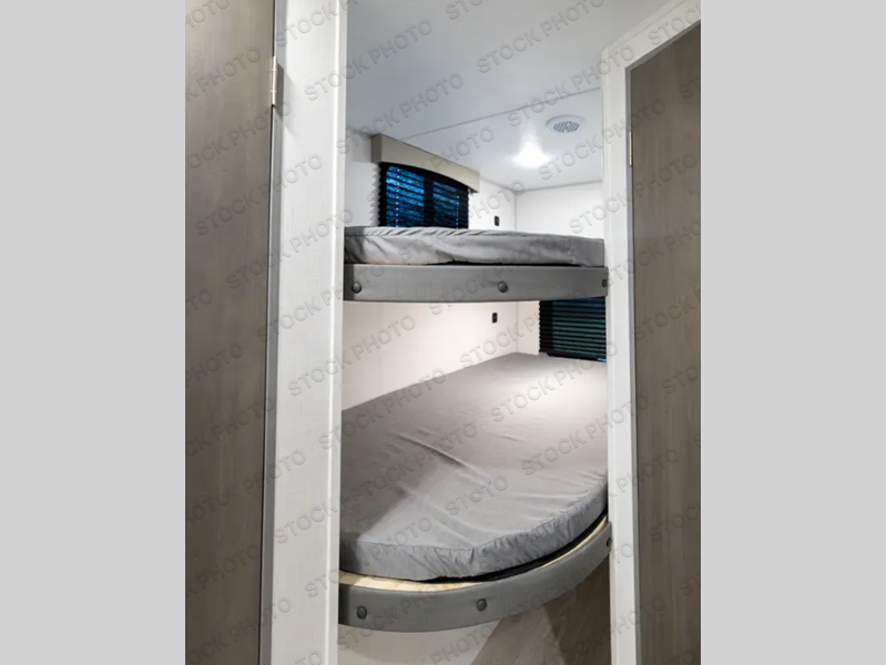 You won't believe all that this travel trailer has to offer! Starting with the front bedroom including a 60" x 74" RV queen bed that has wardrobes on either side. The rear corner bathroom has a great 24" x 36" shower to freshen up in each morning. The chef can prepare their best meals using the three burner cooktop and microwave oven. and store the leftovers in the 10 cu. ft. 12V refrigerator. You can enjoy your meals together at the U-shaped dinette and then play cards or a board game. There is also a sofa to relax on, and the kids will love the steps up to a double- size set bunk beds!