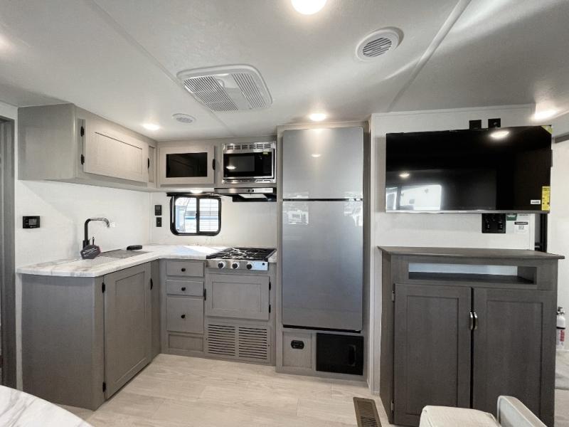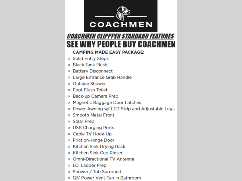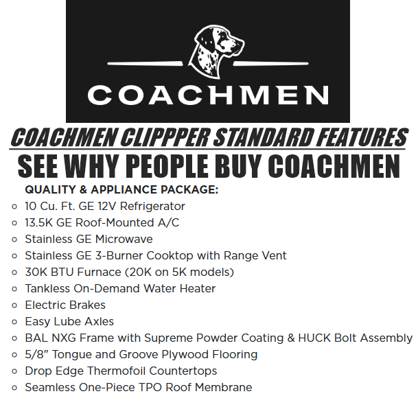 With any Coachmen Clipper 6K Series travel trailer, you can experience affordable camping with your family with the same comforts and quality as the bigger trailers. Each is built on a BAL NXG frame, and includes a seamless one-piece TPO roof membrane, easy lube axle(s), and HUCK bolt assembly construction. The interior offers a kitchen sink drying rack, a 12V refrigerator, and a foot flush toilet, plus more. You will also appreciate the tankless on demand water heater plus the 13.5k BTU A/C and 30k BTU furnace to ensure your comfort!