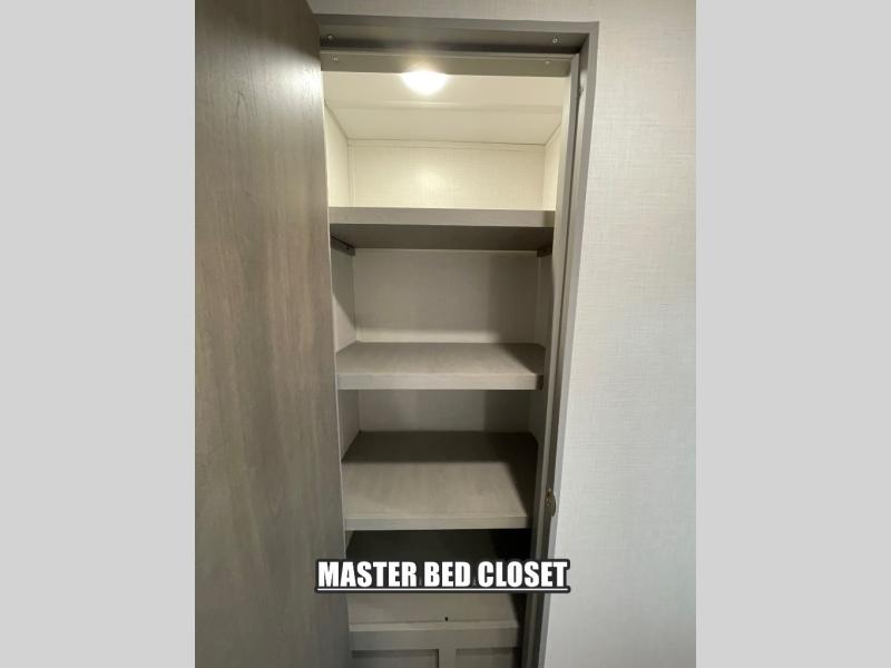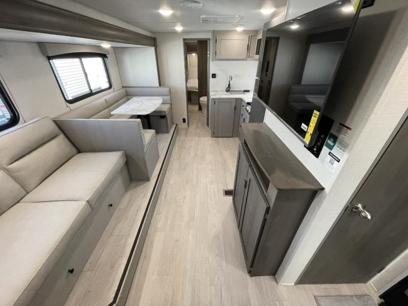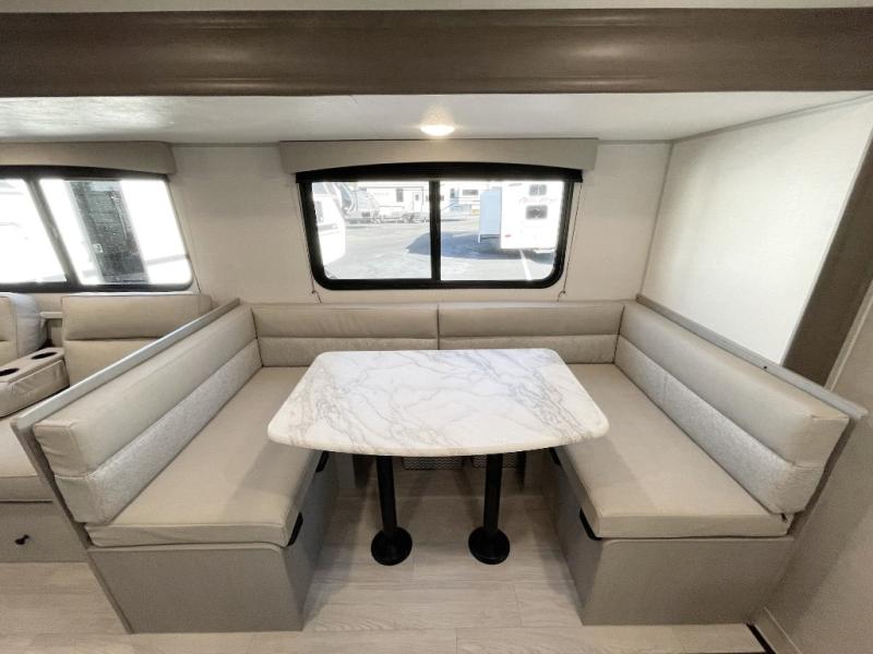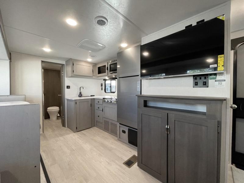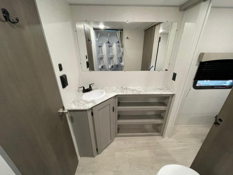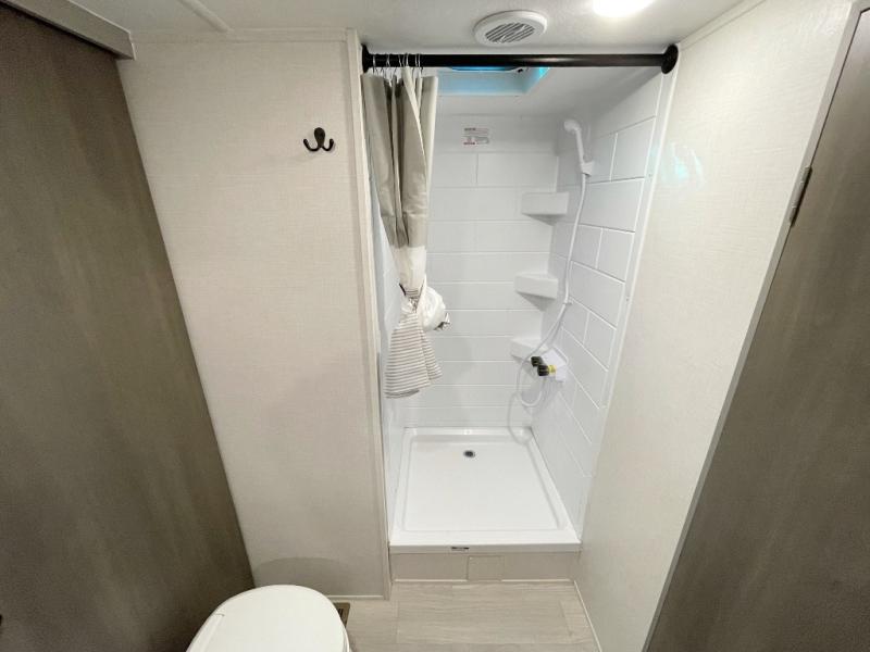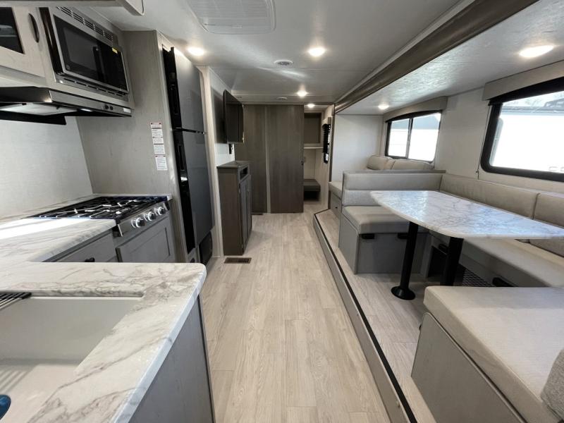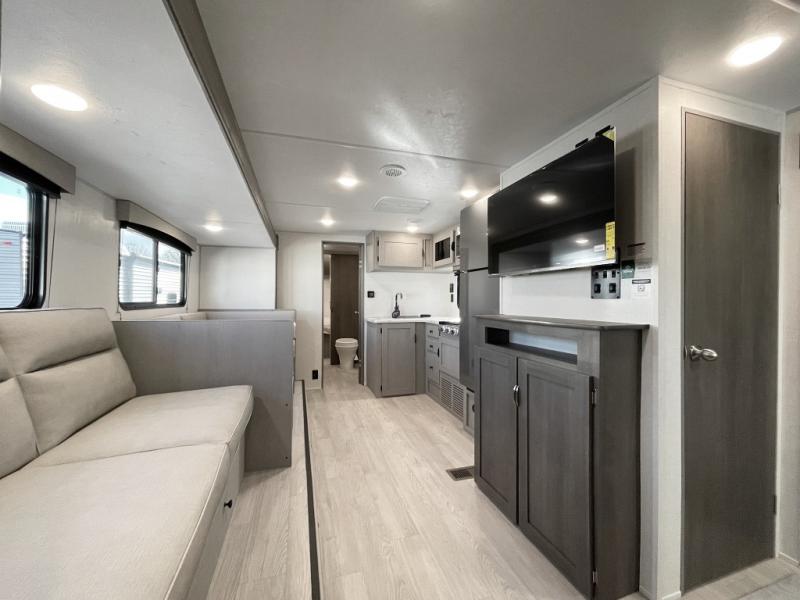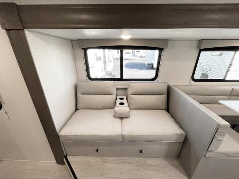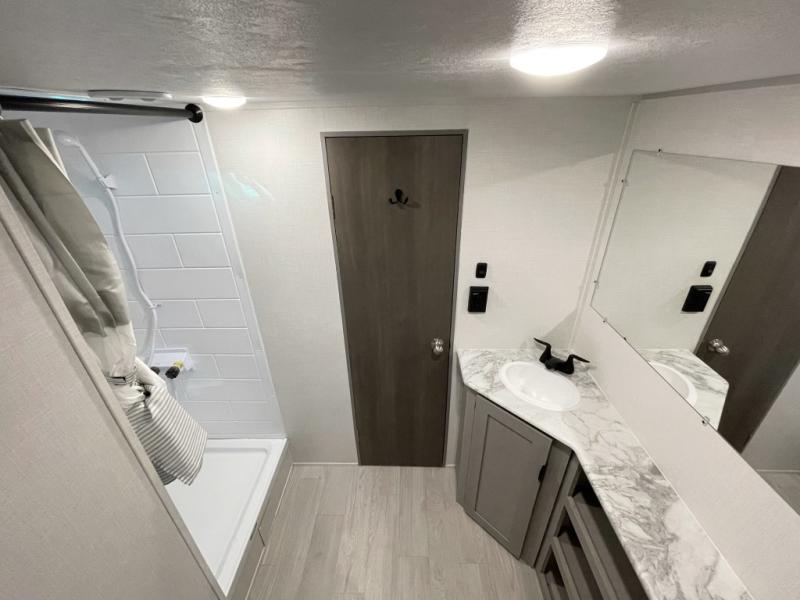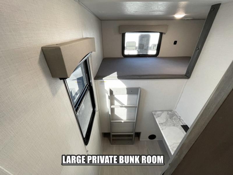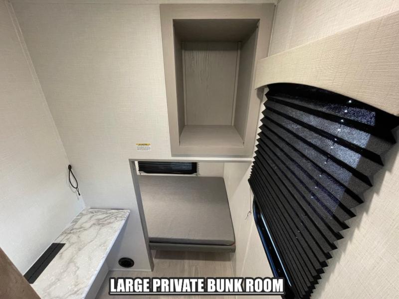 Everything you've been looking for in a travel trailer is found within this unit! The 21' power awning can be set up when you get to the campground, then you can unload your camping gear from the pass-thru storage and enjoy the outdoors. Once inside, you can put your things away in the front master bedroom that includes an RV queen bed and dual bedside wardrobes. There is a luxurious full bathroom featuring a shower with glass door and storage below the bath countertop. In the combined kitchen and living area you'll find a large slide out, a U-shaped dinette and sofa, plus a walk-in pantry with washer and dryer prep if you plan on getting those appliances. A great feature on this travel trailer are the rear private bunk rooms where each of your kiddos or guests can have their own space, and don't forget that both have flip-up desks so they can write, draw, work, you name it!