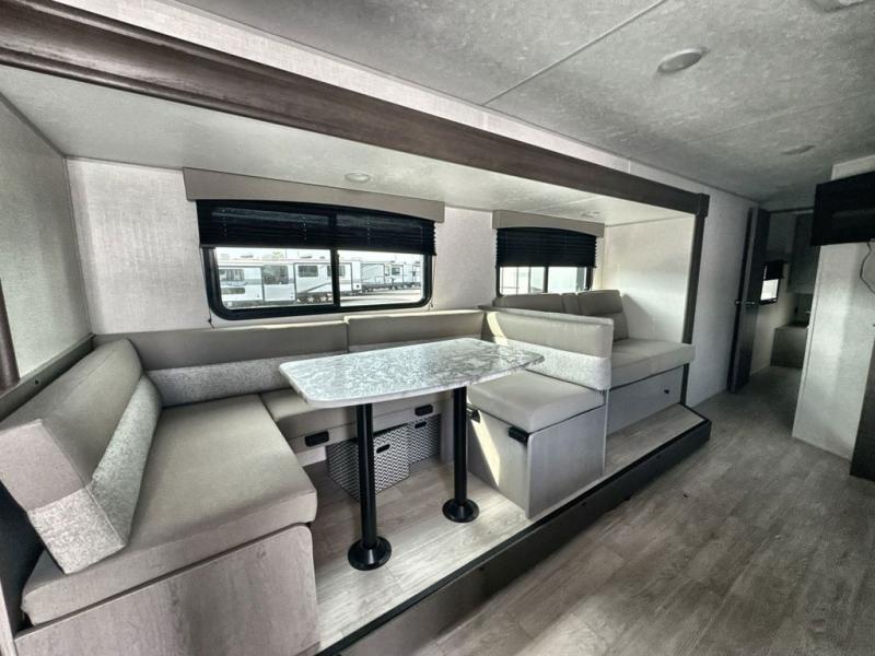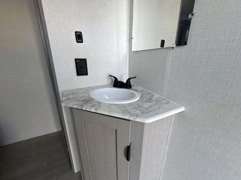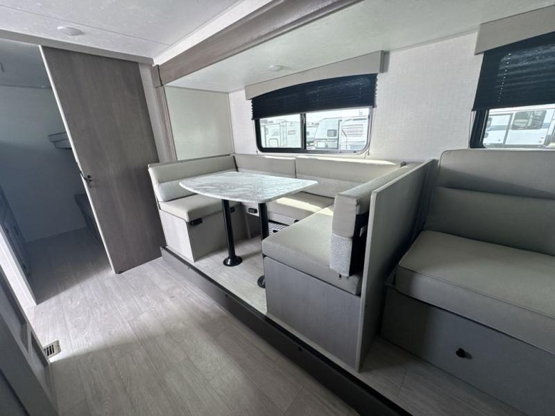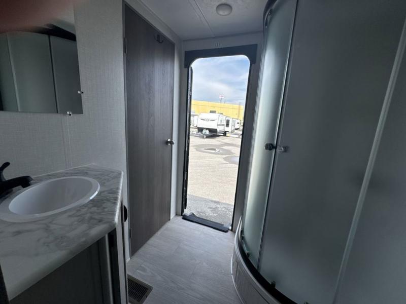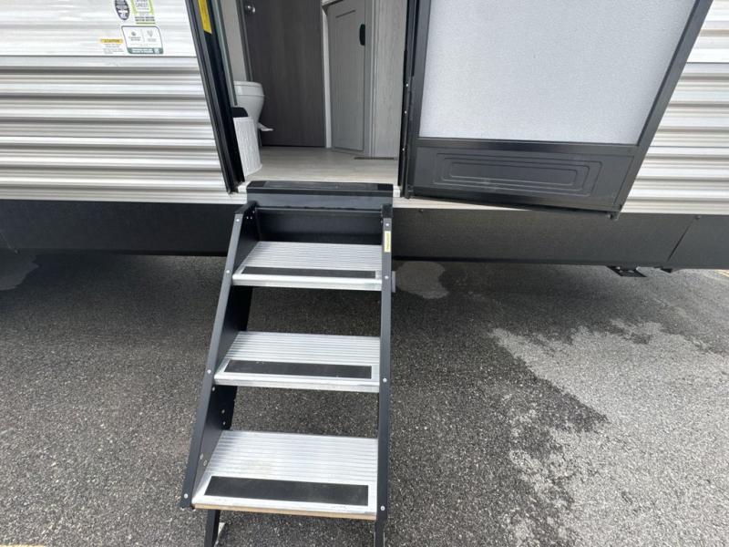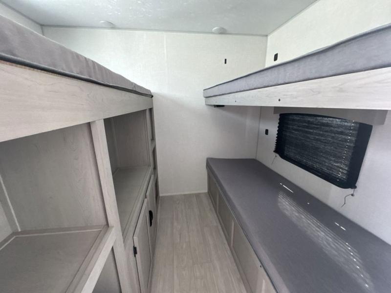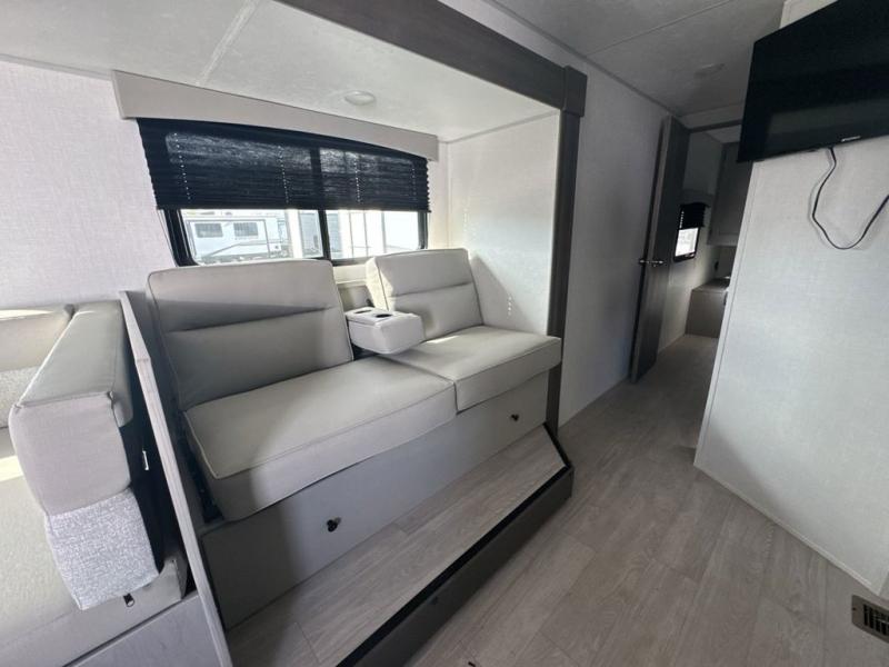 Everything you've been looking for in a travel trailer is found with this unit! The 20' power awning can be set up when you get to the campground, then you can unload the pass-thru storage and make lunch on the outside camp kitchen with a pull-out griddle. Once inside, you can put your things away in the front master bedroom that includes an RV queen bed and dual bedside wardrobes, plus you'll have a private entrance into the dual entry bath. The bath also includes one of the dual entry doors to the unit to make it easier to use when you're spending time outdoors. In the combined kitchen and living area you'll find a large slide out, a U-shaped dinette and sofa, plus a pantry with washer and dryer prep if you plan to go full-time. Another great feature on this travel trailer is the rear private bunkhouse! There is a 28" x 72" bunk bed across from 38" x 72" bunk with storage below so your guests have a place for their things!