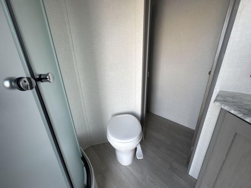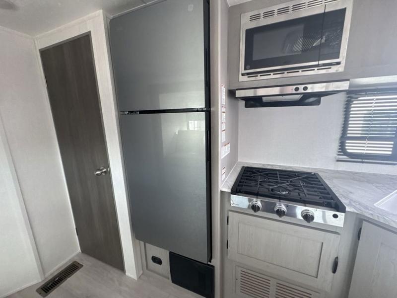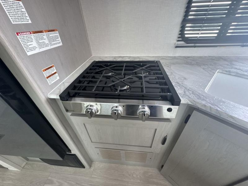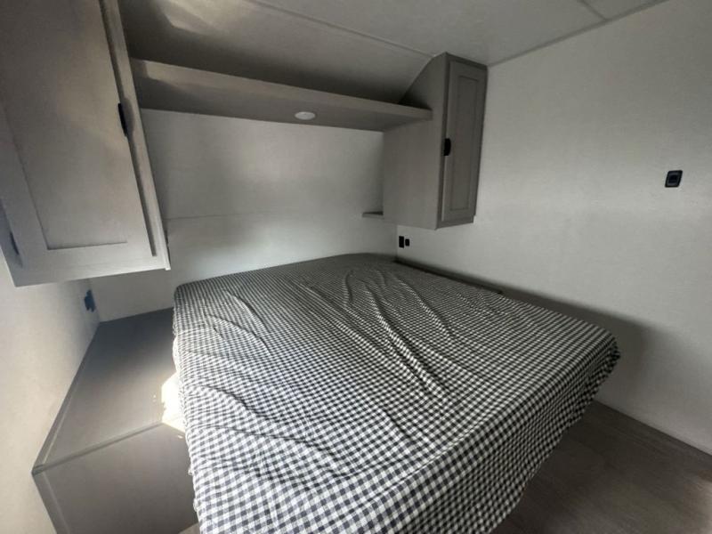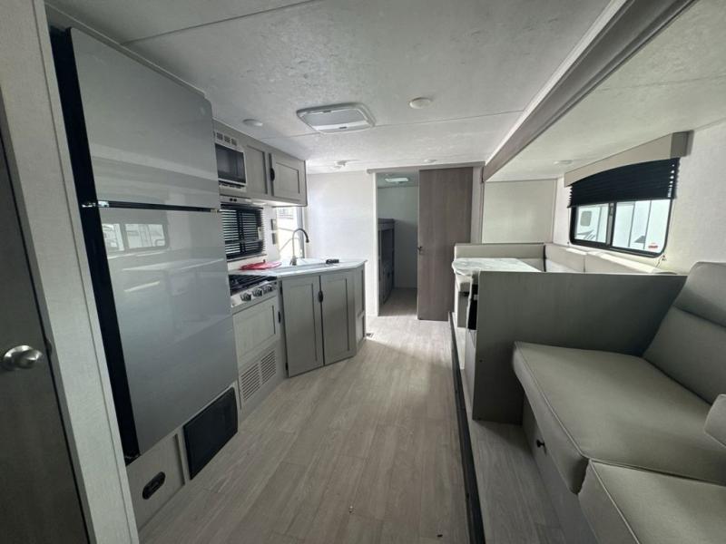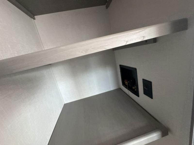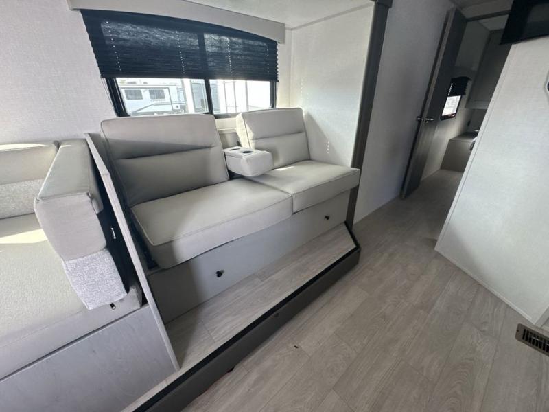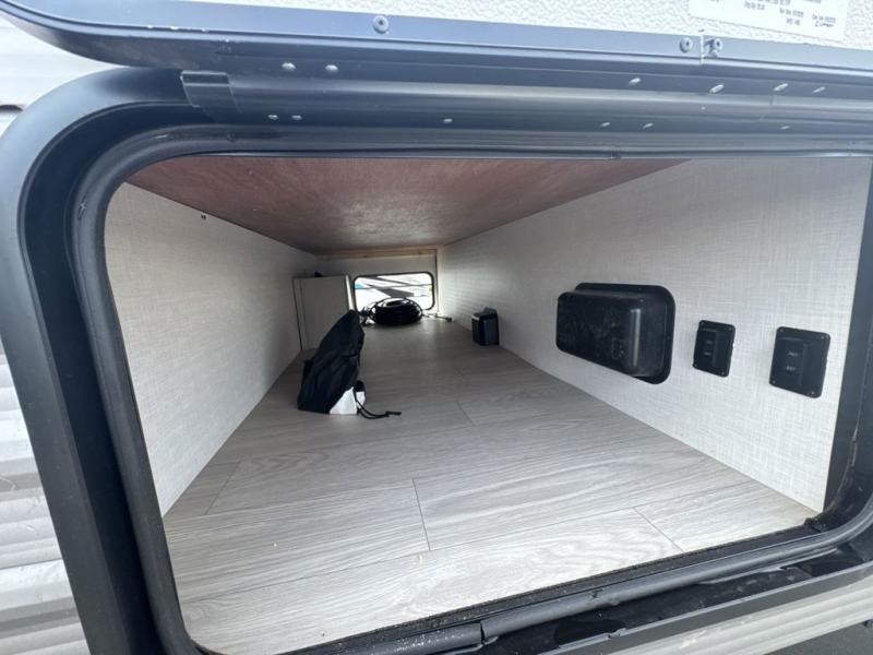 Everything you've been looking for in a travel trailer is found with this unit! The 20' power awning can be set up when you get to the campground, then you can unload the pass-thru storage and make lunch on the outside camp kitchen with a pull-out griddle. Once inside, you can put your things away in the front master bedroom that includes an RV queen bed and dual bedside wardrobes, plus you'll have a private entrance into the dual entry bath. The bath also includes one of the dual entry doors to the unit to make it easier to use when you're spending time outdoors. In the combined kitchen and living area you'll find a large slide out, a U-shaped dinette and sofa, plus a pantry with washer and dryer prep if you plan to go full-time. Another great feature on this travel trailer is the rear private bunkhouse! There is a 28" x 72" bunk bed across from 38" x 72" bunk with storage below so your guests have a place for their things!