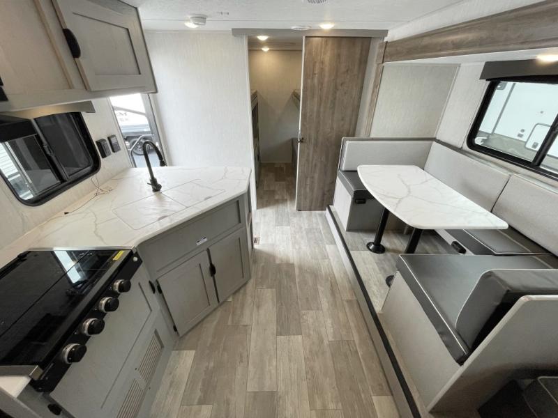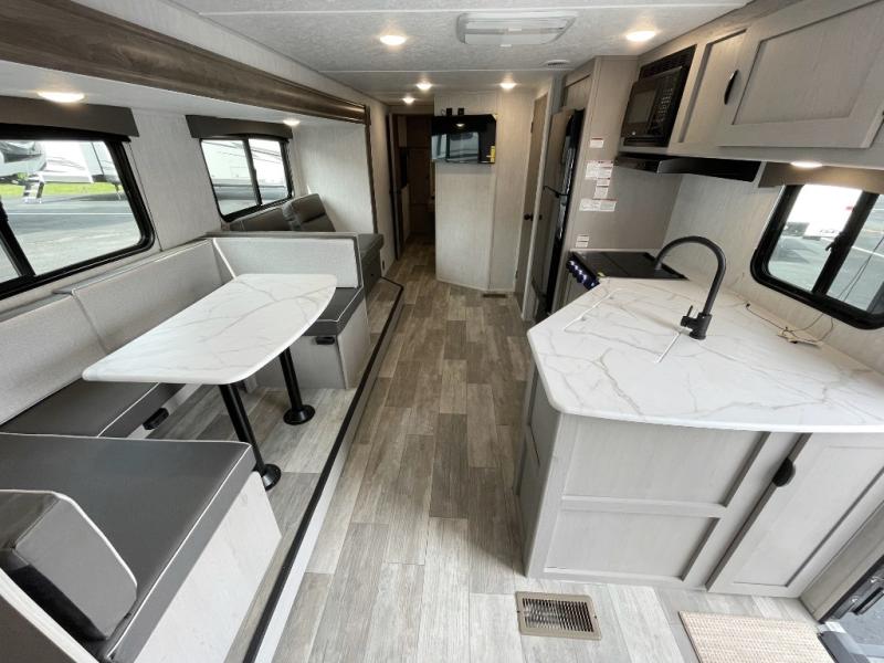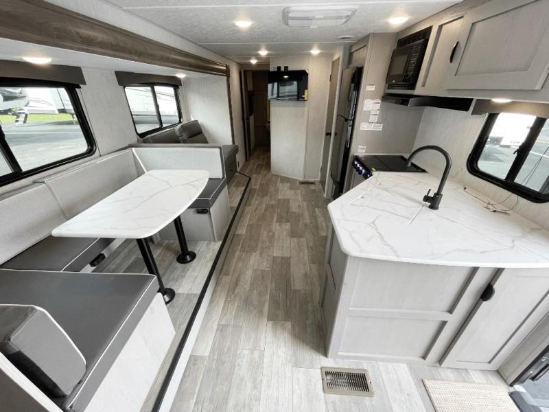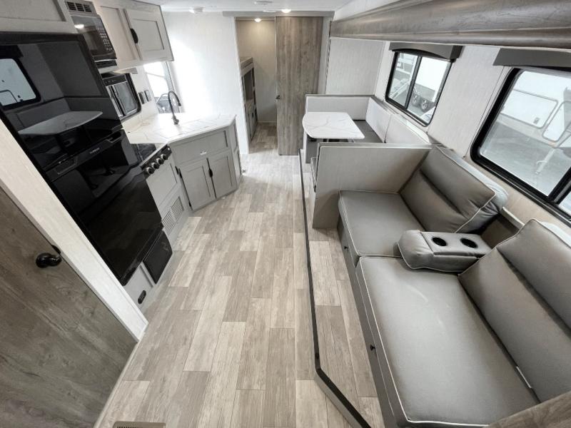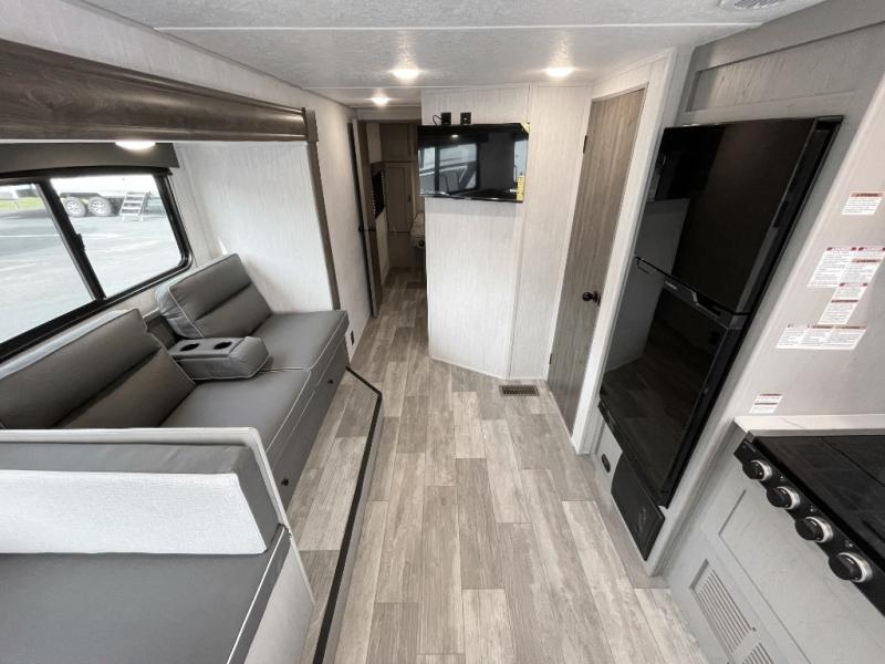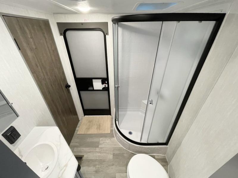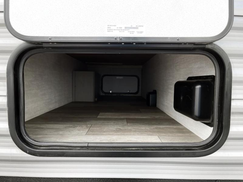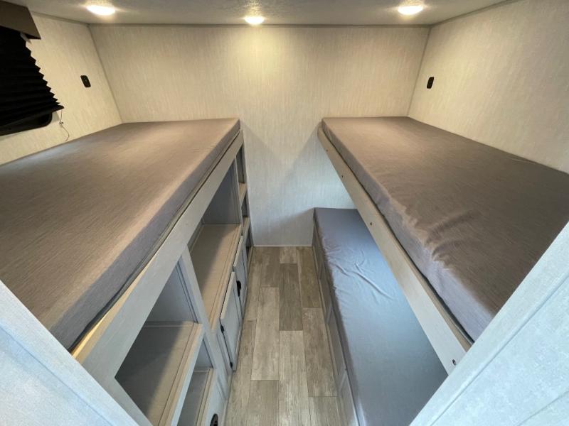 Everything you've been looking for in a travel trailer is found with this unit! The 21' power awning can be set up when you get to the campground, then you can unload the pass-thru storage. Once inside, you can put your things away in the front master bedroom that includes an RV queen bed and dual bedside wardrobes, plus you'll have a private entrance into the dual entry bath. The bath also includes one of the dual entry doors to the unit to make it easier to use when you're spending time outdoors. In the combined kitchen and living area you'll find a large slide out, a U-shaped dinette and sofa, plus a pantry with washer and dryer prep if you plan to go full-time. Another great feature on this travel trailer is the rear private bunkhouse! There are 28" x 72" bunk beds across from 38" x 72" bunks so your guests have a place to sleep!