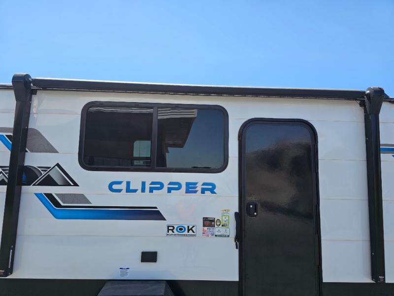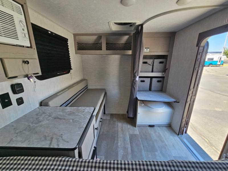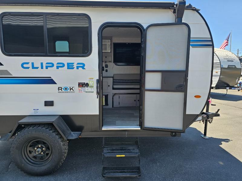 When you want to explore choose this 12000 Series Clipper ROK for your basic off-road adventure needs and a bit more by offering you a 54" X 74" flip-up bed with storage beneath, and gaucho seating that pulls out into a bed for an additional camper at night. There is front and rear overhead cabinetry for storage, and a cassette toilet for added convenience especially at night. A rear hatch camp kitchen provides a place for you to create meals and snacks while you explore. There is a slide-out griddle, a 3.3 cu. ft. 12-volt refrigerator for your cold items, a single sink, and two burner cooktop, plus a microwave oven. There is also plenty of overhead storage for your paper products and spices. A 9' manual awning creates a bit of added outdoor living space where you can set up your camp chairs. You can also add an optional THULE roof-top tent for additional sleeping.