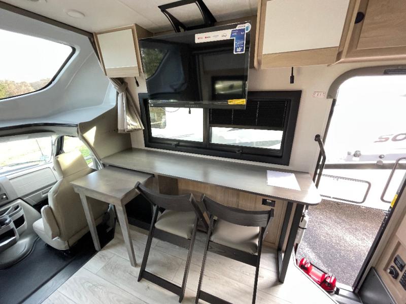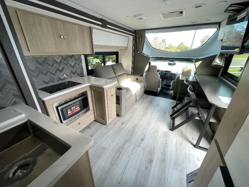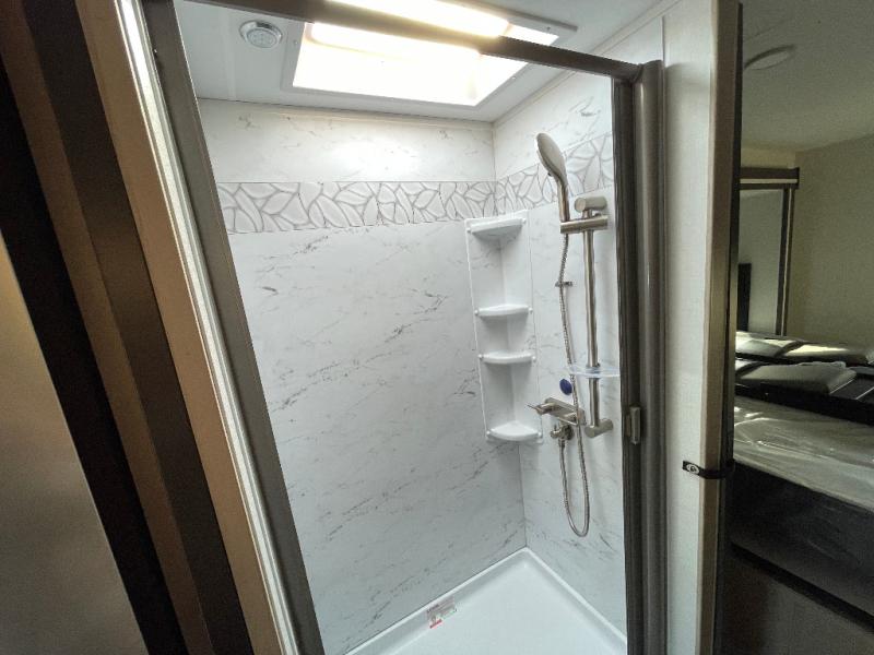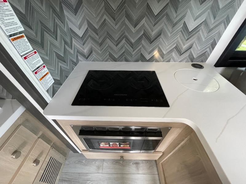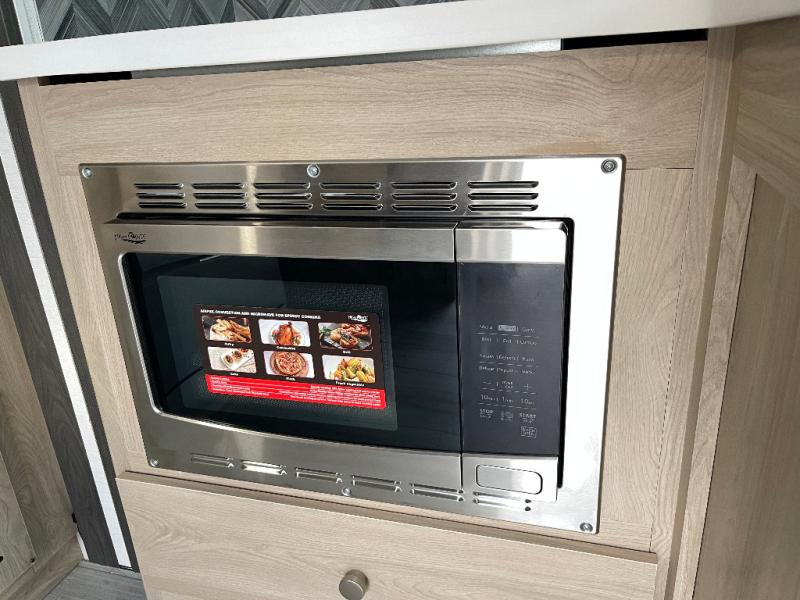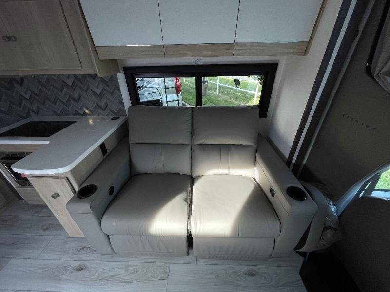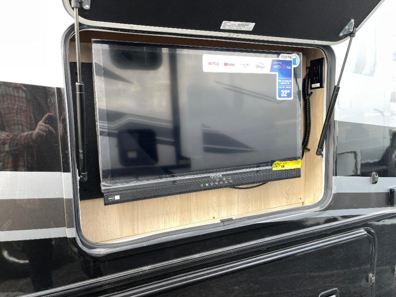 You will travel the highway in true comfort with this motorhome! After a long day of traveling, you can head to the rear private bedroom and lay down on the king bed slide across from a dresser with a 32" Smart TV and even an area prepped to add an optional washer and dryer. The separated bathroom allows one person to clean up in the 24" x 36" shower while another uses the private toilet and sink. The chef can prepare their best meals with the two burner induction cooktop, convection microwave, and 10 cu. ft. 12V double door refrigerator. Enjoy your meals at the free standing dinette with four chairs then let your stomach settle in one of the two recliners while you watch a show on the 39" Smart TV or you could head to the outside entertainment center with a TV/HDMI port/Bluetooth soundbar!