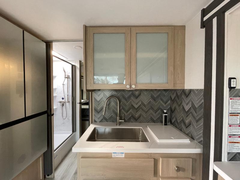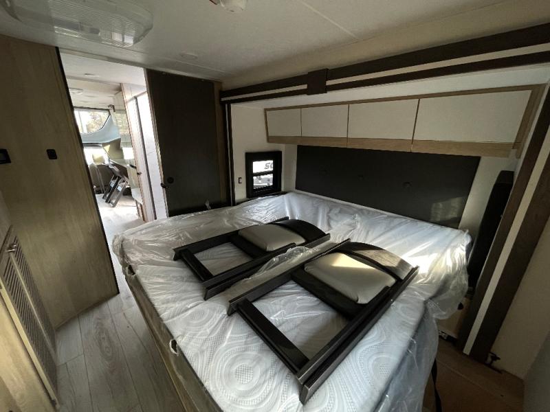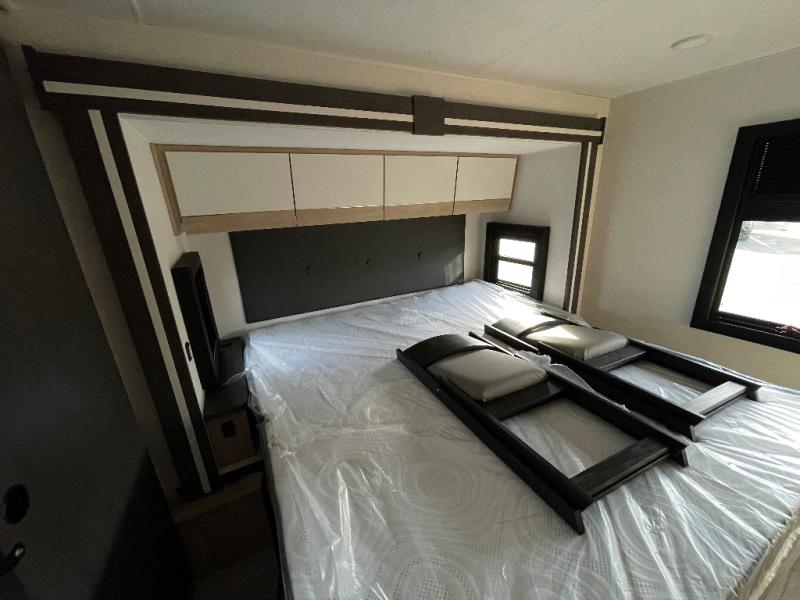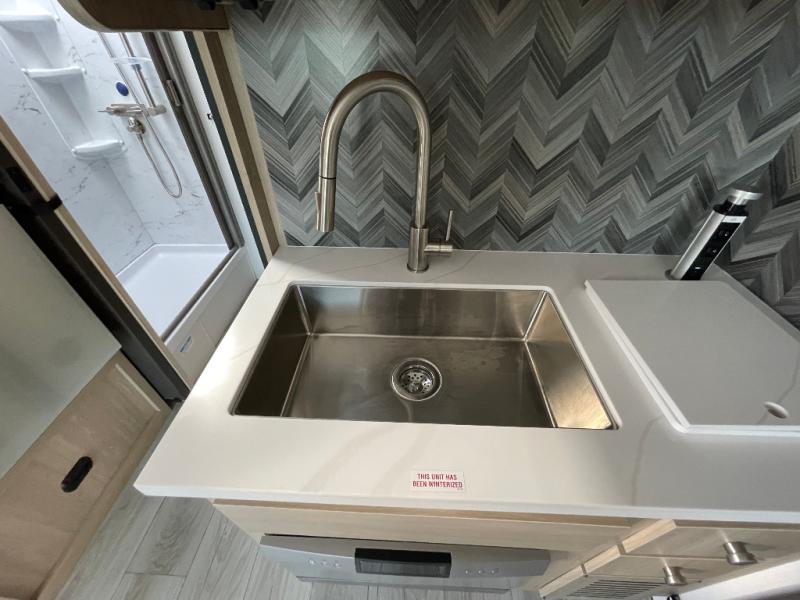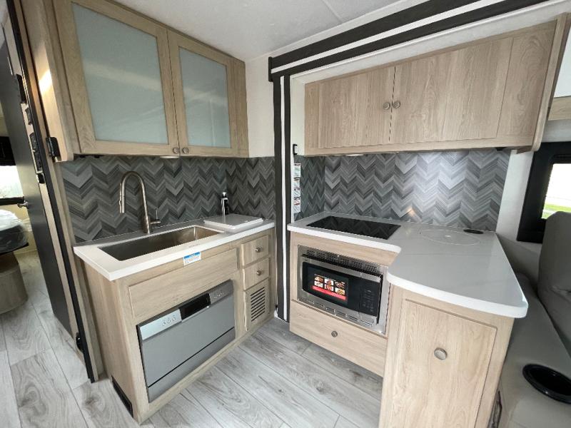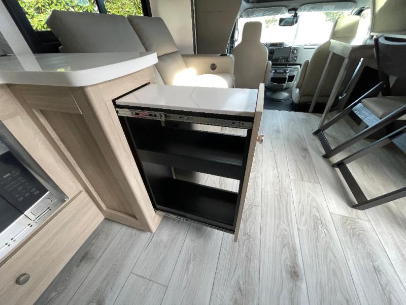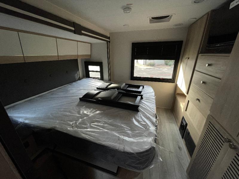 You will travel the highway in true comfort with this motorhome! After a long day of traveling, you can head to the rear private bedroom and lay down on the king bed slide across from a dresser with a 32" Smart TV and even an area prepped to add an optional washer and dryer. The separated bathroom allows one person to clean up in the 24" x 36" shower while another uses the private toilet and sink. The chef can prepare their best meals with the two burner induction cooktop, convection microwave, and 10 cu. ft. 12V double door refrigerator. Enjoy your meals at the free standing dinette with four chairs then let your stomach settle in one of the two recliners while you watch a show on the 39" Smart TV or you could head to the outside entertainment center with a TV/HDMI port/Bluetooth soundbar!