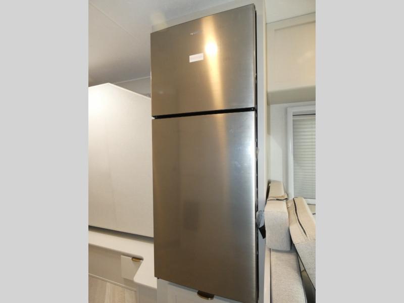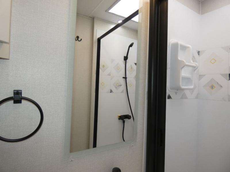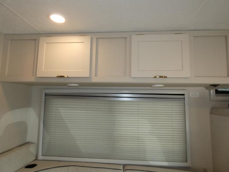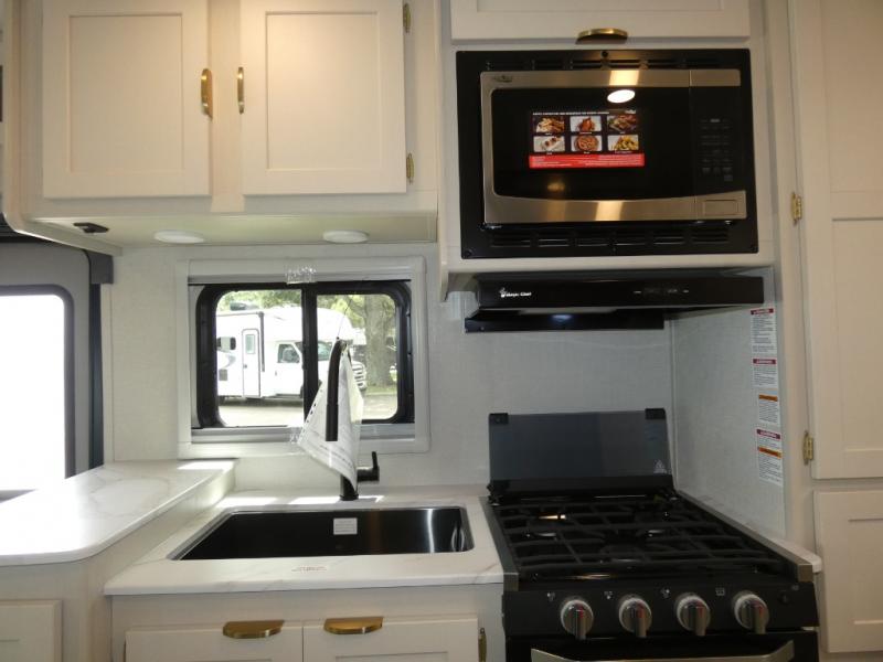 Starting traveling in comfort with this motorhome! It features a rear corner queen bed to lay your head on at night and is conveniently next to the rear corner bathroom which will come in handy at night. There is also a 39" x 95" bunk over cab for sleeping or storage. You could even transform the 44" x 76" J-lounge into an extra sleeping space when you aren't using it to enjoy a meal or play a card game. Speaking of meals, you can easily cook your meals with the three burner cooktop and store any leftovers in the refrigerator. Wind down your nights by watching a movie with the swing-arm TV or set up a chair underneath the 15' power awning!