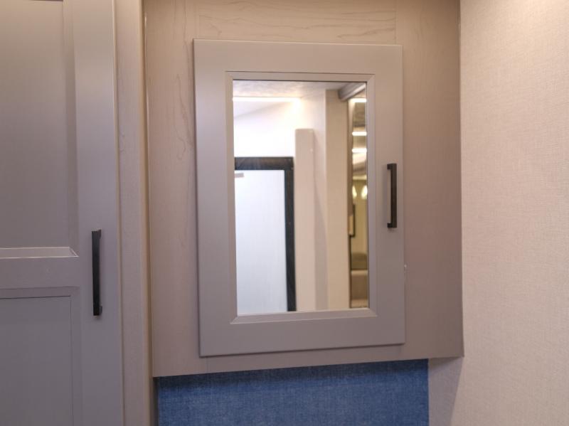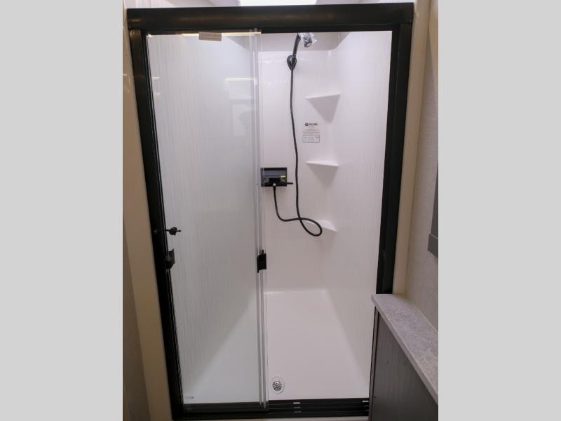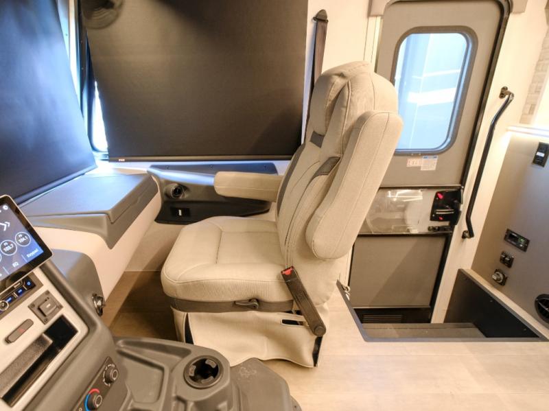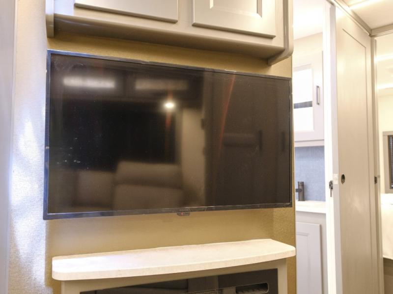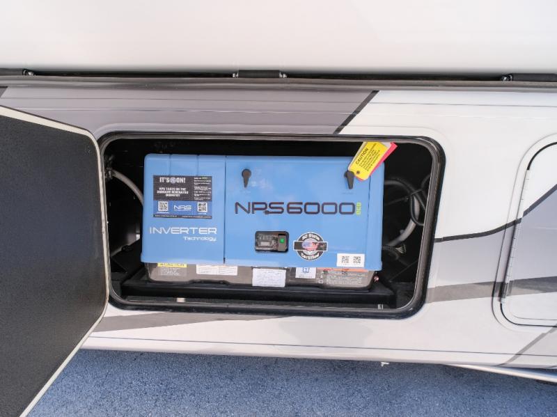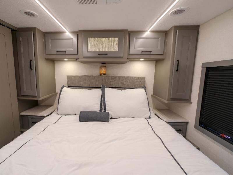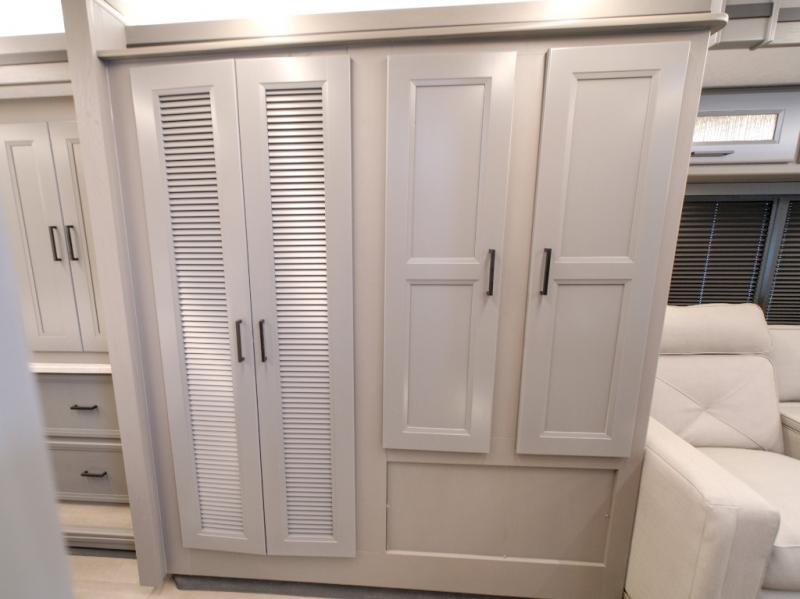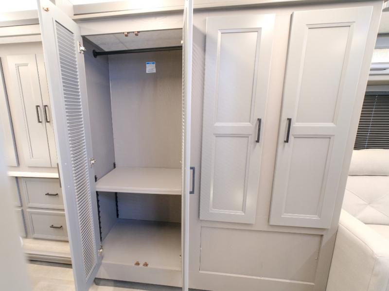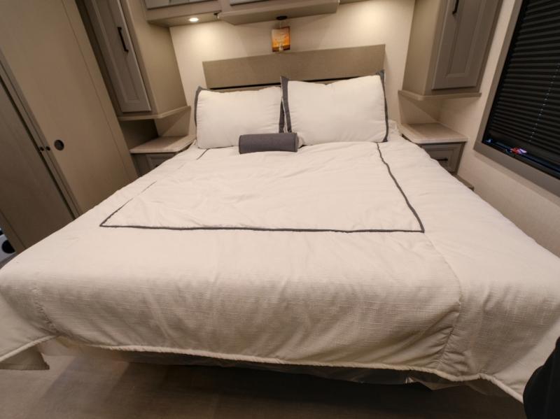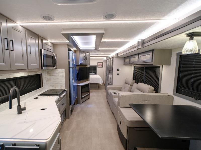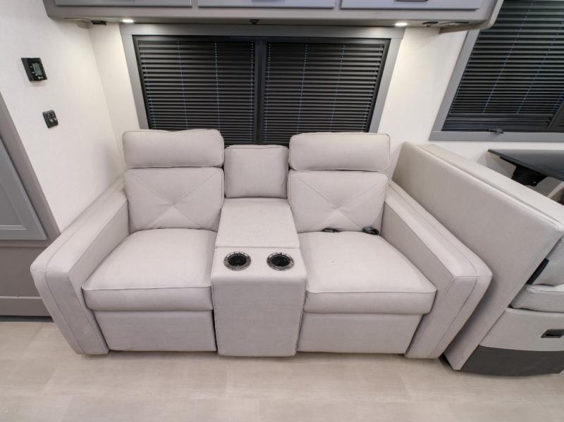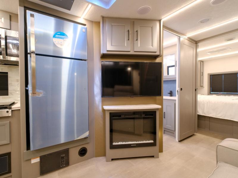 This motorhome perfectly blends comfort, style, and freedom for unforgettable adventures. The rear bedroom offers a 70 x 74 king bed, LED TV, generous wardrobe storage, overhead cabinets, and a sleek design. Additionally, this motorhome features a full bathroom, stackable washer/dryer prep, and linen/pantry storage, ideal for extended trips and comfortable for the whole family. The kitchen boasts a residential-sized refrigerator, microwave, overhead cabinets, a three-burner cooktop, and a spacious 76” dinette perfect for enjoying meals with family and friends. Plus, outdoor kitchen for al fresco dining. Cook, dine, and entertain with ease, wherever the road takes you. Finally, enjoy quality time with family and friends in the incredible living room equipped with a 40” LED TV, a warm fireplace, and theater seats ideal for relaxation.