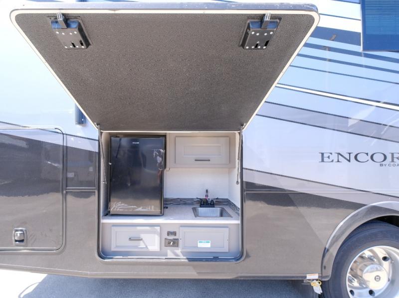 Each one of these Coachmen RV Encore Class A gas motorhomes have been engineered for maximum comfort! A Ford F53 chassis holds them together and a 7.3L V8 engine powers them to each destination. Both the crowned, laminated fiberglass roof and the high gloss gelcoat sidewalls come with Azdel superlite composite to prevent your unit from rotting away. Automatic leveling jacks make for an easy and quick set up when you arrive. You will appreciate having an exterior propane hookup and the pass-through full basement storage area has plenty of space for all of your outdoor gear, plus the radius trunk doors come with slam latch. With high definition back up and side cameras, you can travel with peace of mind. Come find your favorite one today!