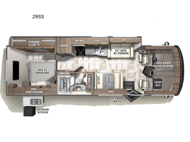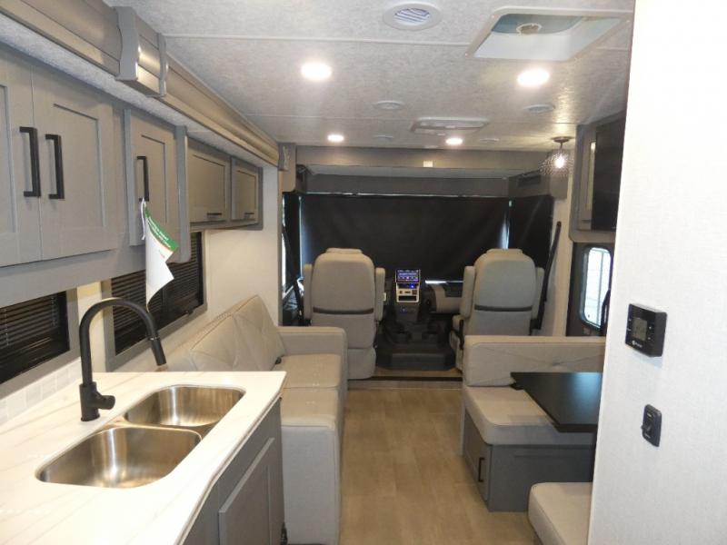 You will be impressed with all that this motorhome has to offer! Starting with the exterior kitchen with a double sink to make for easy clean up, and the exterior LED TV so you can watch your favorite show as you cook. The rear private bedroom will have you feeling right at home providing a 60" x 74" queen bed that has a CPAP station above it, and opposite the bed wardrobes on either side of the LED TV and storage space. There is a broom closet for your convenience just outside the full bathroom which features a 38" x 24" shower with skylight for more head room and natural lighting. The fully equipped kitchen has everything you need to prepare your meals including a stainless steel microwave oven, and you can enjoy dining at the 30" x 70" booth dinette. Relax and enjoy a great book while sitting on the 63" sofa with storage below for extra games or a cozy blanket!