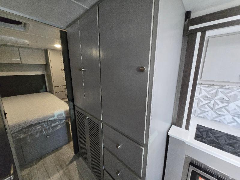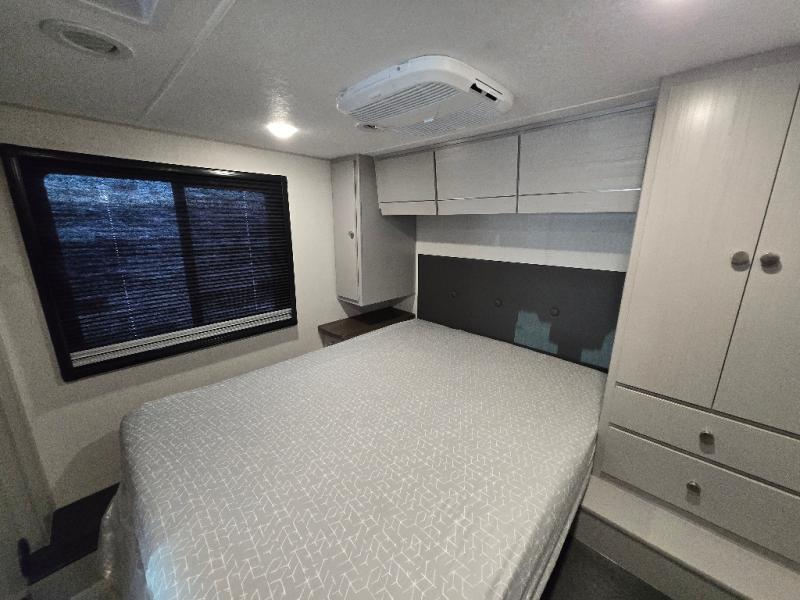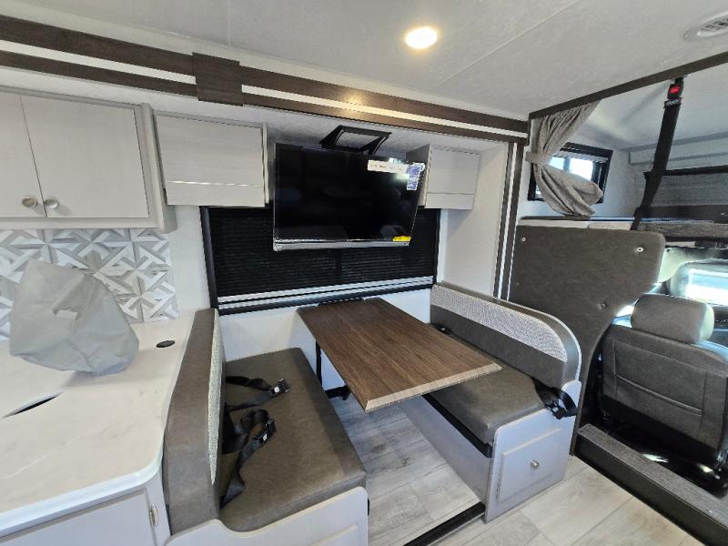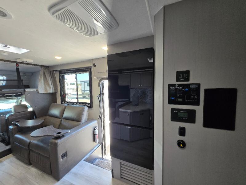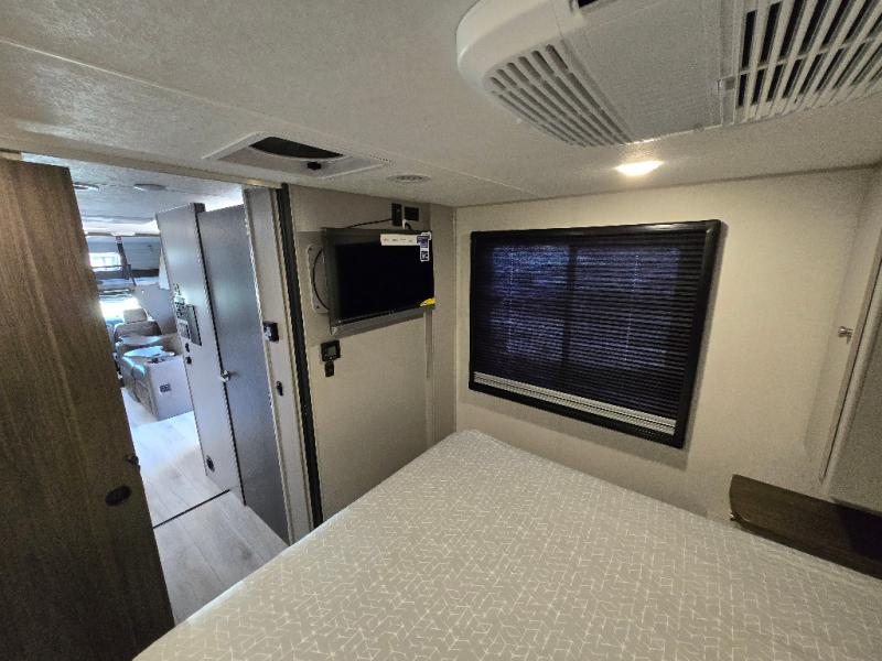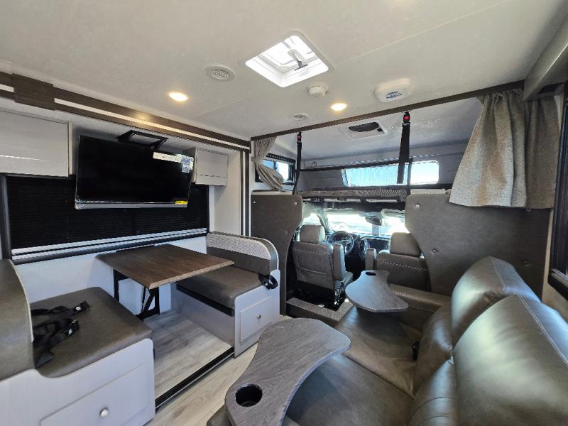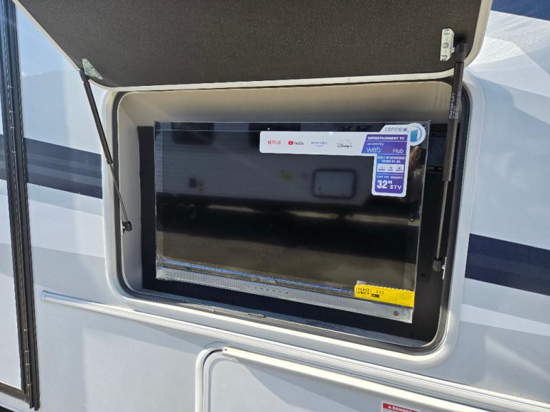 Pack your bags and head across the state in this durable coach. You can sleep five to six each night between the queen bed in the rear bedroom, the cab-over bunk, plus the booth dinette that will convert to sleeping space. The power recliners are sure to bring comfort after a day of traveling, or you can head outdoors to enjoy the outside TV and exterior grill table. When you get hungry, you can make lunch on the induction cooktop or in the convection microwave, and there is a 10 cu. ft. 12V double door refrigerator to keep your cold items fresh. A full bath is ready for you when you want to freshen up, and you'll find a wardrobe right across from the bath to keep clothes and linens ready to use. And the washer and dryer combo prep gives you the option to add these appliances if you choose!