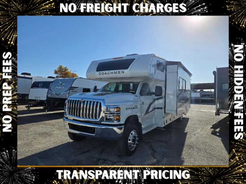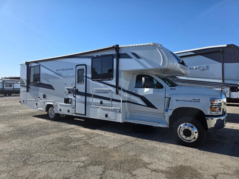 The Entourage is Coachmen's first super C diesel motorhome and it is packed with upscale appointments and solid construction so you can enjoy the RV lifestyle for years to come. This coach features a 4x4 diesel chassis (either a Chevy Silverado 5500 with a V8 6.6L diesel engine, or International CV chassis, depending on the model you choose), plus 50 amp service and a 2,000 watt inverter for all your power needs. The mandatory Icon Package includes a porcelain macerator toilet, auto generator start with dual batteries, 50 amp service, a tankless water heater, and more!