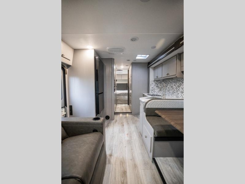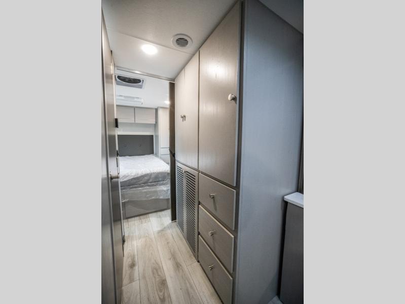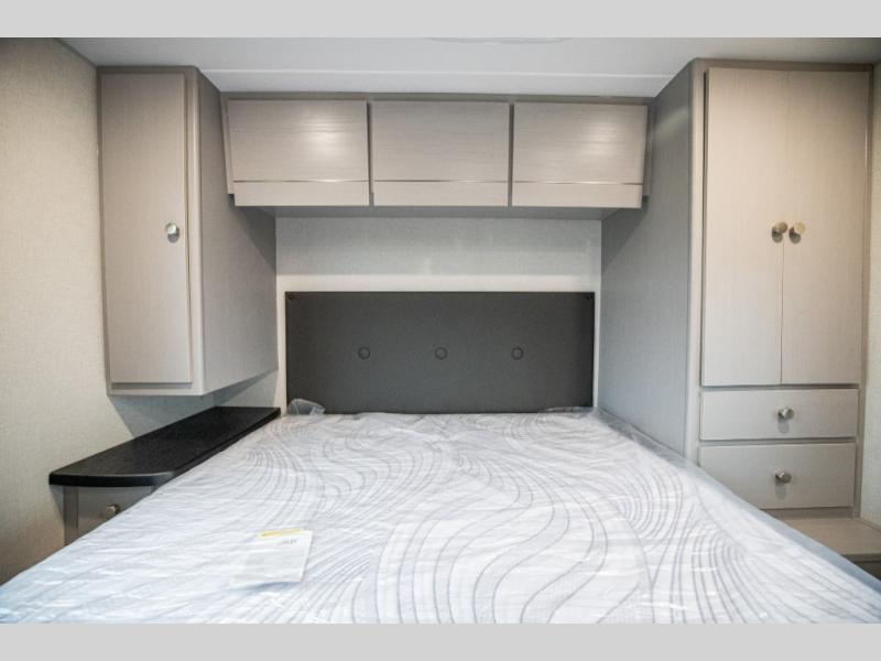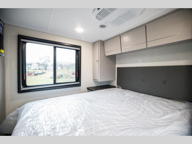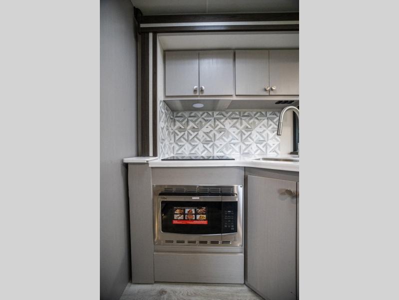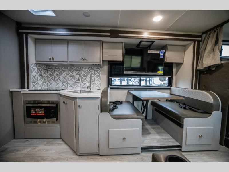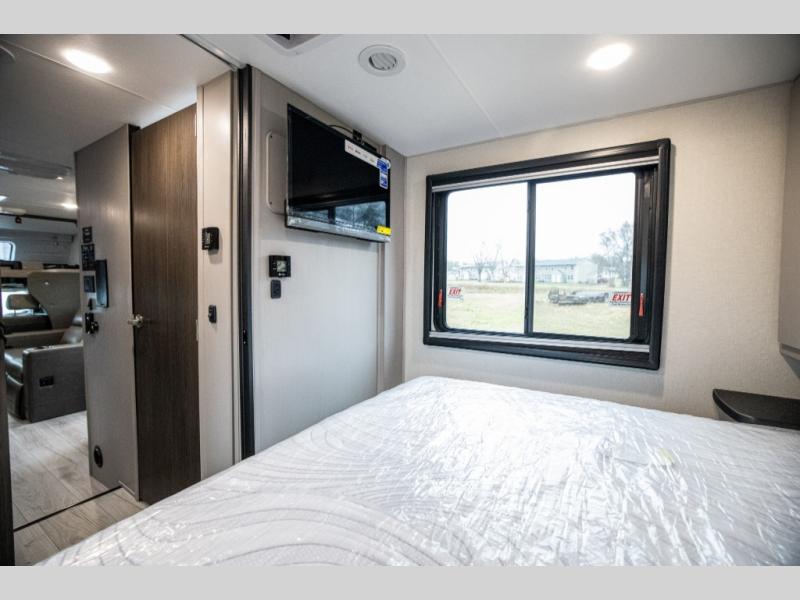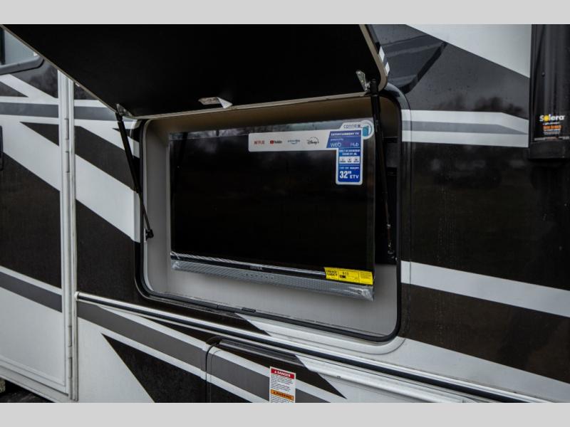 Pack your bags and head across the state in this durable coach. You can sleep five to six each night between the queen bed in the rear bedroom, the cab-over bunk, plus the booth dinette that will convert to sleeping space. The power recliners are sure to bring comfort after a day of traveling, or you can head outdoors to enjoy the outside TV and exterior grill table. When you get hungry, you can make lunch on the induction cooktop or in the convection microwave, and there is a 10 cu. ft. 12V double door refrigerator to keep your cold items fresh. A full bath is ready for you when you want to freshen up, and you'll find a wardrobe right across from the bath to keep clothes and linens ready to use. And the washer and dryer combo prep gives you the option to add these appliances if you choose!