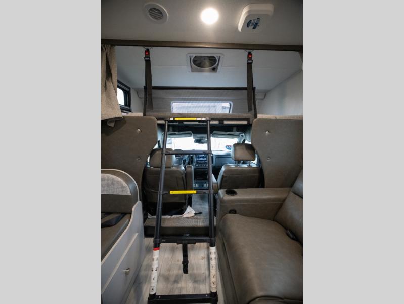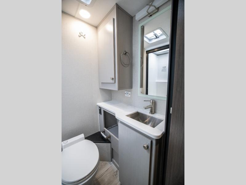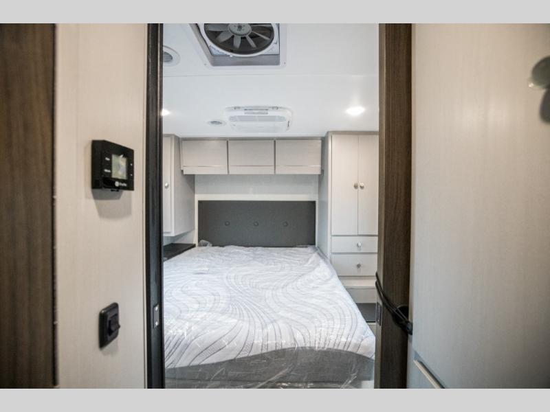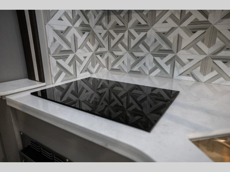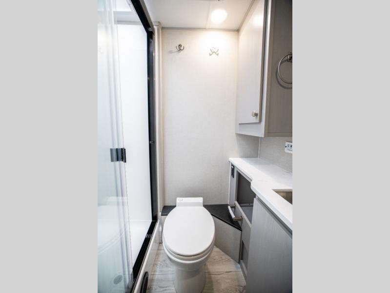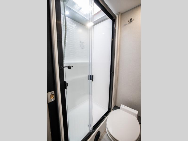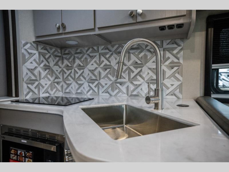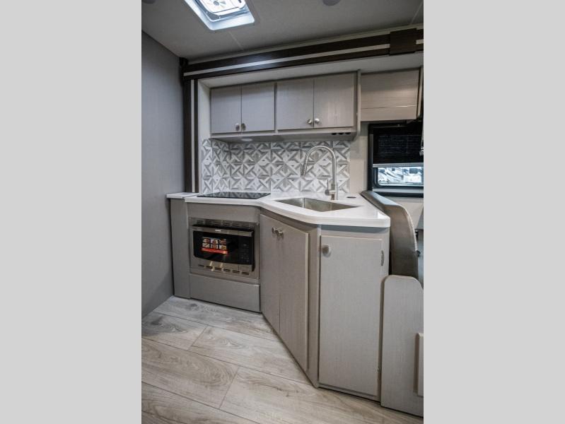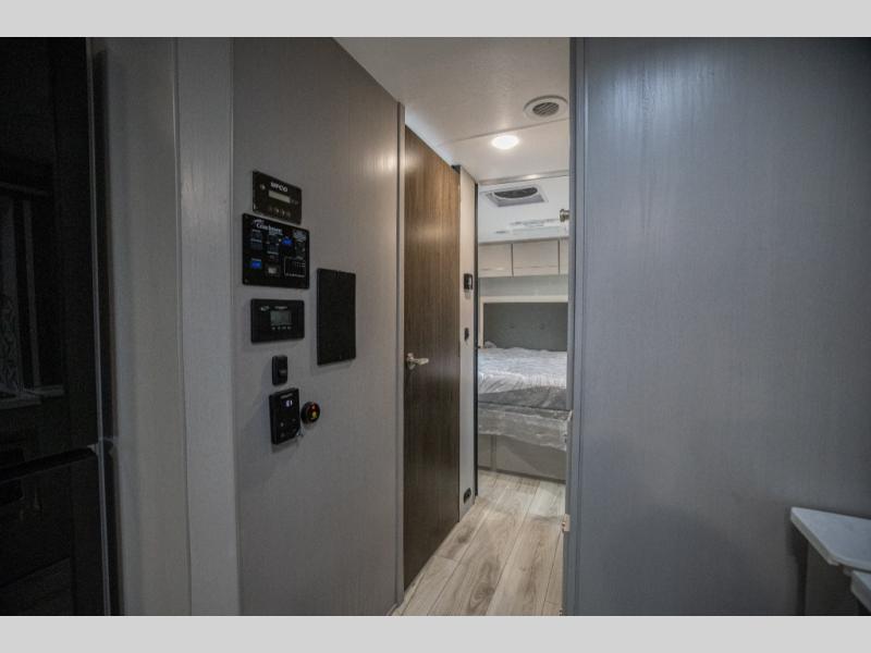Pack your bags and head across the state in this durable coach. You can sleep five to six each night between the queen bed in the rear bedroom, the cab-over bunk, plus the booth dinette that will convert to sleeping space. The power recliners are sure to bring comfort after a day of traveling, or you can head outdoors to enjoy the outside TV and exterior grill table. When you get hungry, you can make lunch on the induction cooktop or in the convection microwave, and there is a 10 cu. ft. 12V double door refrigerator to keep your cold items fresh. A full bath is ready for you when you want to freshen up, and you'll find a wardrobe right across from the bath to keep clothes and linens ready to use. And the washer and dryer combo prep gives you the option to add these appliances if you choose!