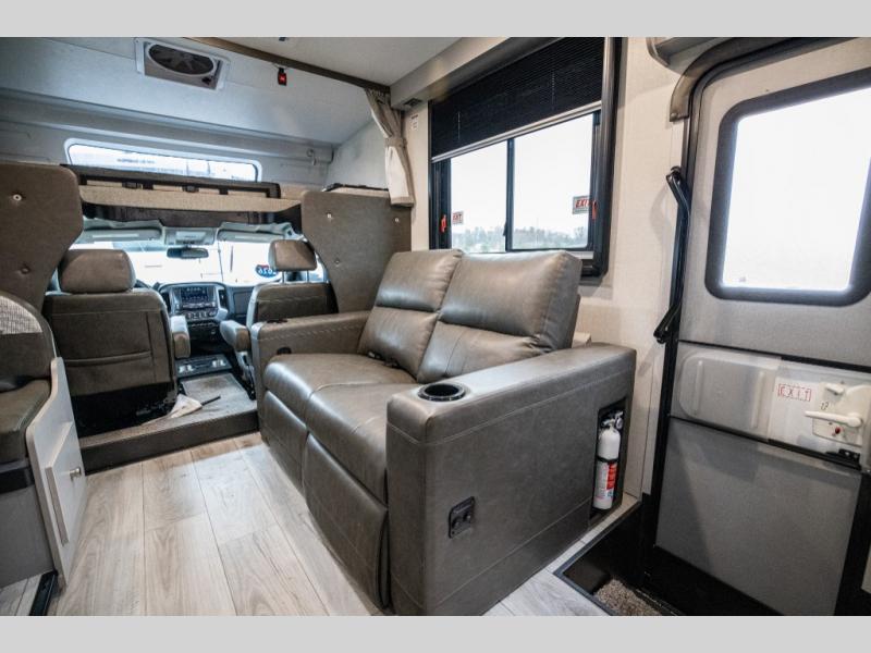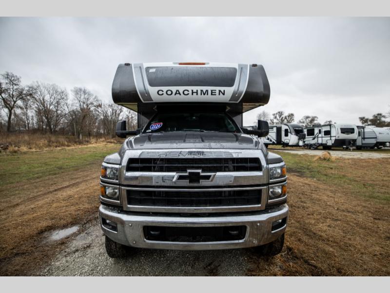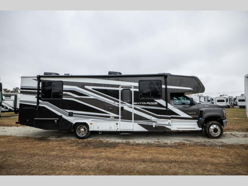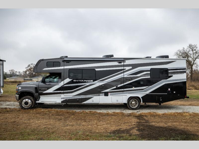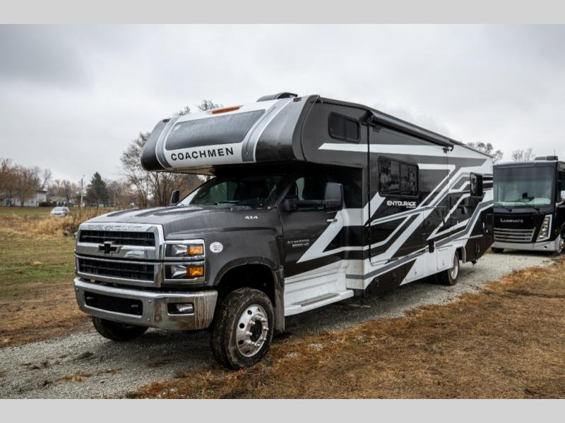 The Entourage is Coachmen's first super C diesel motorhome and it is packed with upscale appointments and solid construction so you can enjoy the RV lifestyle for years to come. This coach features a 4x4 diesel chassis (either a Chevy Silverado 5500 with a V8 6.6L diesel engine, or International CV chassis, depending on the model you choose), plus 50 amp service and a 2,000 watt inverter for all your power needs. The mandatory Icon Package includes a porcelain macerator toilet, auto generator start with dual batteries, 50 amp service, a tankless water heater, and more!