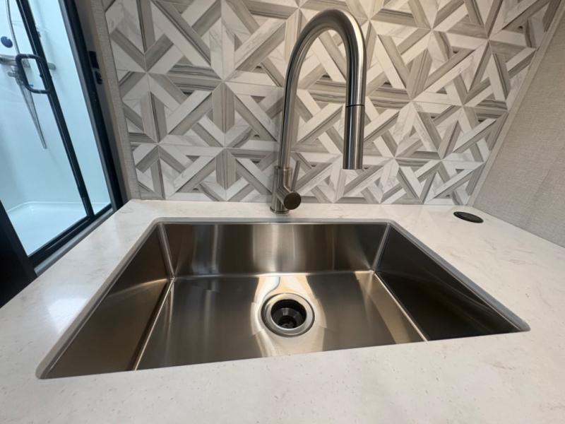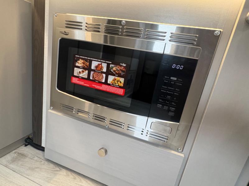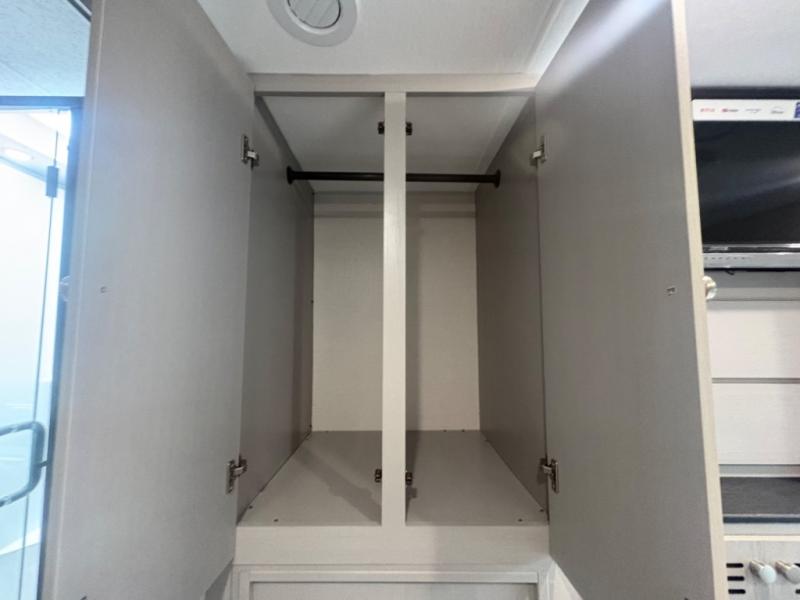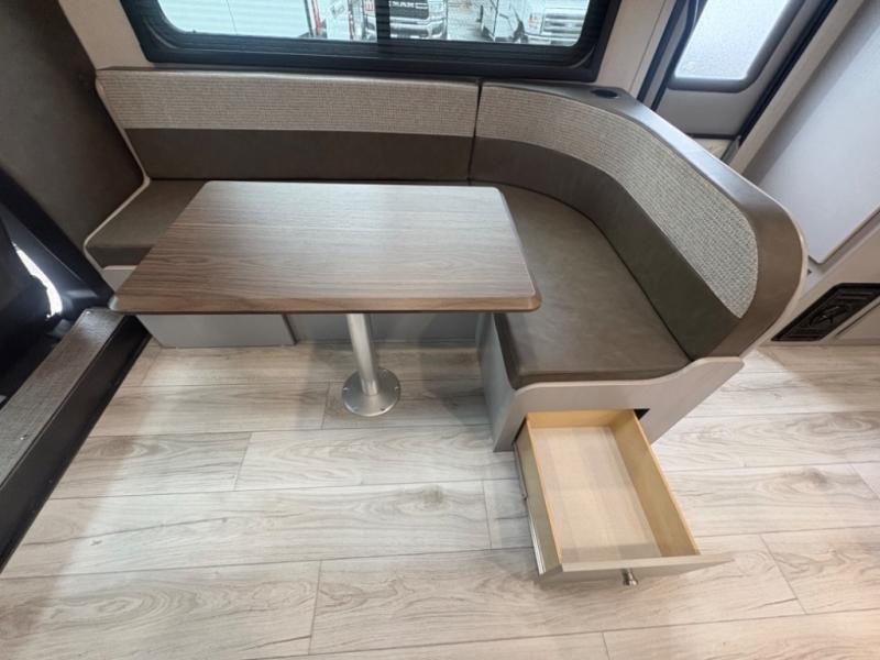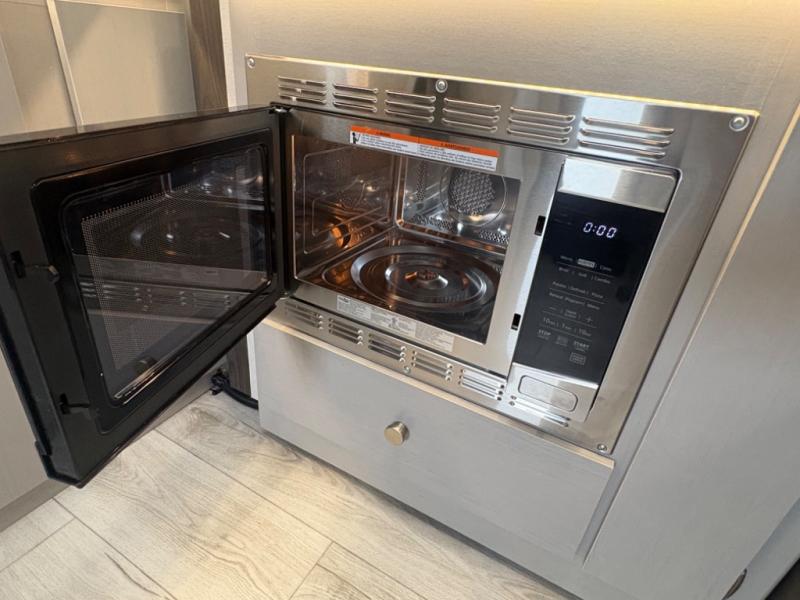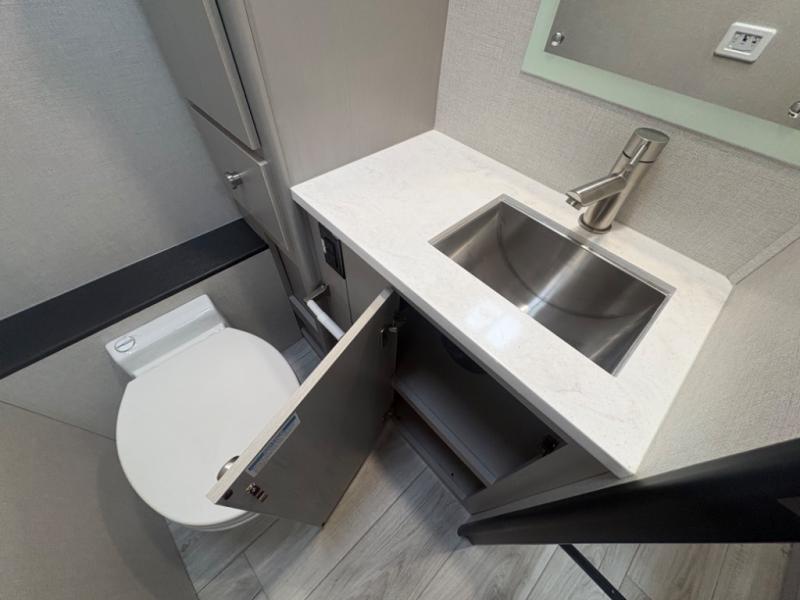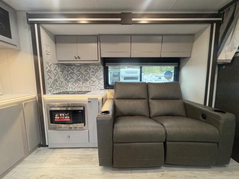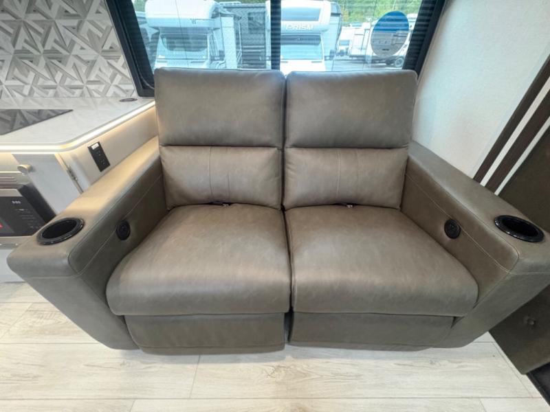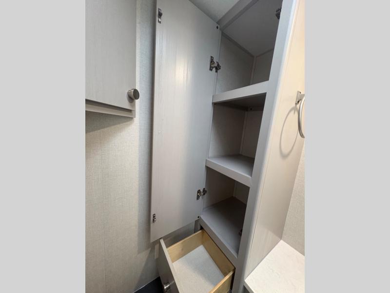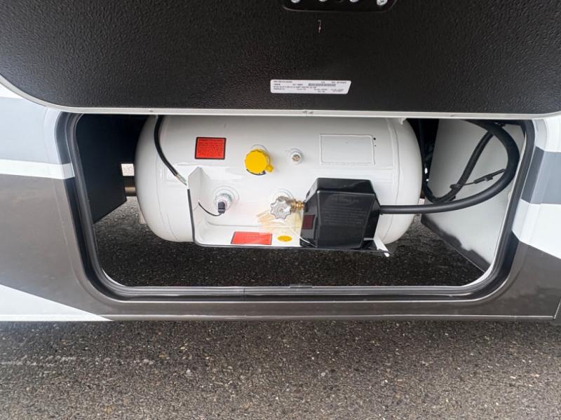 This coach will meet your every need, whether you're a weekend warrior or full-time RVer. Once you arrive at the campground, make a quick lunch on the cooktop or in the convection microwave, and the countertop extension will provide more space to prep fresh veggies. There is a refrigerator and a pantry to store food for the week, plus overhead cabinets for spices and dishes. After lunch is cleaned up, you can relax around the J-lounge with a pedestal table and an extension to sit more people. There is also a slide with theater seating for more seating space This coach features a split-style bath with an independent shower and a private toilet and sink right across the hall so two people can freshen up at once. The rear private bedroom includes a power inclining king bed, dual wardrobes, a TV, plus washer and dryer prep to make wash day easier than ever.
