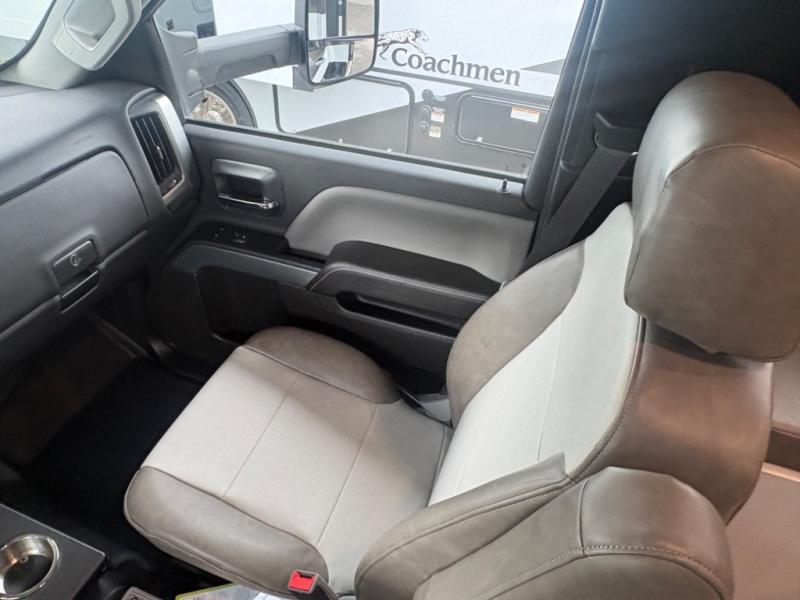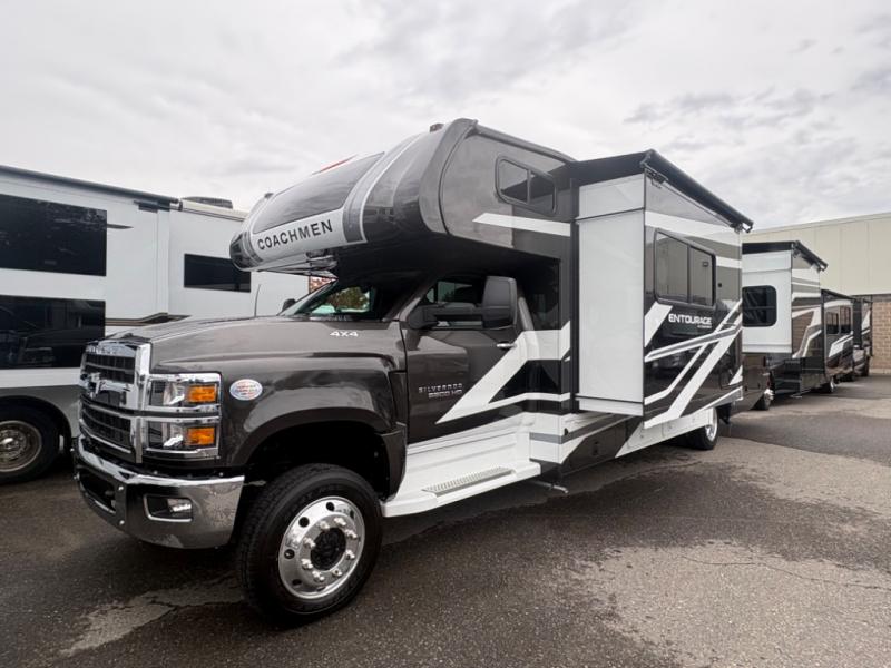 The Entourage is Coachmen's first super C diesel motorhome and it is packed with upscale appointments and solid construction so you can enjoy the RV lifestyle for years to come. This coach features a 4x4 diesel chassis (either a Chevy Silverado 5500 with a V8 6.6L diesel engine, or International CV chassis, depending on the model you choose), plus 50 amp service and a 2,000 watt inverter for all your power needs. The mandatory Icon Package includes a porcelain macerator toilet, auto generator start with dual batteries, 50 amp service, a tankless water heater, and more!