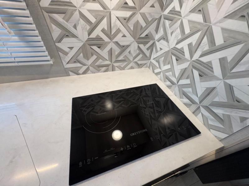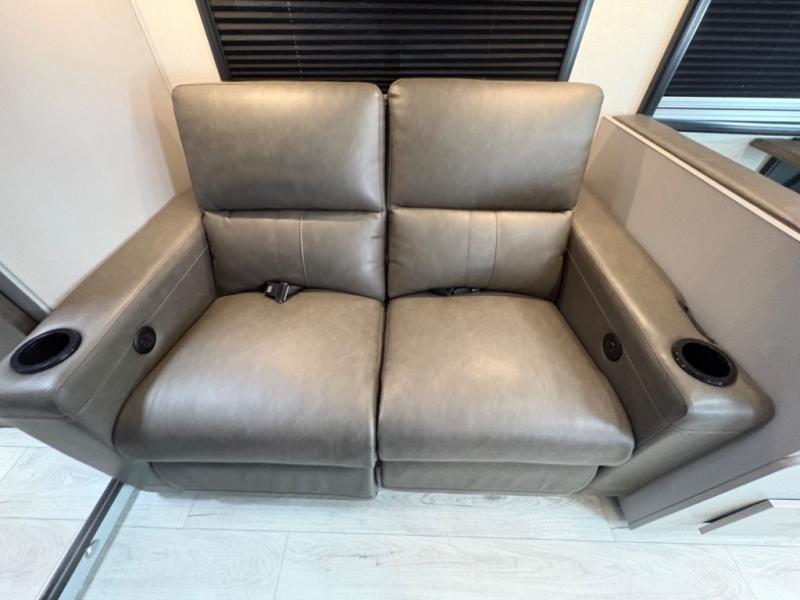 Upscale interior with solid-surface countertops, induction cooktop, residential refrigerator, tankless water heater, and power reclining theater seats.