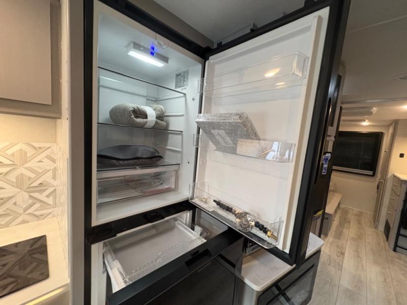 Outdoor living is elevated with a 15-foot power awning with LED lighting, exterior kitchen/entertainment center, and massive pass-through storage.
