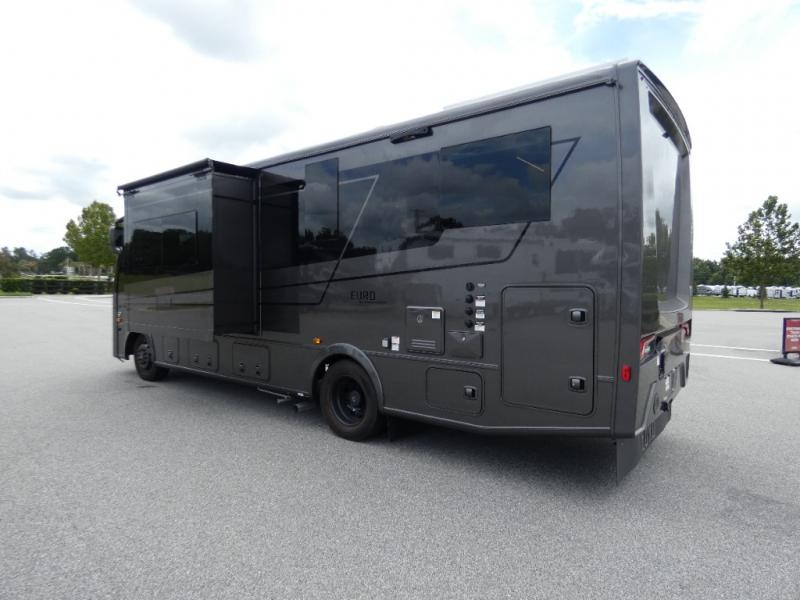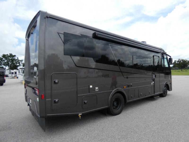 Enjoy the compact and stylish look of a European coach with the Euro Class A gas motorhome by Coachmen RV! There is a crowned, laminated fiberglass roof, a fiberglass front cap, plus a Ford F53 7.3L V8 chassis that will add to the life of your RV. The driver will love having a back up monitor with side view cameras, and the passenger can use the computer workstation to work remotely if needed. There is also traction control, cruise control, plus a tilt and telescoping steering wheel that will make the drive that much easier. An exterior propane hook-up also comes standard, along with radius trunk doors for your gear, and automatic leveling jacks to be set up in no-time. Head inside to find modern features, like the stainless steel appliances, square windows with day/night shades, and the list goes on!