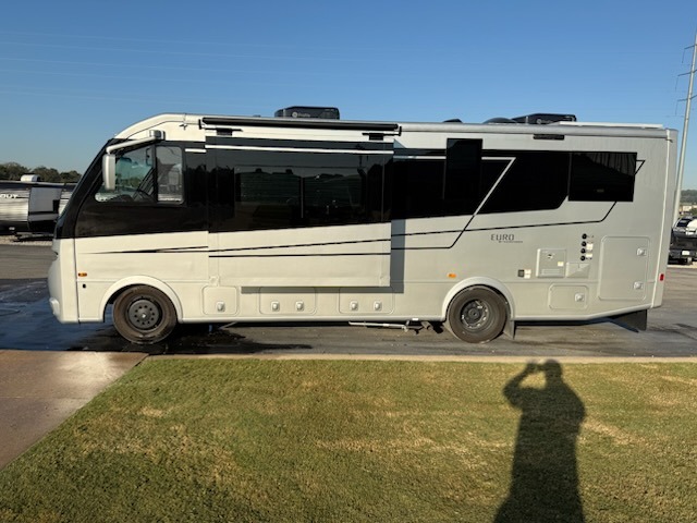 Enjoy the compact and stylish look of a European coach with the Euro Class A gas motorhome by Coachmen RV! There is a crowned, laminated fiberglass roof, a fiberglass front cap, plus a Ford F53 7.3L V8 chassis that will add to the life of your RV. The driver will love having a back up monitor with side view cameras, and the passenger can use the computer workstation to work remotely if needed. There is also traction control, cruise control, plus a tilt and telescoping steering wheel that will make the drive that much easier. An exterior propane hook-up also comes standard, along with radius trunk doors for your gear, and automatic leveling jacks to be set up in no-time. Head inside to find modern features, like the stainless steel appliances, square windows with day/night shades, and the list goes on!