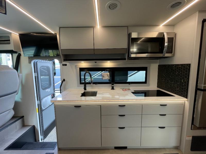 You're sure to have a great time in this sleek motorhome for two! Once you arrive at your destination, the reclining/swivel captain's seats can become a part of the living room where you'll also find a slide out with recliners/dinette. And if you're needing more sleeping space, just choose the optional sofa with a sleeper in place of the dinette! You can then make lunch on the induction cooktop and grab a cold drink from the stainless steel double door refrigerator. The full bath includes a glass shower door, an on-demand water heater, and a shower skylight to let natural light in. Head to the rear bedroom where you can get a great night's rest on the two twin beds with a nightstand in between to set your phone and book on. There is also a 32" bedroom TV so you can watch movies in bed!