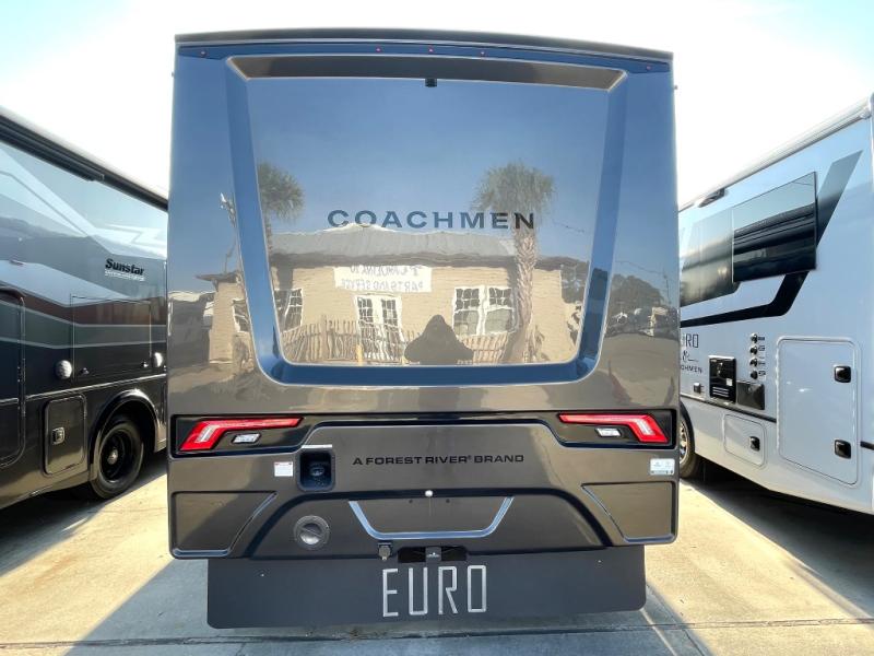 Enjoy the compact and stylish look of a European coach with the Euro Class A gas motorhome by Coachmen RV! There is a crowned, laminated fiberglass roof, a fiberglass front cap, plus a Ford F53 7.3L V8 chassis that will add to the life of your RV. The driver will love having a back up monitor with side view cameras, and the passenger can use the computer workstation to work remotely if needed. There is also traction control, cruise control, plus a tilt and telescoping steering wheel that will make the drive that much easier. An exterior propane hook-up also comes standard, along with radius trunk doors for your gear, and automatic leveling jacks to be set up in no-time. Head inside to find modern features, like the stainless steel appliances, square windows with day/night shades, and the list goes on!