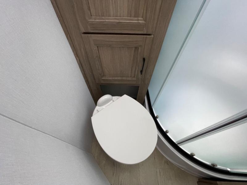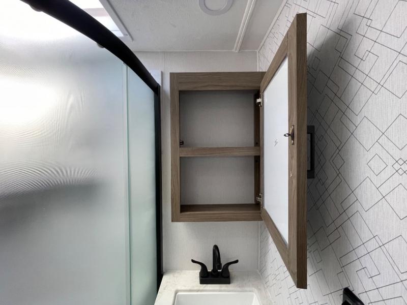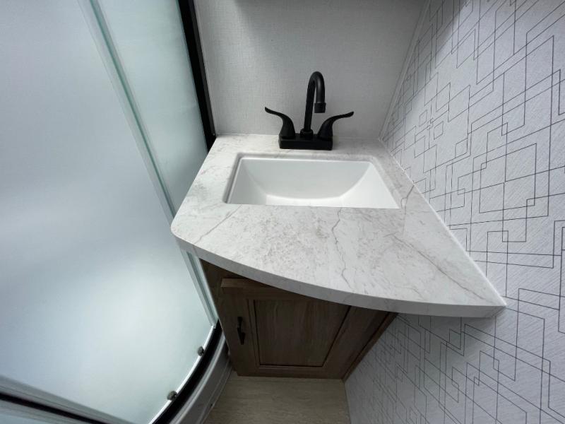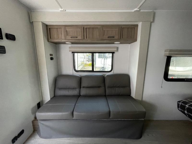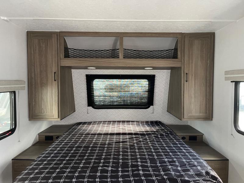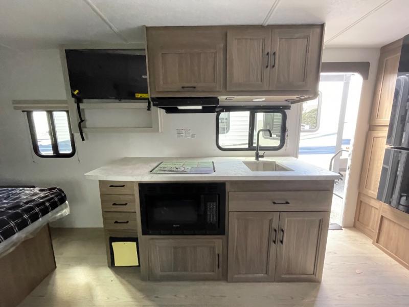 You'll love spending time at the campground in this single slide out travel trailer! The 60" x 80" front queen bed includes vaulted underbed storage to keep your luggage or extra blankets out of the way, plus there are dual bedside wardrobes for your clothes. A sofa with a free-standing table will provide a place to relax and dine, and the full kitchen includes a dual-burner cooktop and microwave to cook meals each day. This unit also features a rear corner bath with a 32" radius shower, a toilet, sink, and bath linen closet for clean towels!