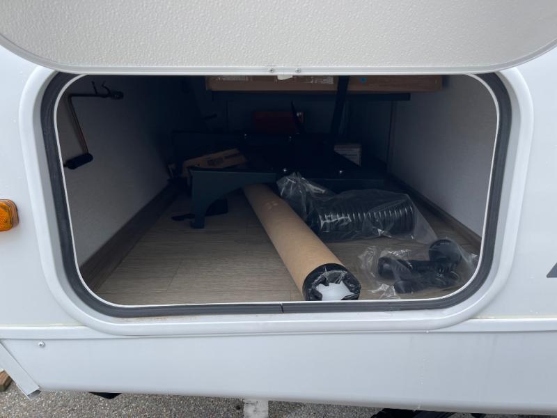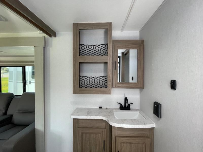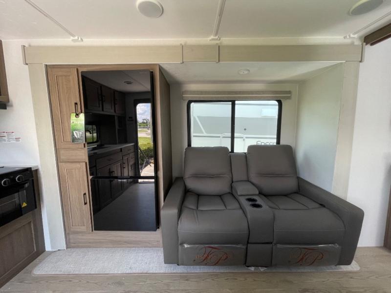 Check out this rear kitchen travel trailer that can sleep three to four each night. The front master bedroom includes a queen bed with vaulted under-bed storage for your belongings and dual wardrobes for even more storage. The theater seating within the large slide out and the booth dinette will provide comfortable seating space, and there is a Smart TV for those rainy camp days. This model also includes a three burner cooktop, a microwave oven, and an 8 cu. ft. double door refrigerator for your perishables. And don't forget about the power awning with LED lights!