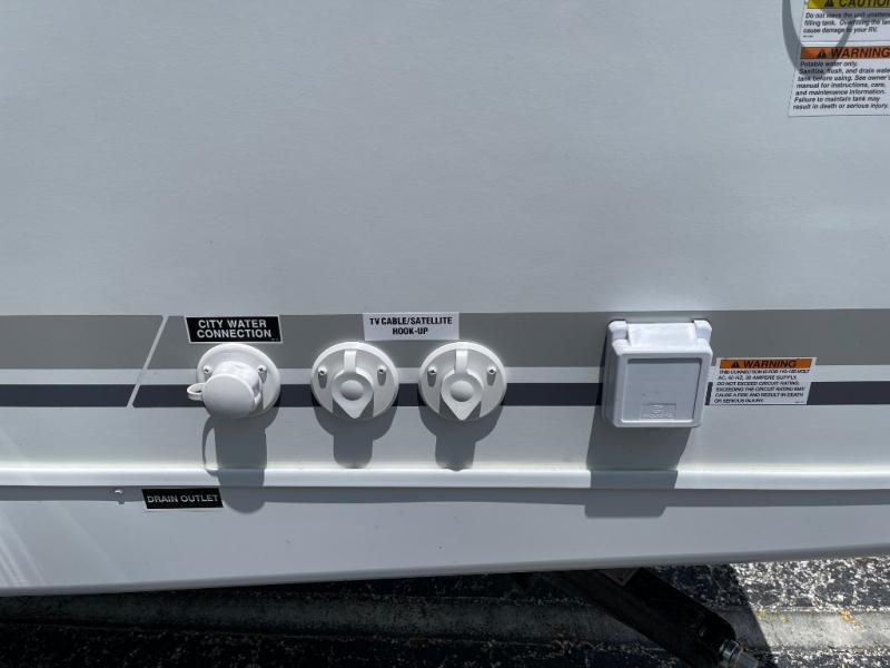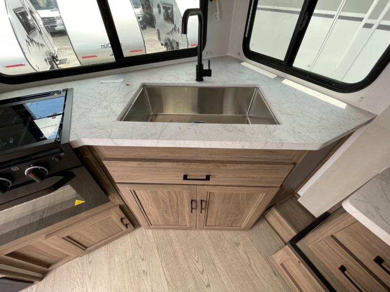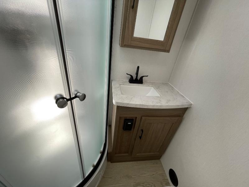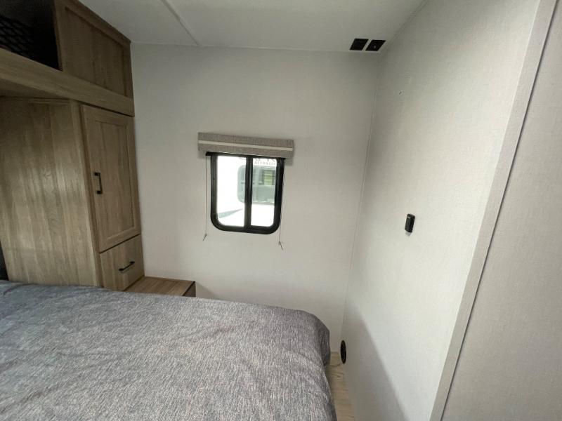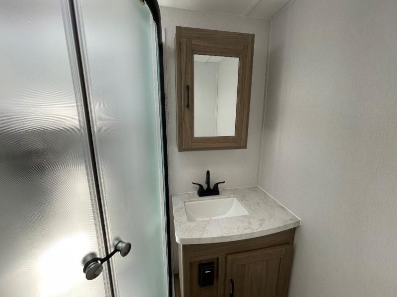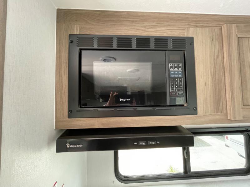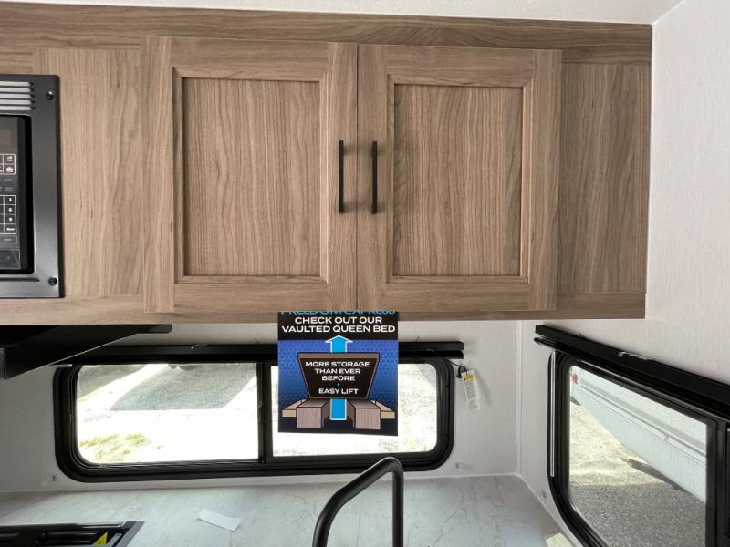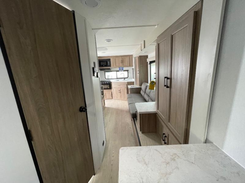 This travel trailer will feel a little more like home since there is a semi-private front bedroom with a queen bed, dual wardrobes, and a bedroom privacy curtain. On the opposite end, the rear kitchen will let you make meals each day on the dual-burner cooktop and microwave oven, plus there is a 12V refrigerator to keep food fresh. A large slide out includes a sofa, dual pantries with end tables, plus a wardrobe with a bench where you can pull your hiking boots off. And a booth dinette provides the perfect place to dine and play games together!