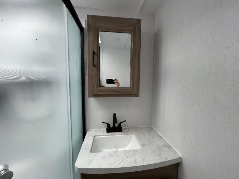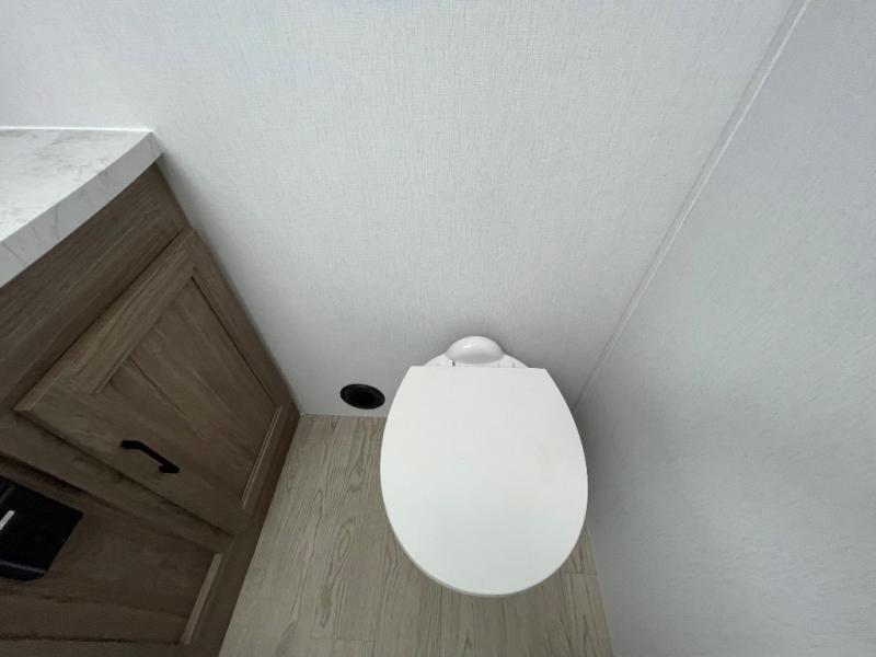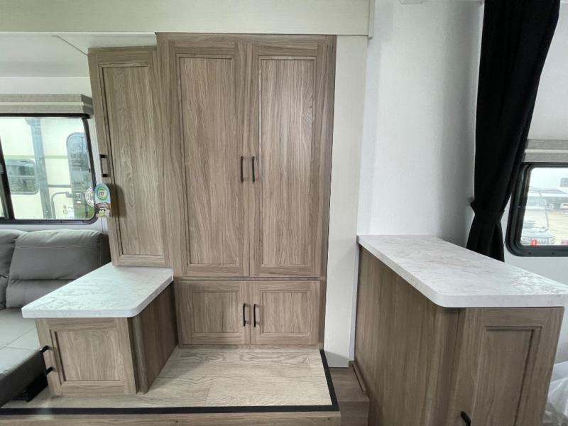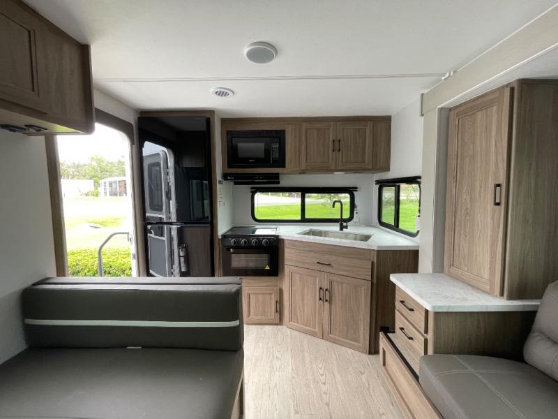 This travel trailer will feel a little more like home since there is a semi-private front bedroom with a queen bed, dual wardrobes, and a bedroom privacy curtain. On the opposite end, the rear kitchen will let you make meals each day on the dual-burner cooktop and microwave oven, plus there is a 12V refrigerator to keep food fresh. A large slide out includes a sofa, dual pantries with end tables, plus a wardrobe with a bench where you can pull your hiking boots off. And a booth dinette provides the perfect place to dine and play games together!