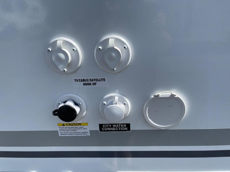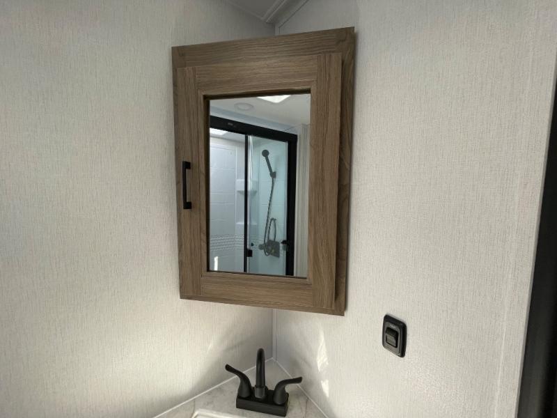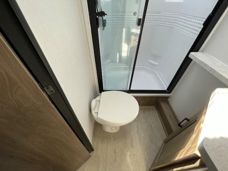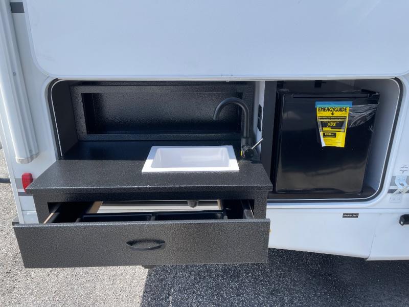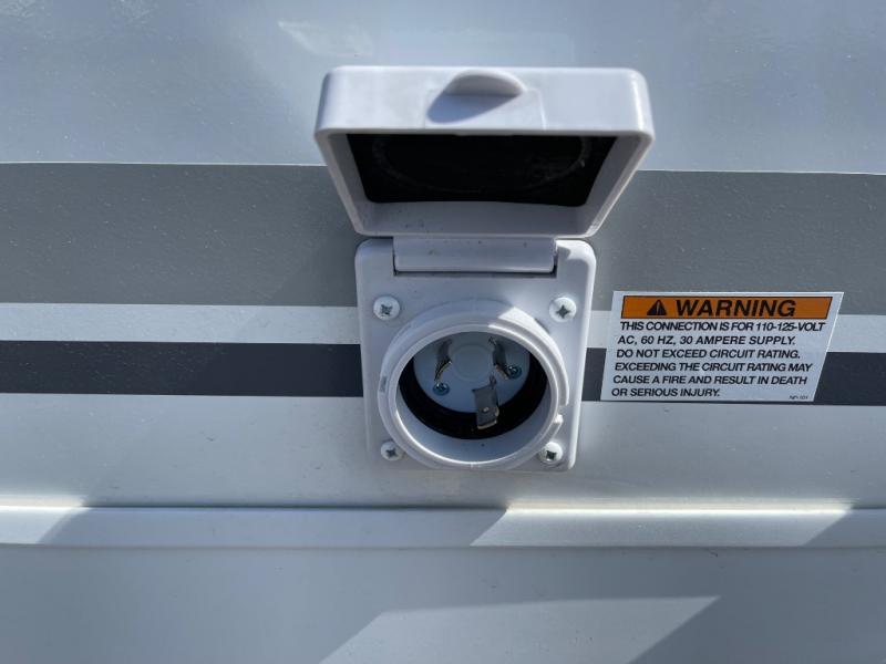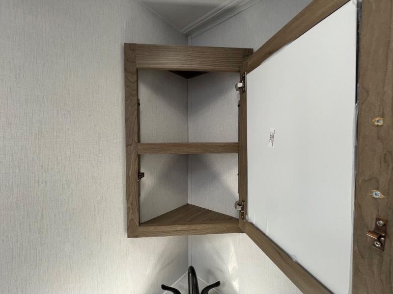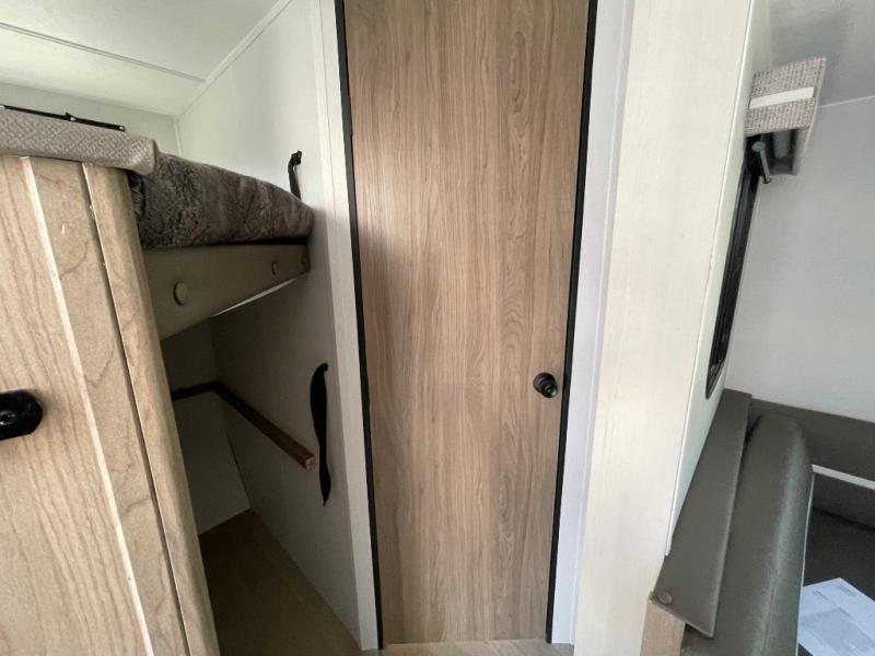This is a great unit for a larger family to enjoy! With double-size bunks in the rear campside corner you can easily sleep seven or eight in this unit depending on size. A large slide offers ample space in the main living area and it features a u-dinette and refrigerator. Opposite the slide behind the Smart TV there is a huge hinged hidden storage pantry! You can easily cook both inside and out with all the appliances inside to create delicious home cooked meals, plus an outside camp kitchen and griddle so you can cook in the great outdoors on a beautiful day. A rear corner bath features a shower, toilet, and corner vanity with sink, plus medicine cabinet for your things. In front, a private master bedroom with queen bed including wardrobes and inset shelves along the side of the head of the bed, plus overhead storage as well.