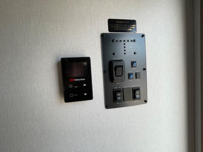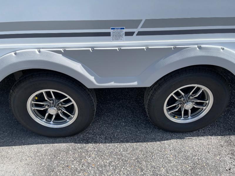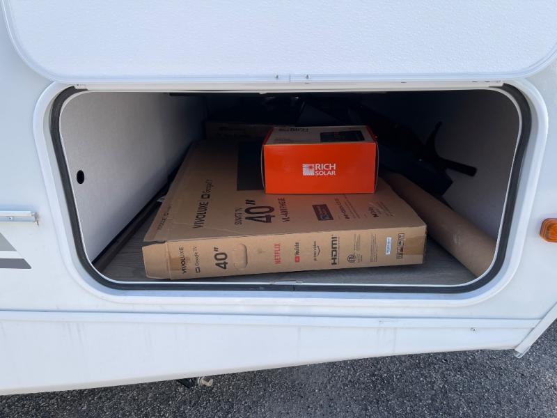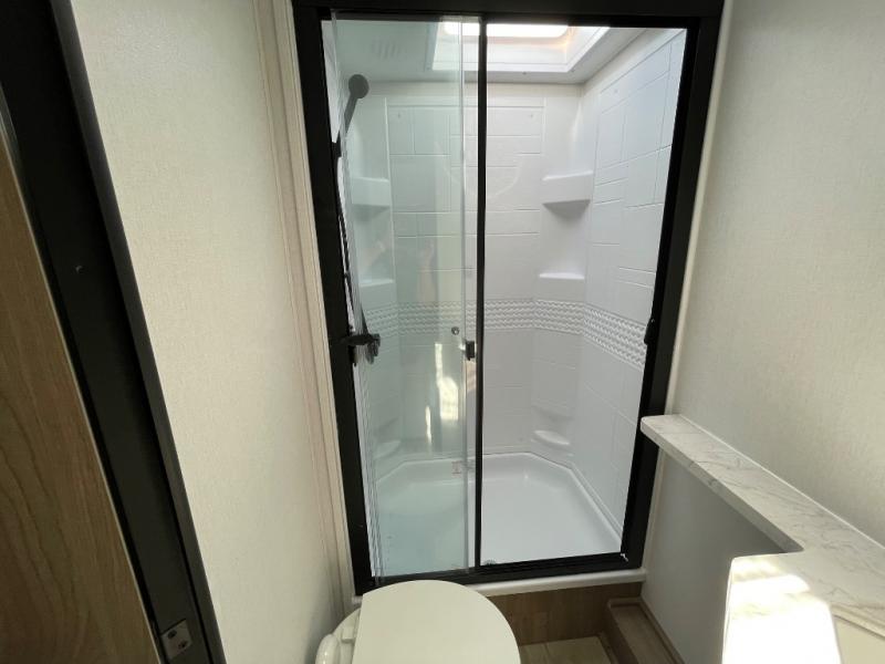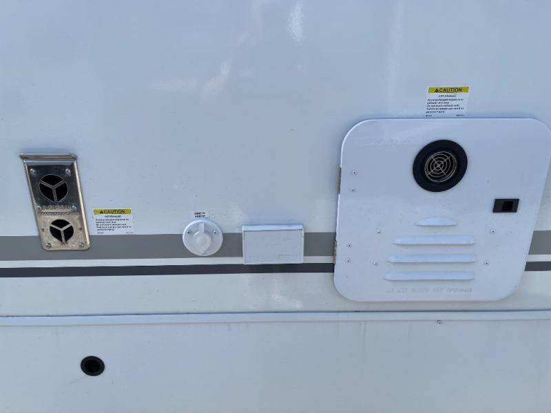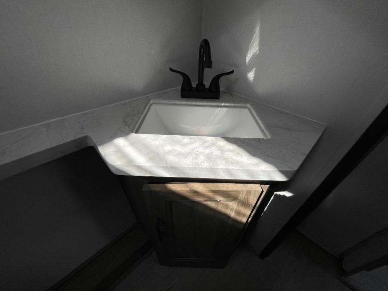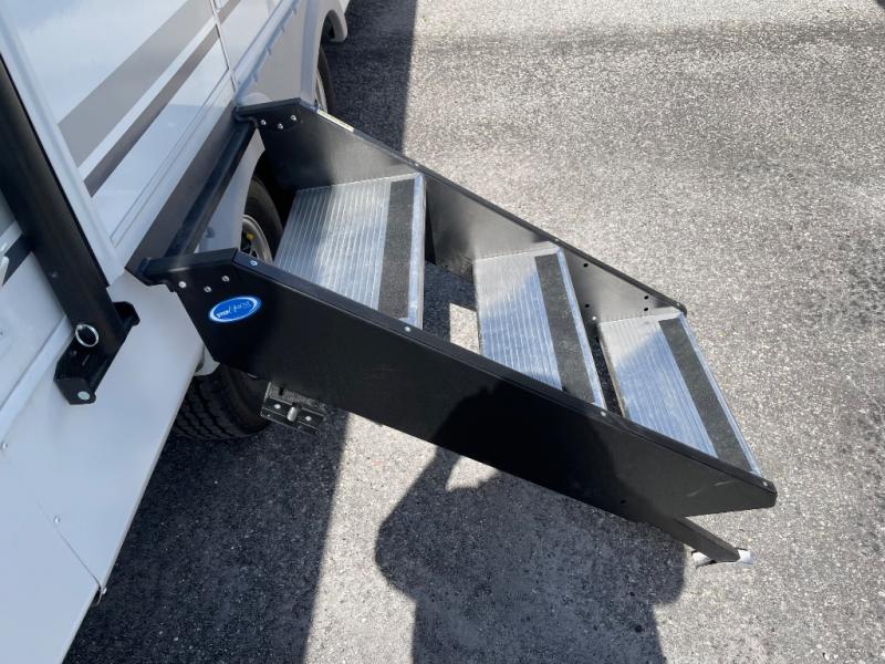 This is a great unit for a larger family to enjoy! With double-size bunks in the rear campside corner you can easily sleep seven or eight in this unit depending on size. A large slide offers ample space in the main living area and it features a u-dinette and refrigerator. Opposite the slide behind the Smart TV there is a huge hinged hidden storage pantry! You can easily cook both inside and out with all the appliances inside to create delicious home cooked meals, plus an outside camp kitchen and griddle so you can cook in the great outdoors on a beautiful day. A rear corner bath features a shower, toilet, and corner vanity with sink, plus medicine cabinet for your things. In front, a private master bedroom with queen bed including wardrobes and inset shelves along the side of the head of the bed, plus overhead storage as well.